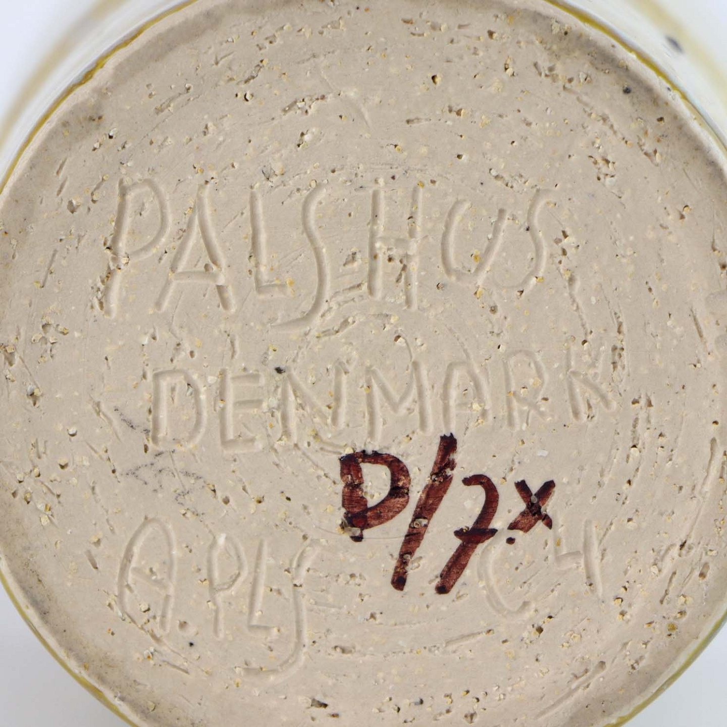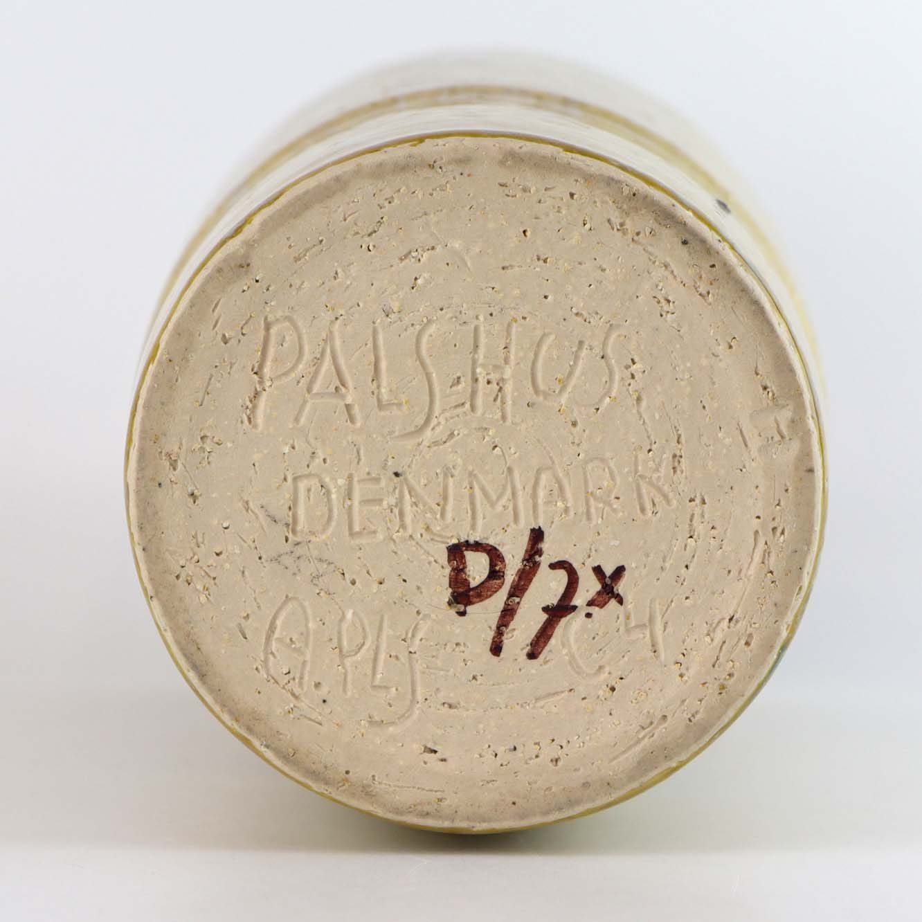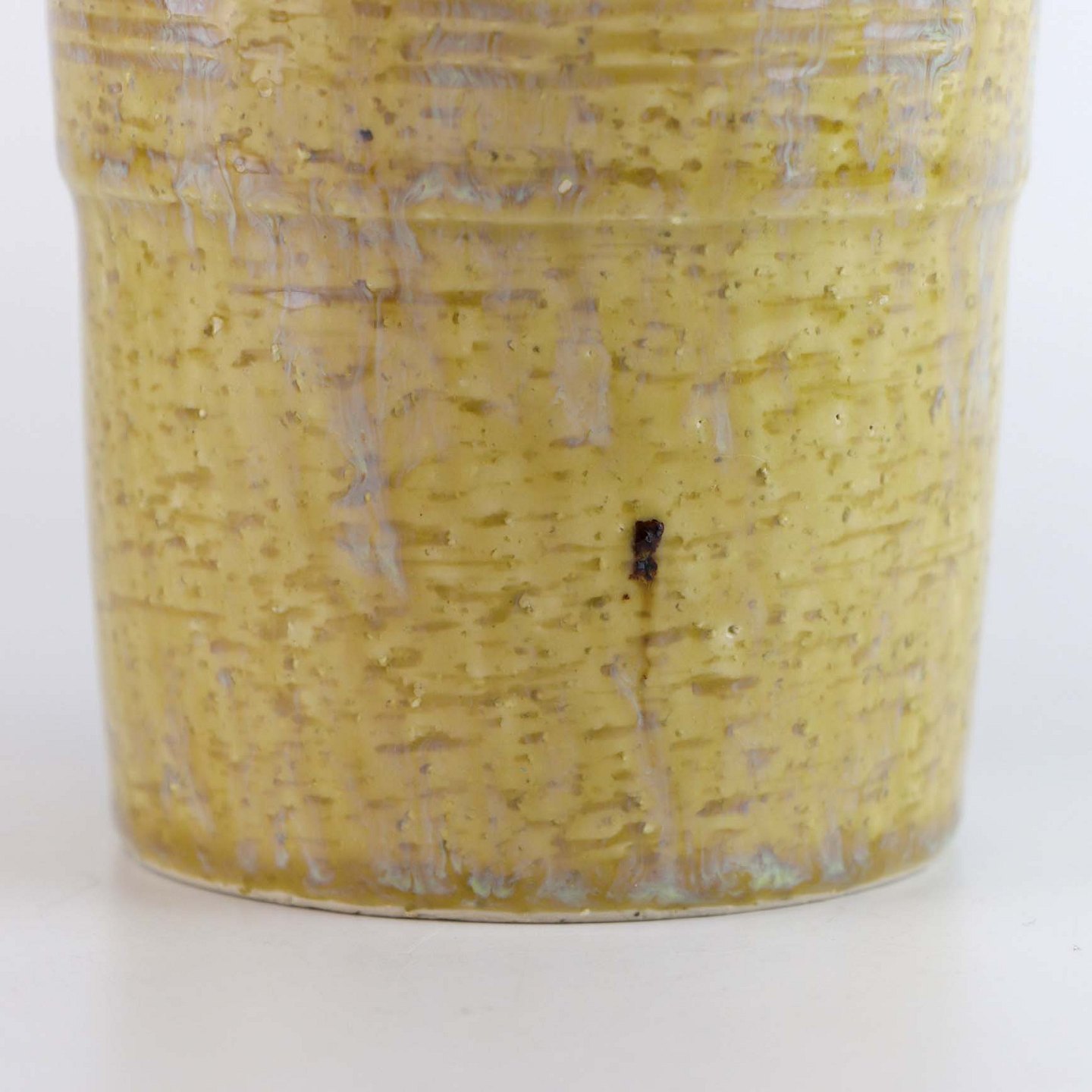 Cylinderformet vase i stentøj med gul glasur og let stribet mønster. Nr. C4