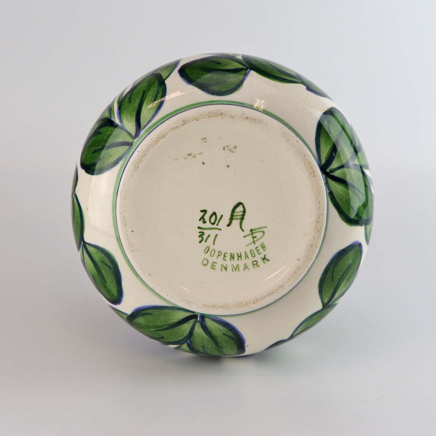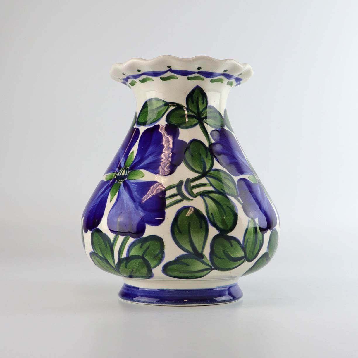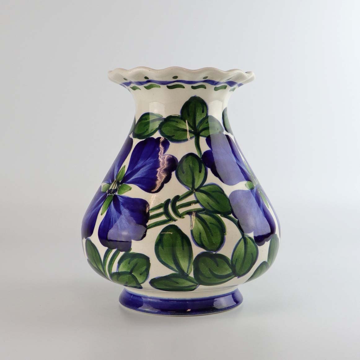 Vase i fajance dekoreret med blå blomster og grønne blade på hvid baggrund. Nr. 201/311