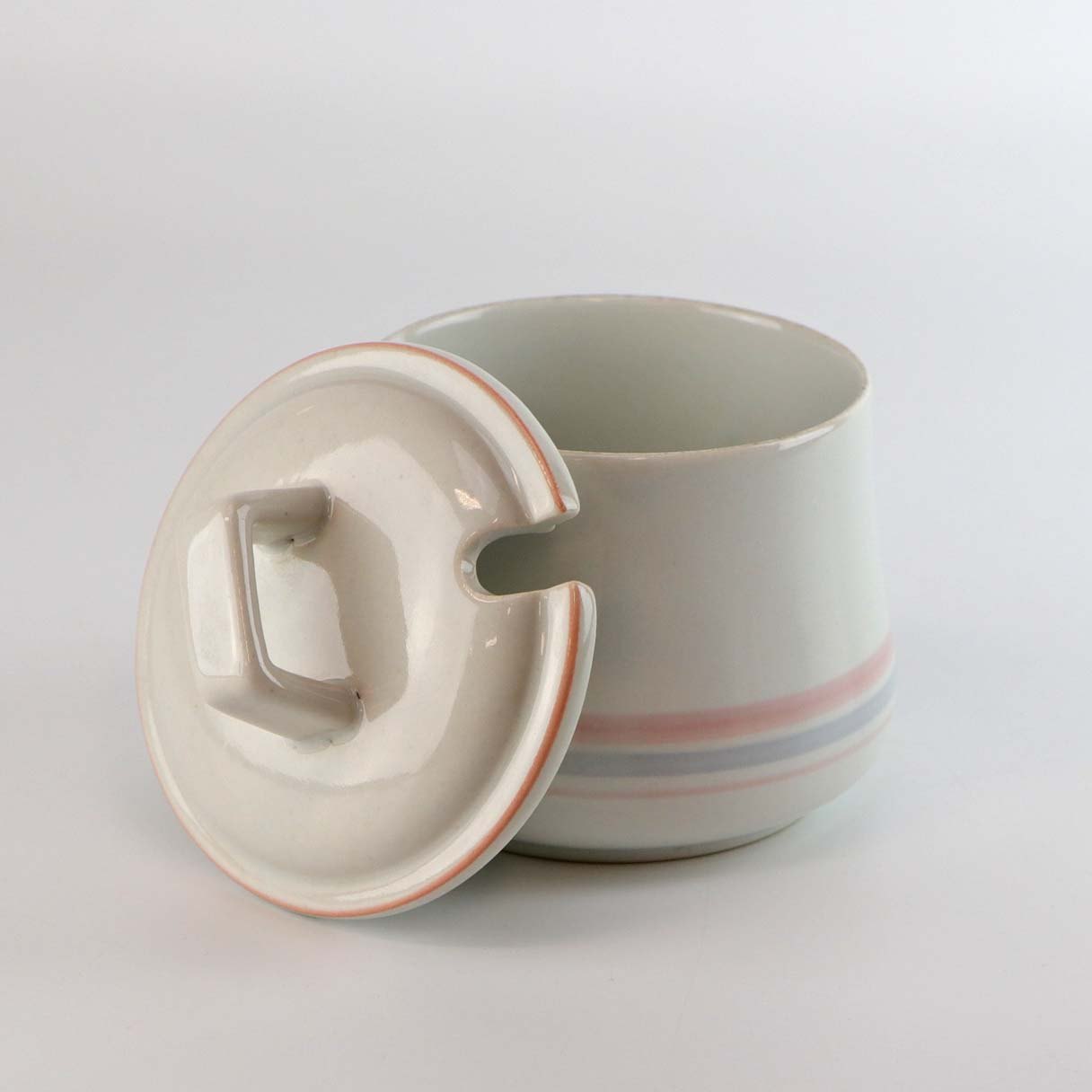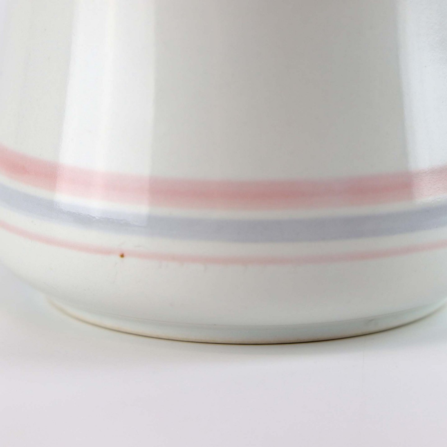 Siesta er fremstillet i lyst glaseret stentøj med lyserøde og lyseblå stribet mønster