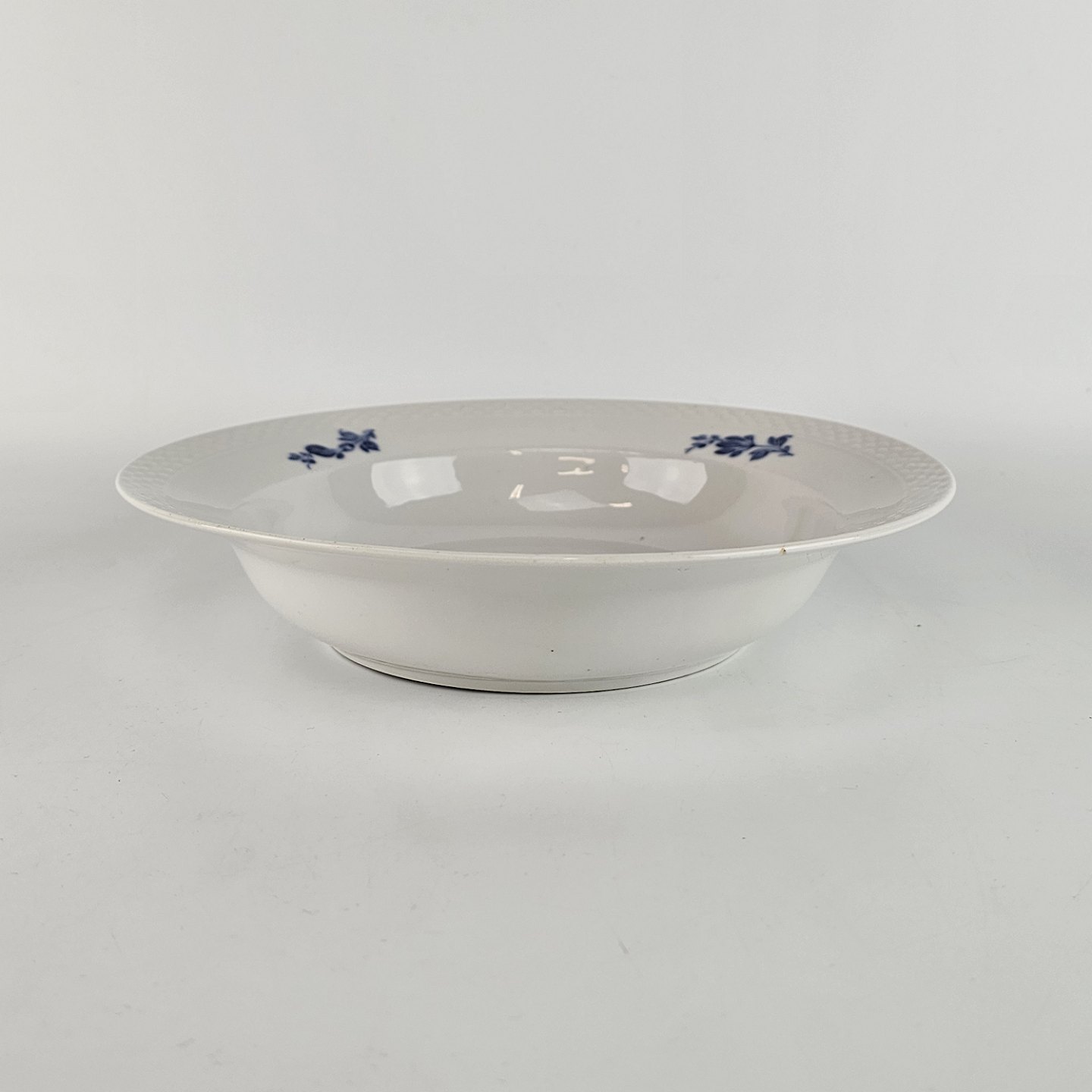 Blå blomst flettet er et hvidt stel med et flettet mønster i kanten og med motiver af blå blomster. Lettere brugsspor kan forekomme.