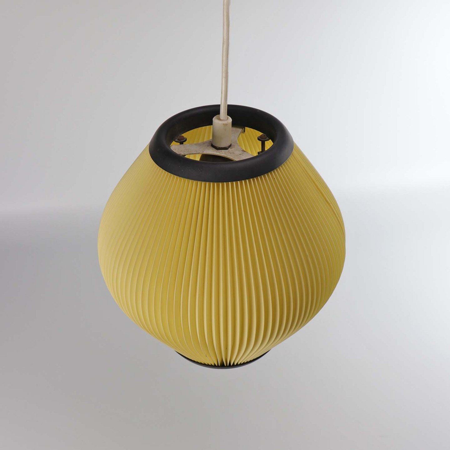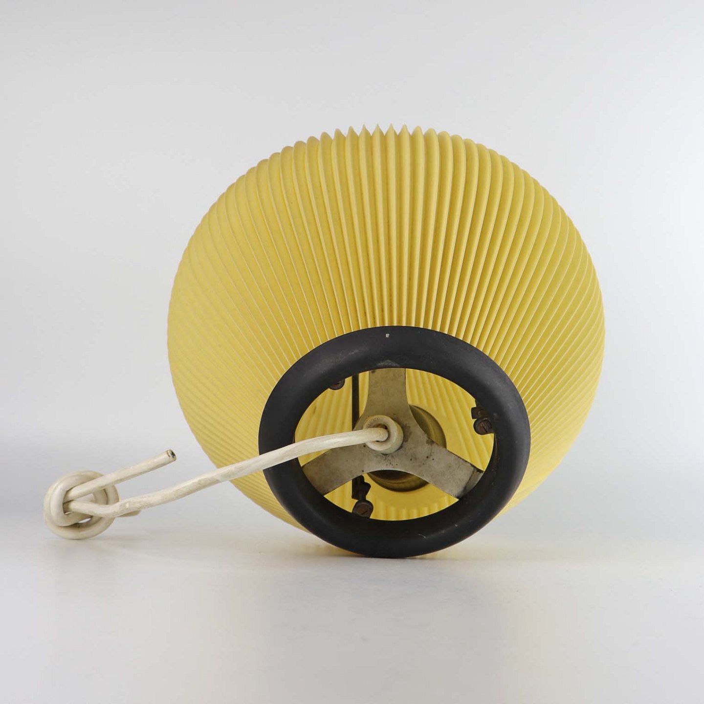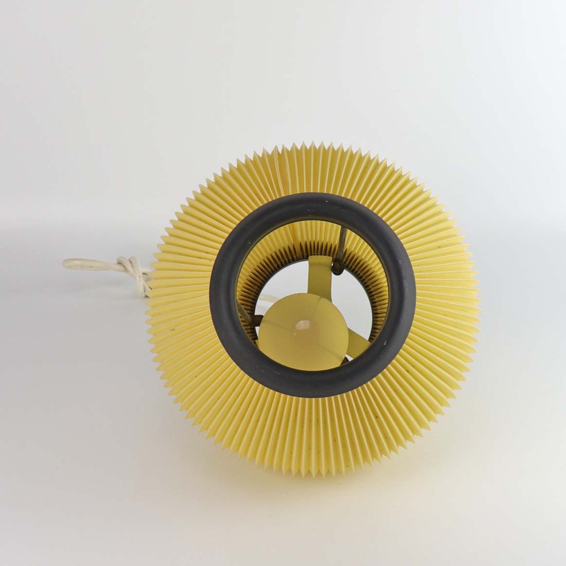 Ældre loftslampe i mørklakeret metal med gul plisseret skærm i plast