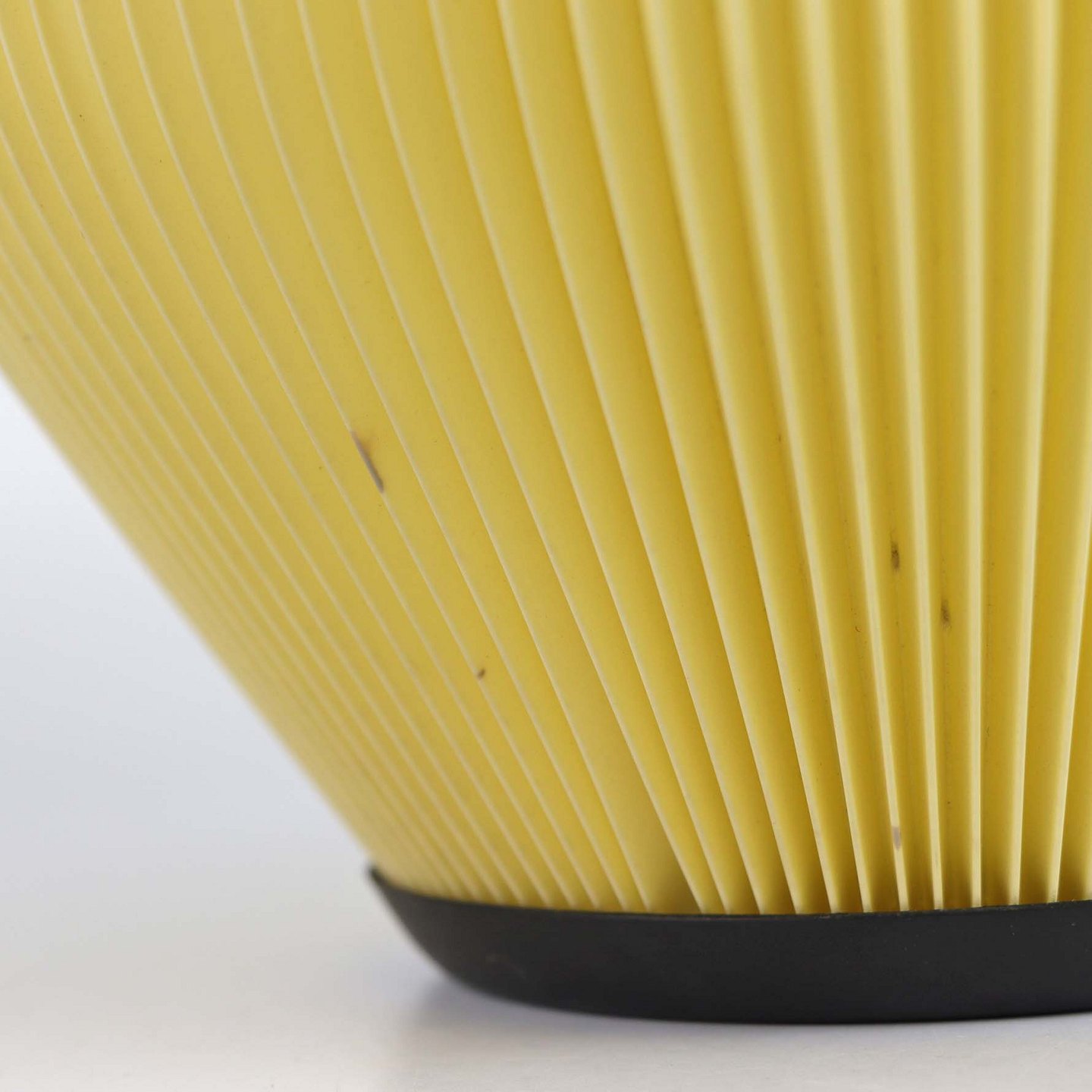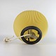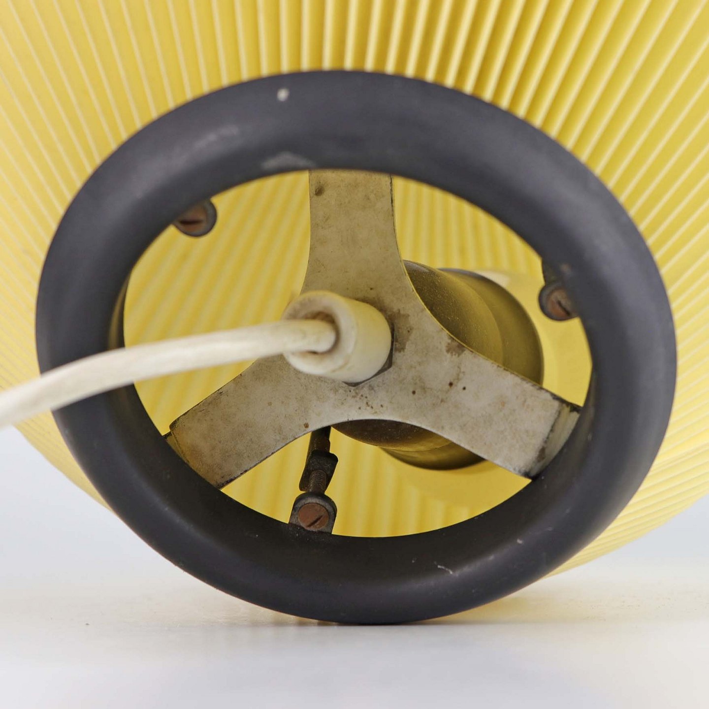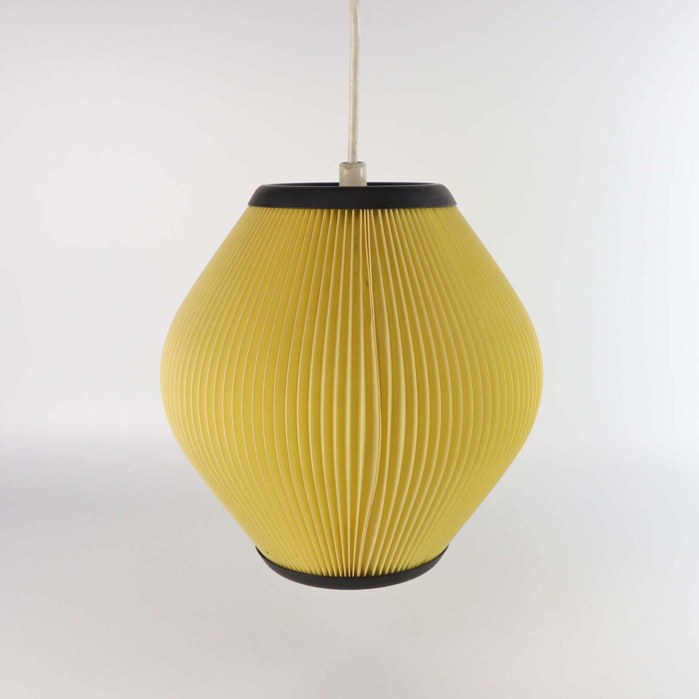Ældre loftslampe i mørklakeret metal med gul plisseret skærm i plast