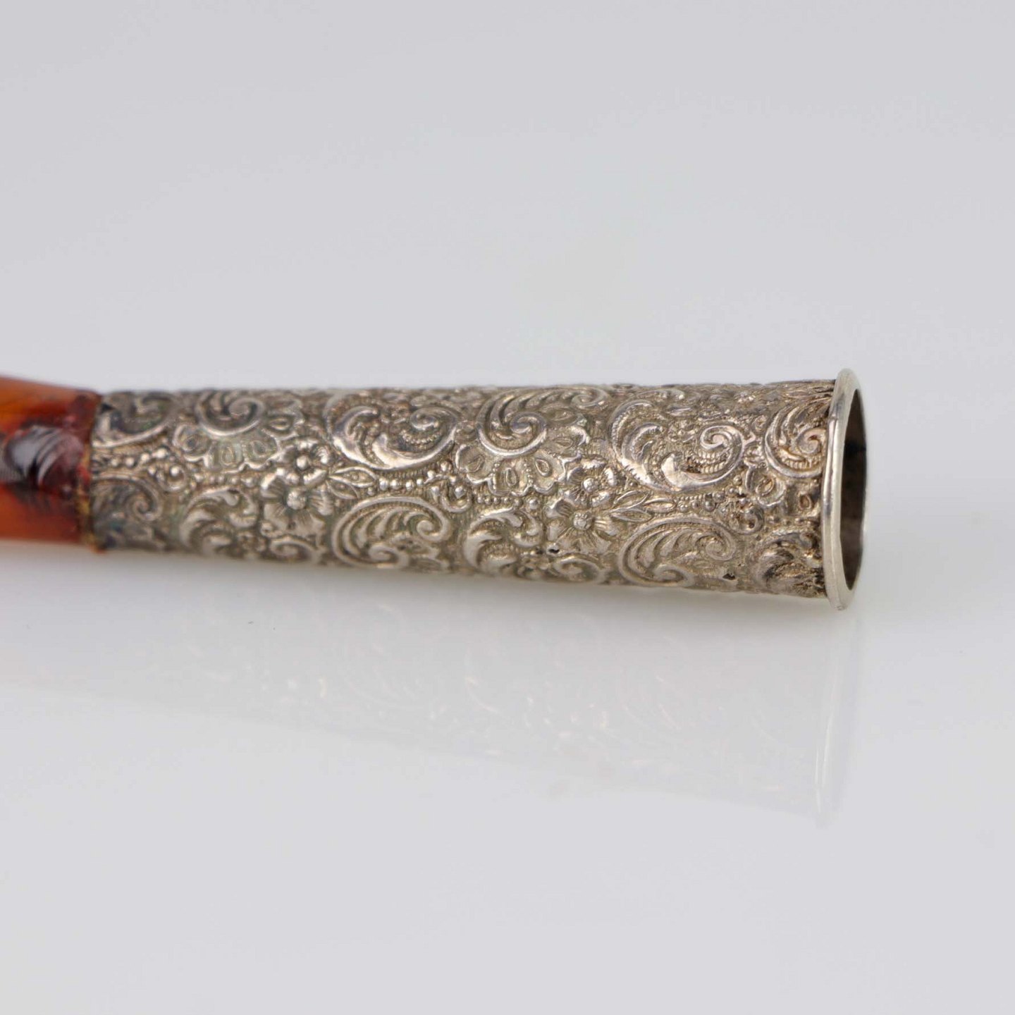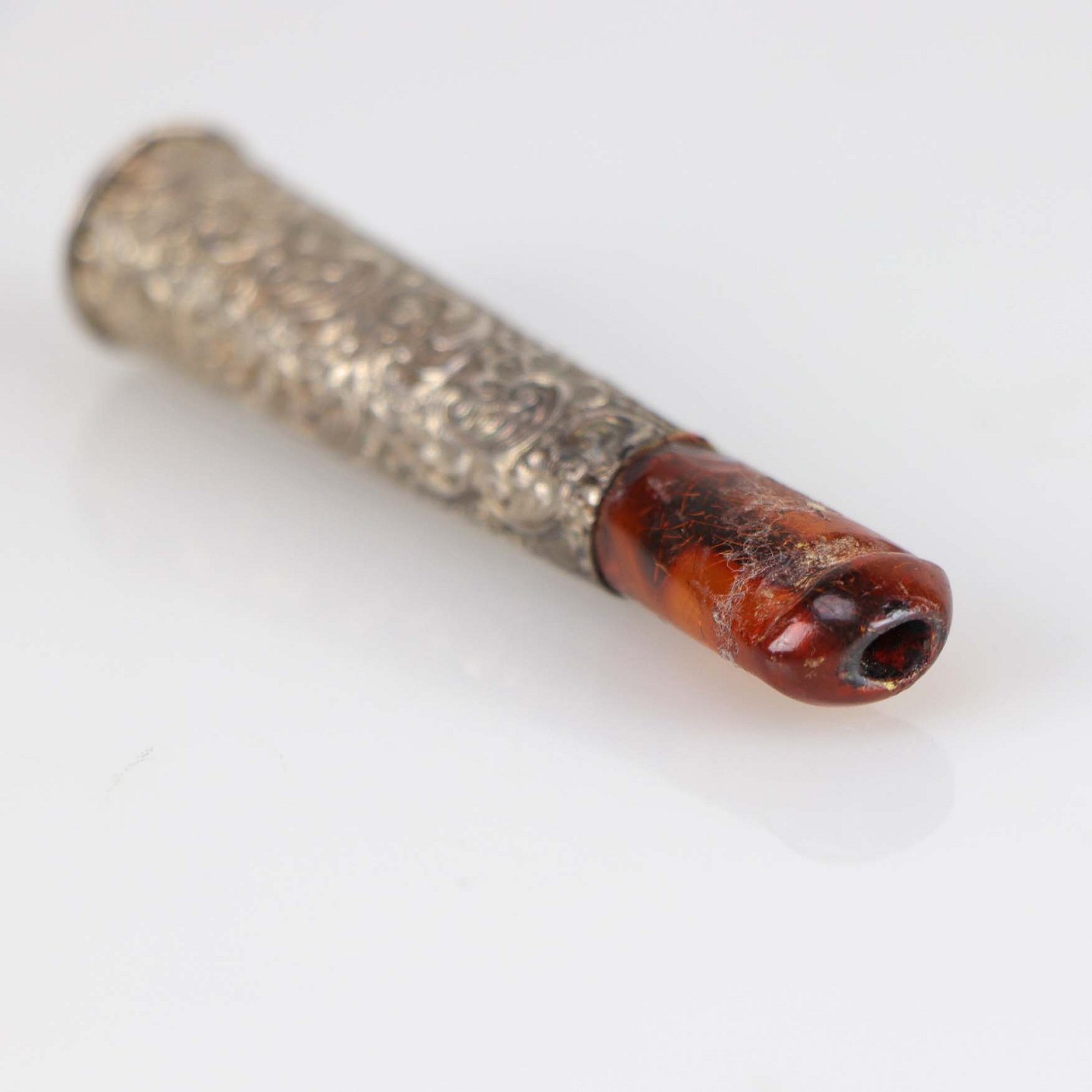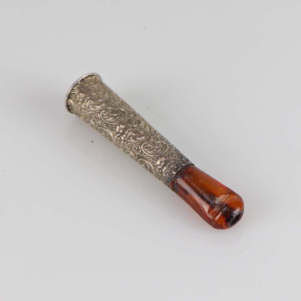Cigaret rør i sølvplet dekoreret med blomstermotiver og med mundstykke af rav. Røret kommer med tilhørende æske.