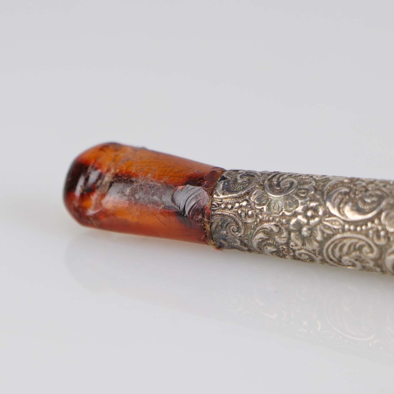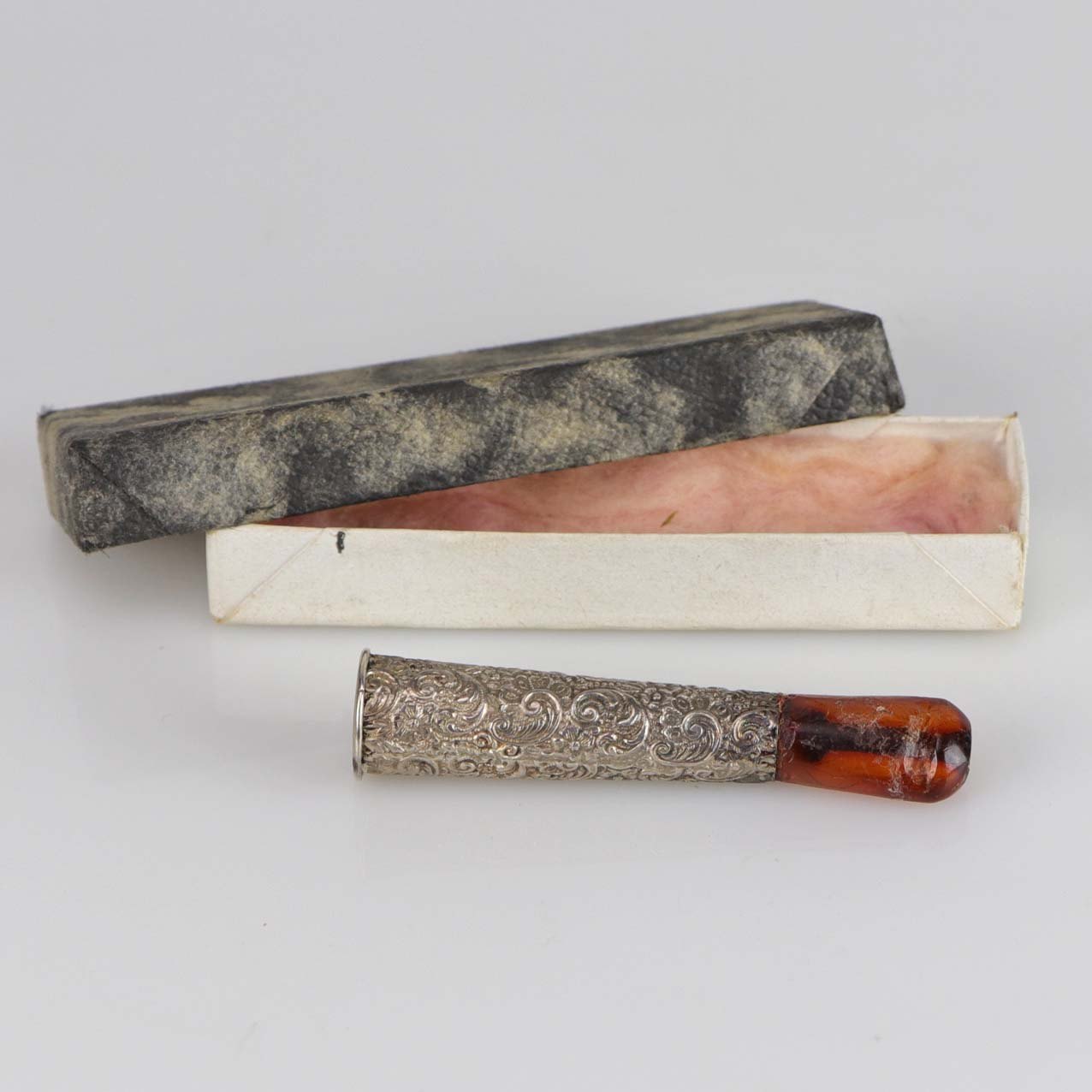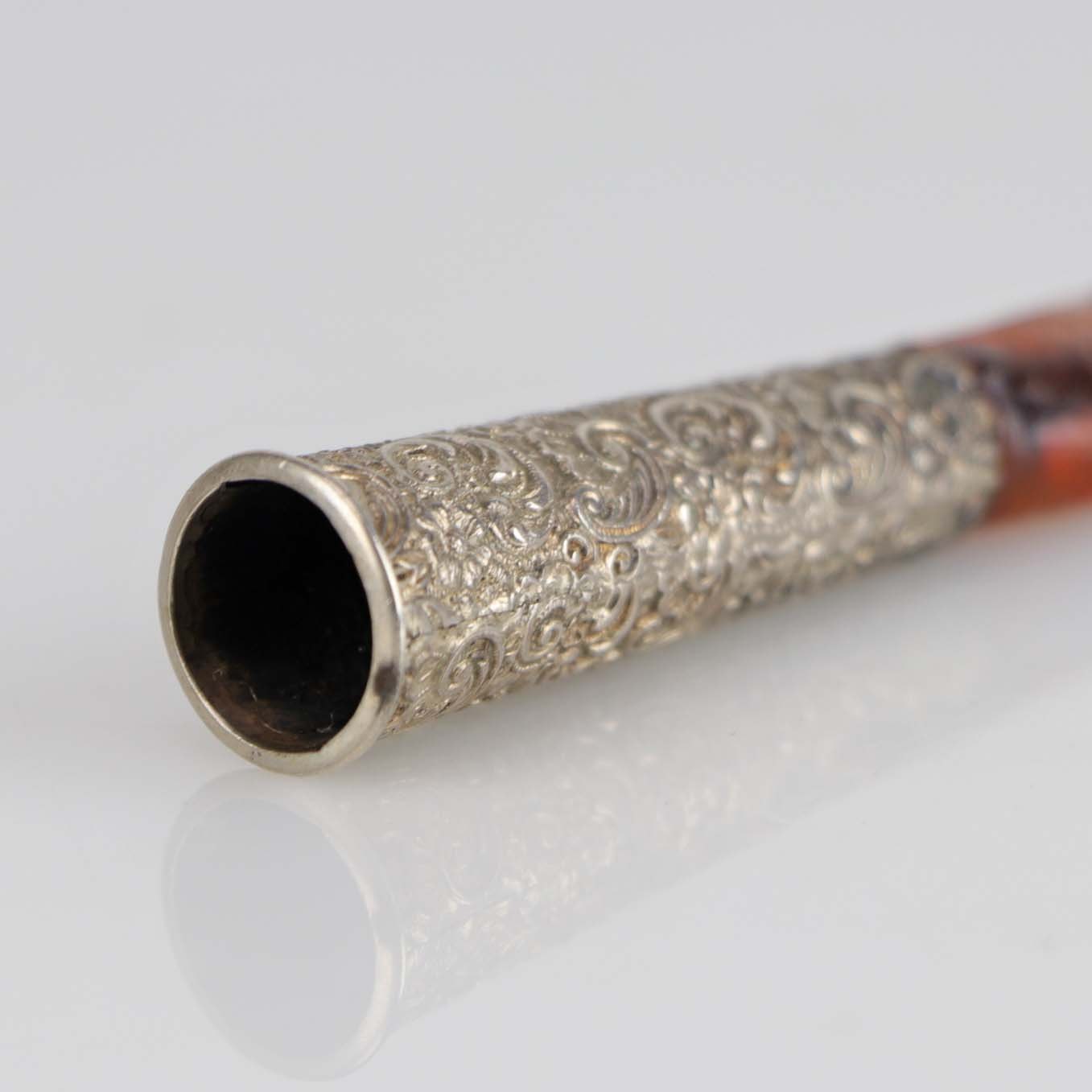 Cigaret rør i sølvplet dekoreret med blomstermotiver og med mundstykke af rav. Røret kommer med tilhørende æske.