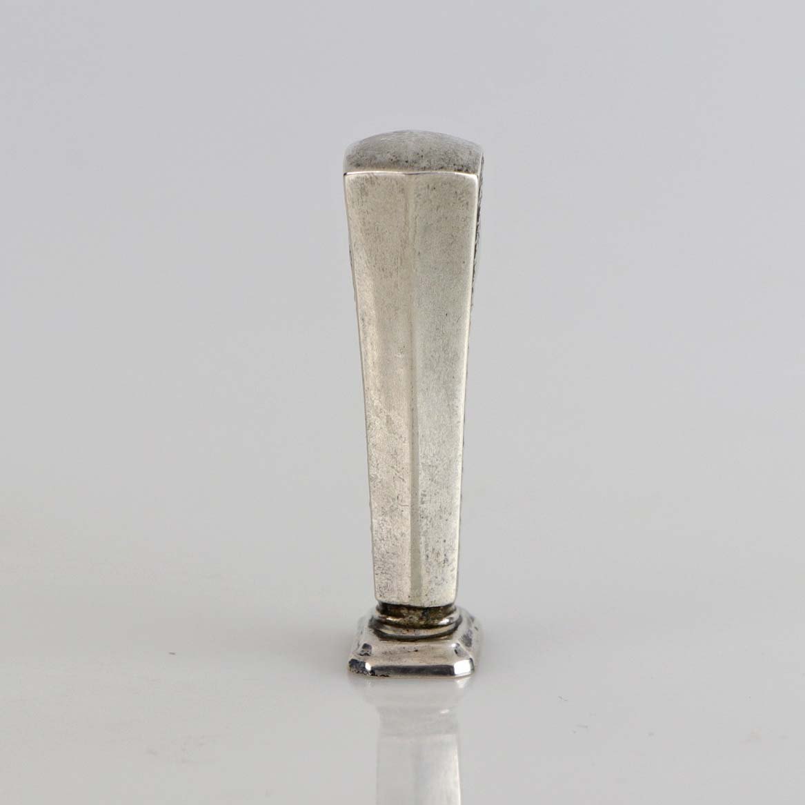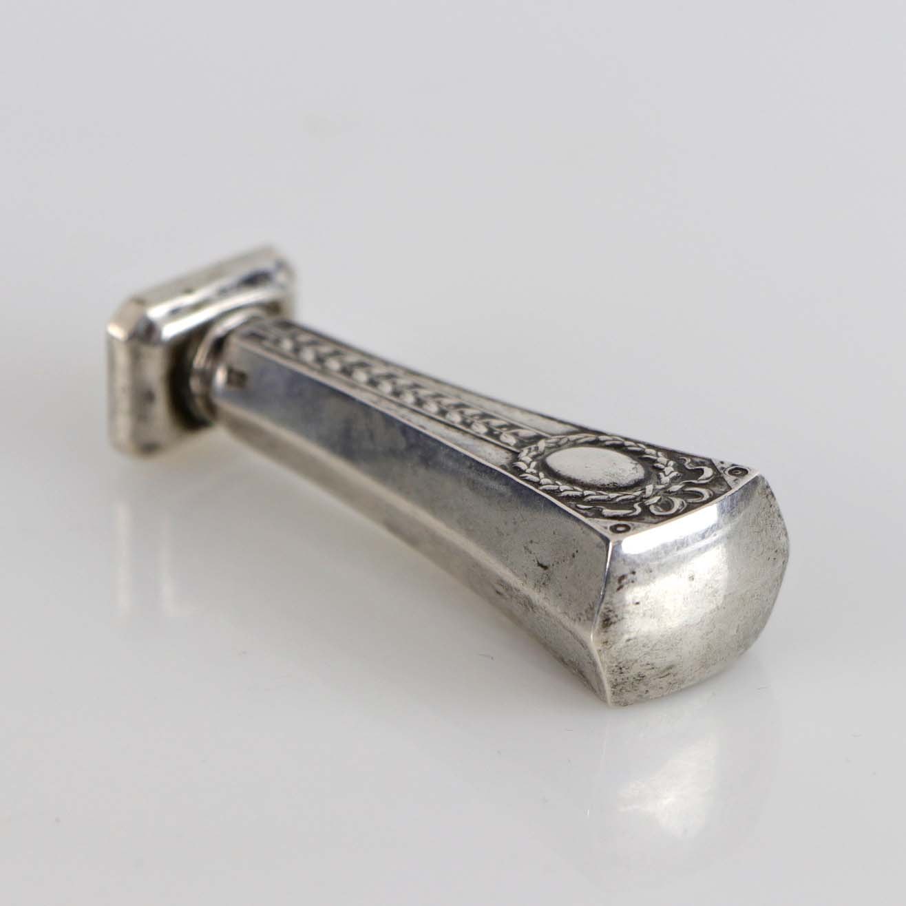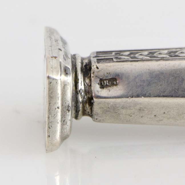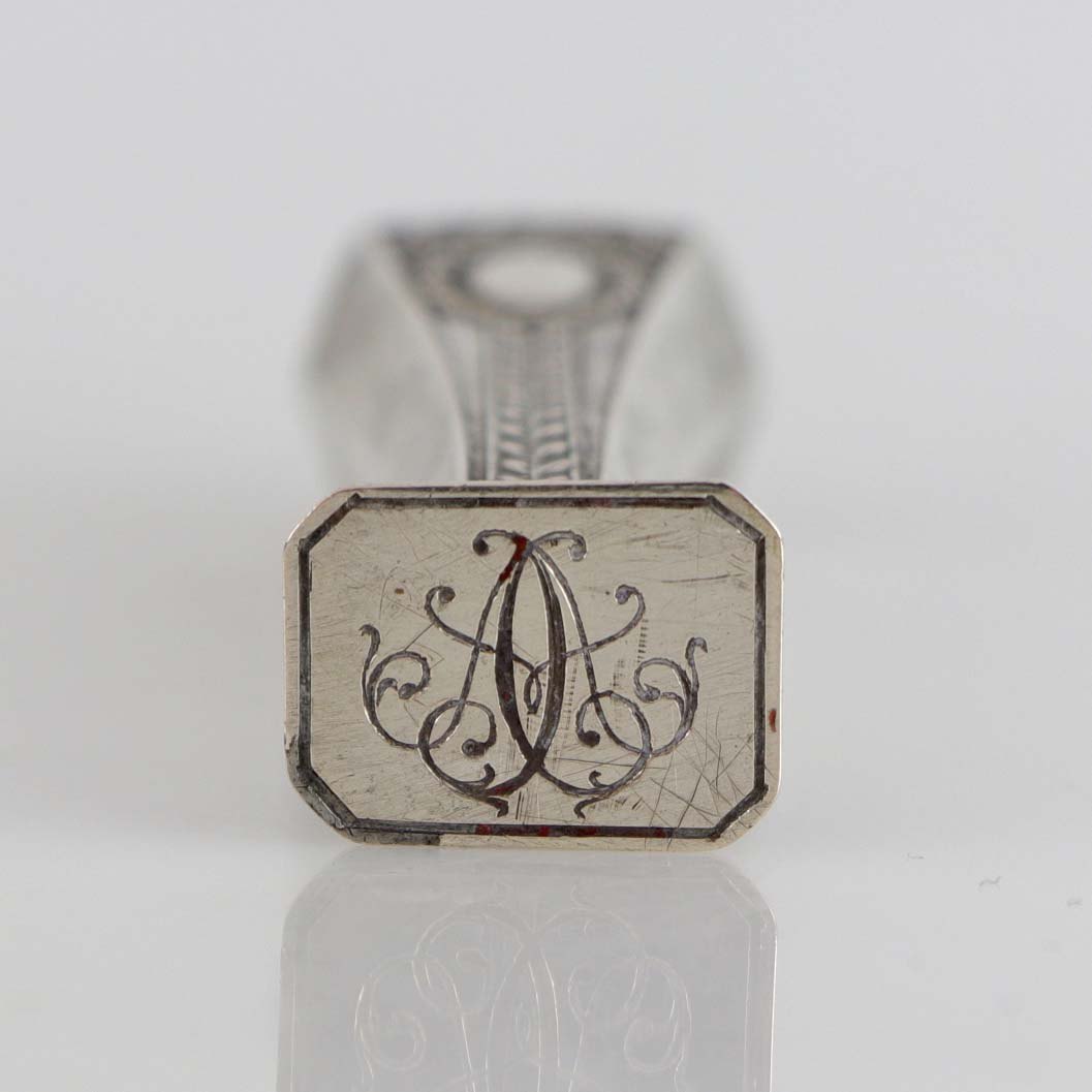 Signatur stempel i sølv med monogrammet A A og dekoration af krans og blade