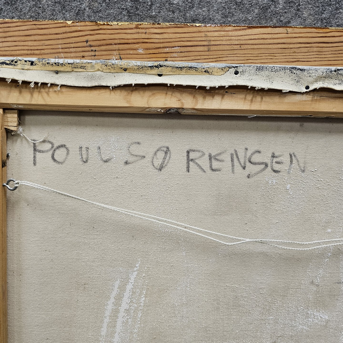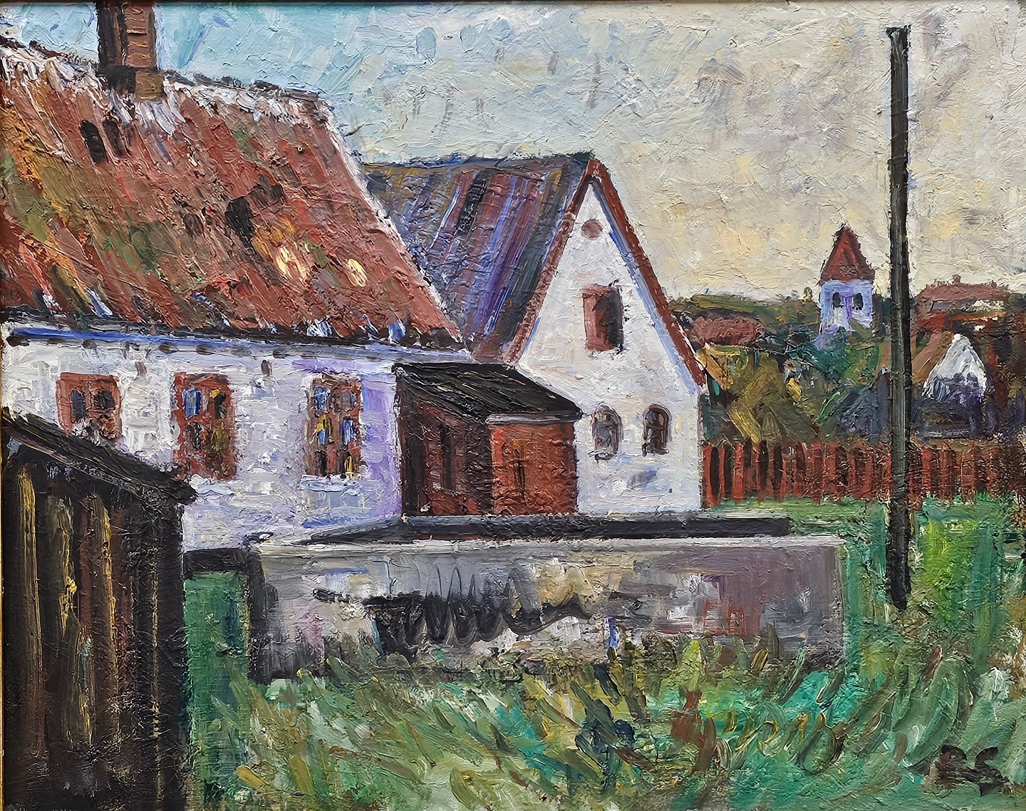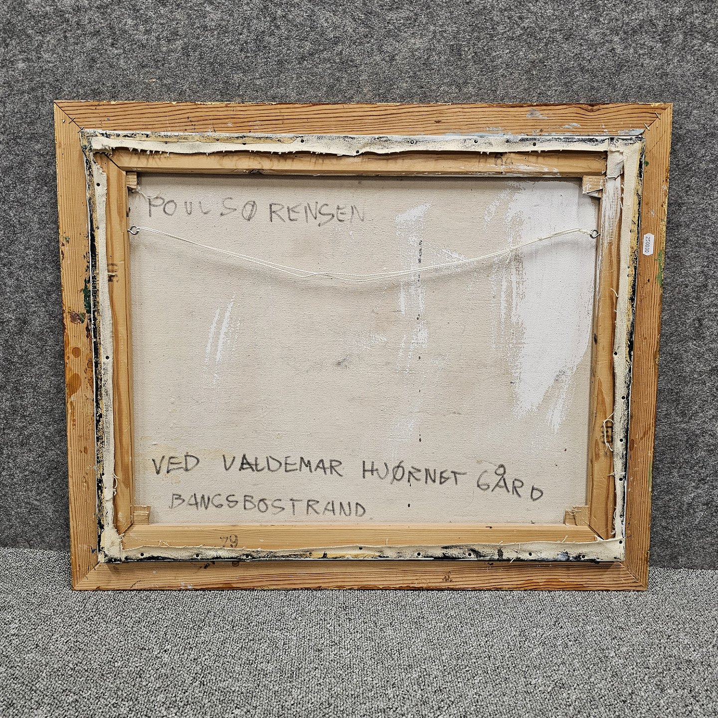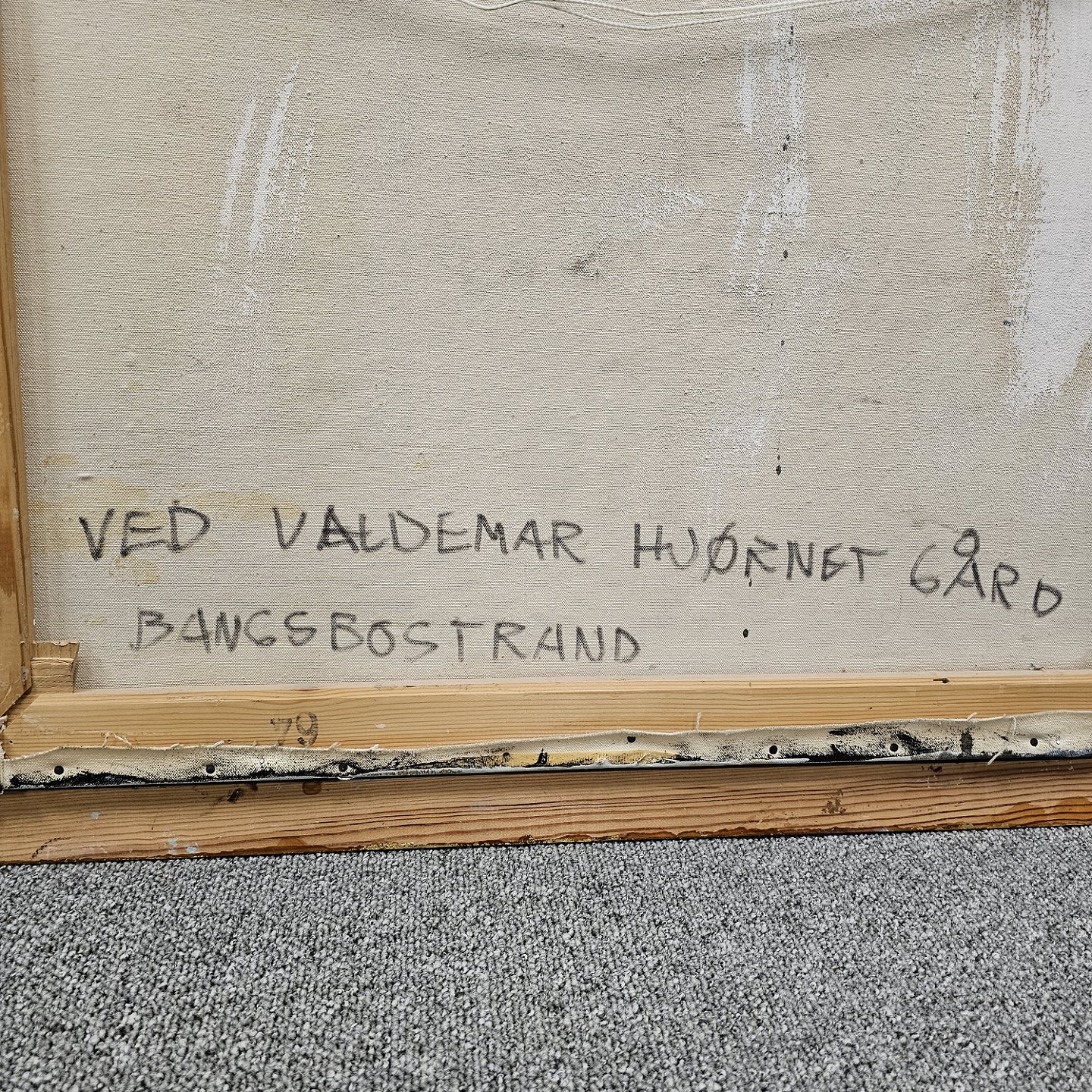 Maleri af olie på lærred, med motiv af huse. Bag på ses teksten, Ved Valdemar Hjørnet gård, Bangsbostrand