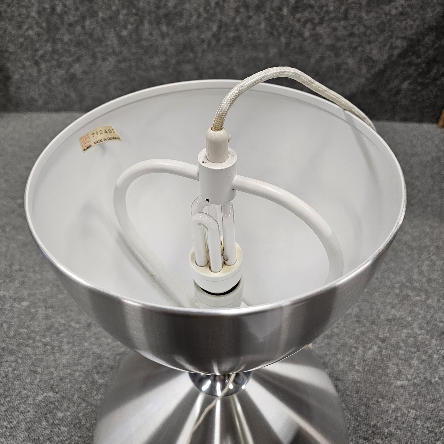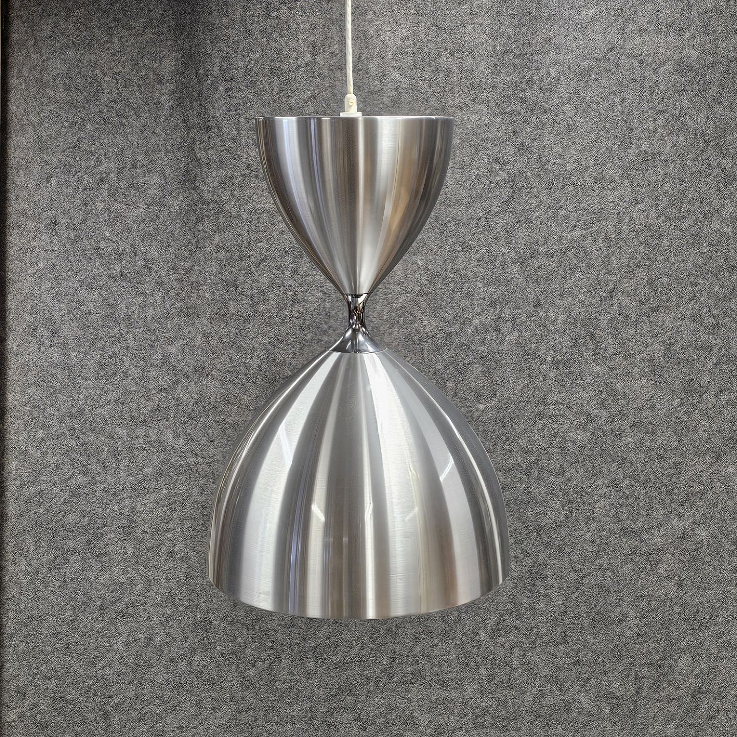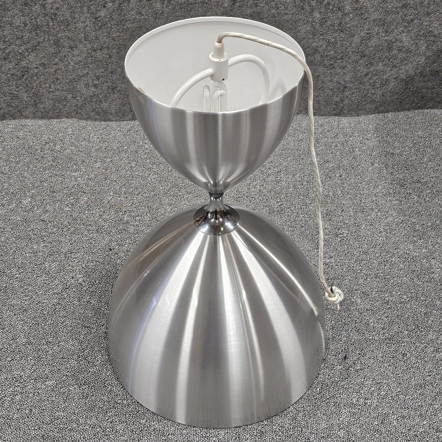 Lampe af aluminium formet som et timeglas med lys både op- og nedad. Model Vega blev designet i 1960'erne