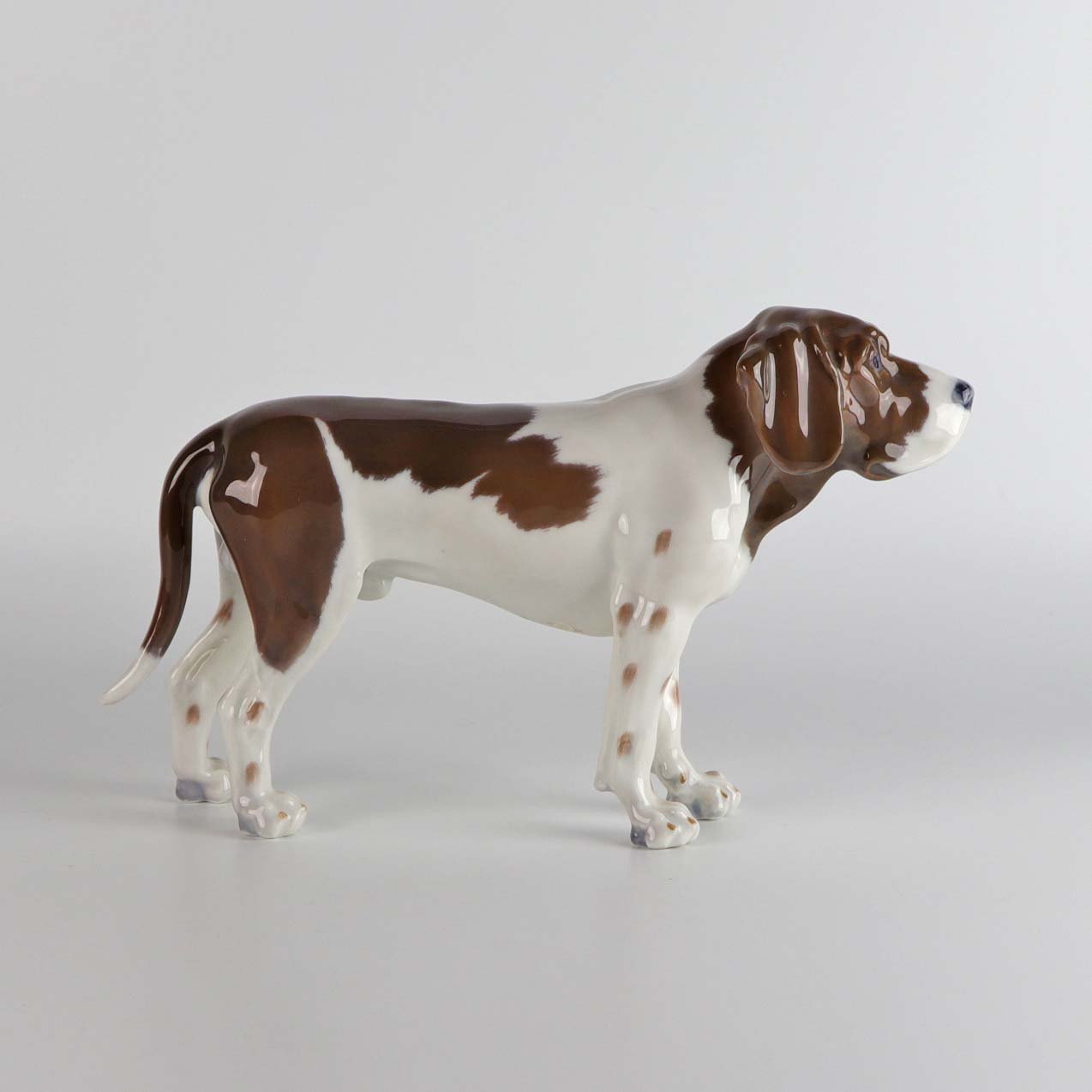 Figur i porcelæn med motiv af stående gammel dansk hønsehund. Nr. 4852