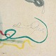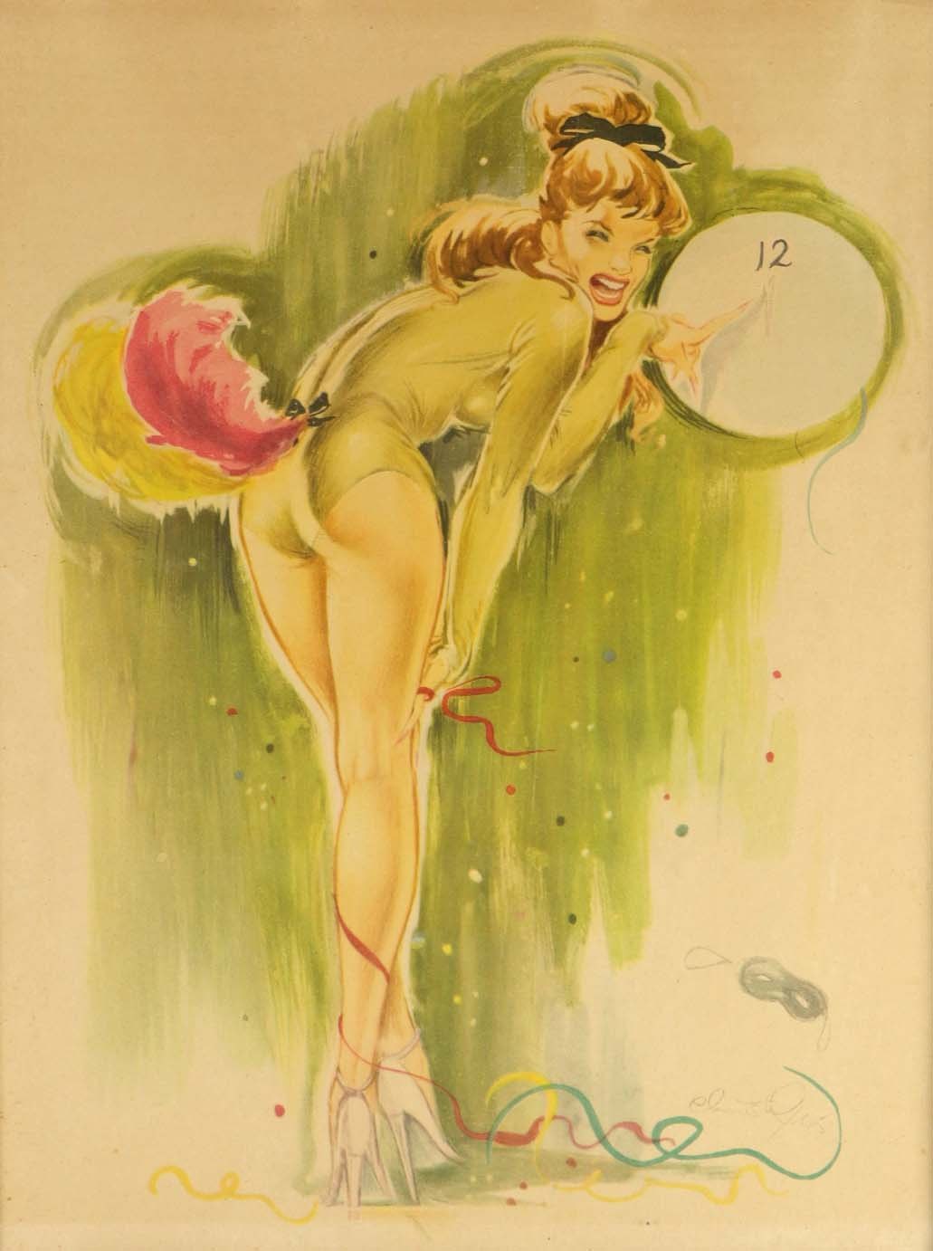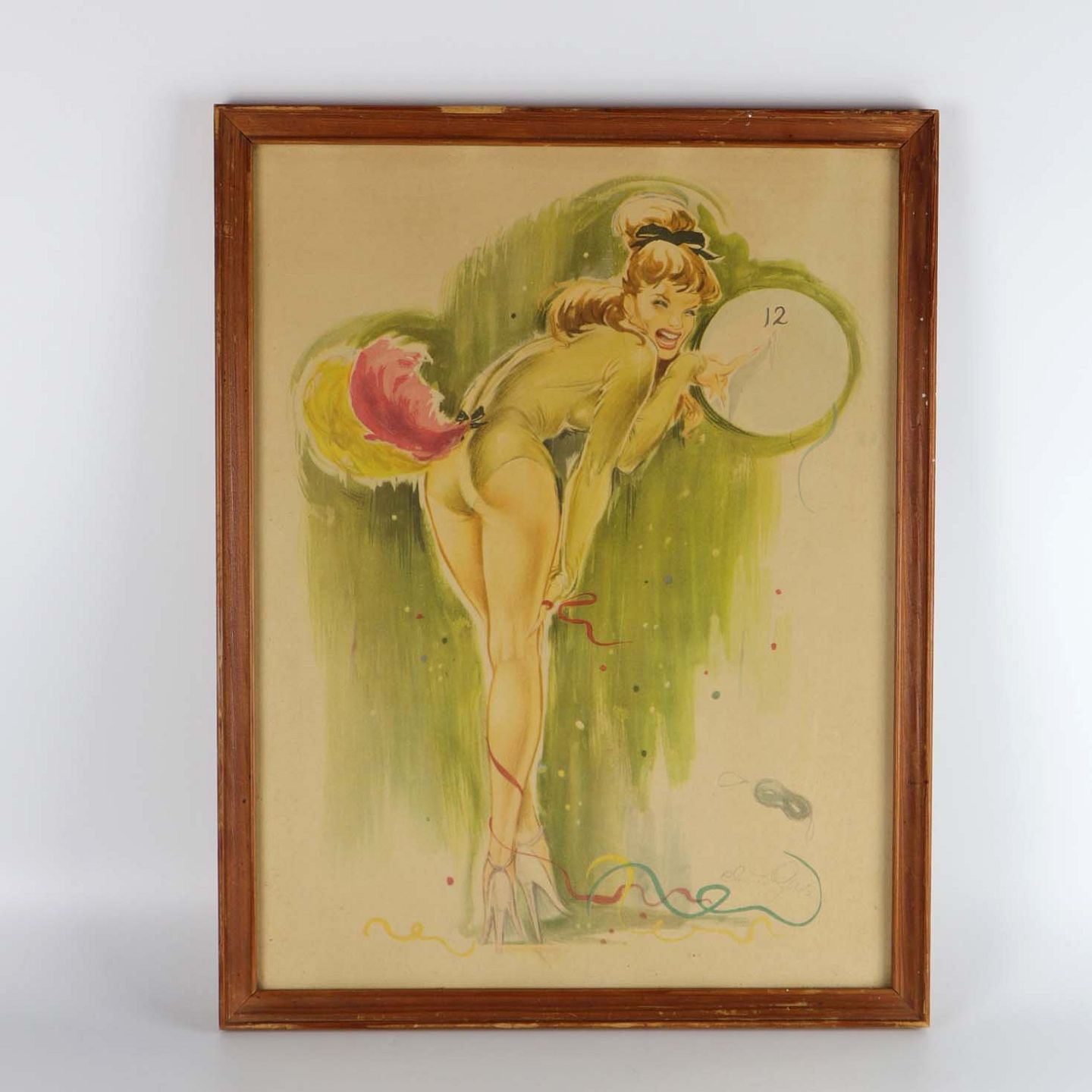 Indrammet tryk i ramme med motiv af pin-up pige med fjer omgivet af serpentiner på nytårsaften