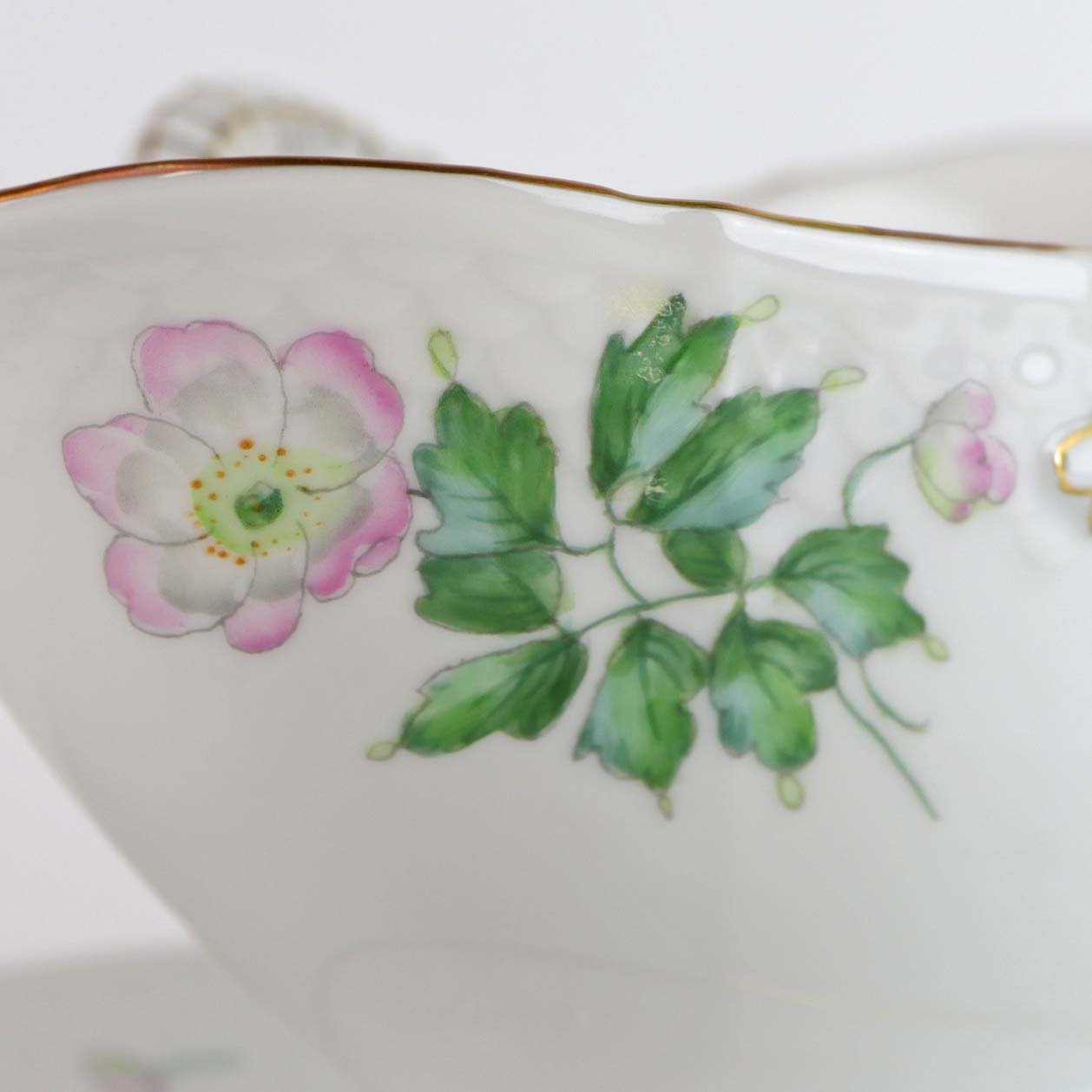 Anemone Macbeth er af hvidt glaseret porcelæn, dekoreret med håndmalede lyserøde anemoner og gylden kant