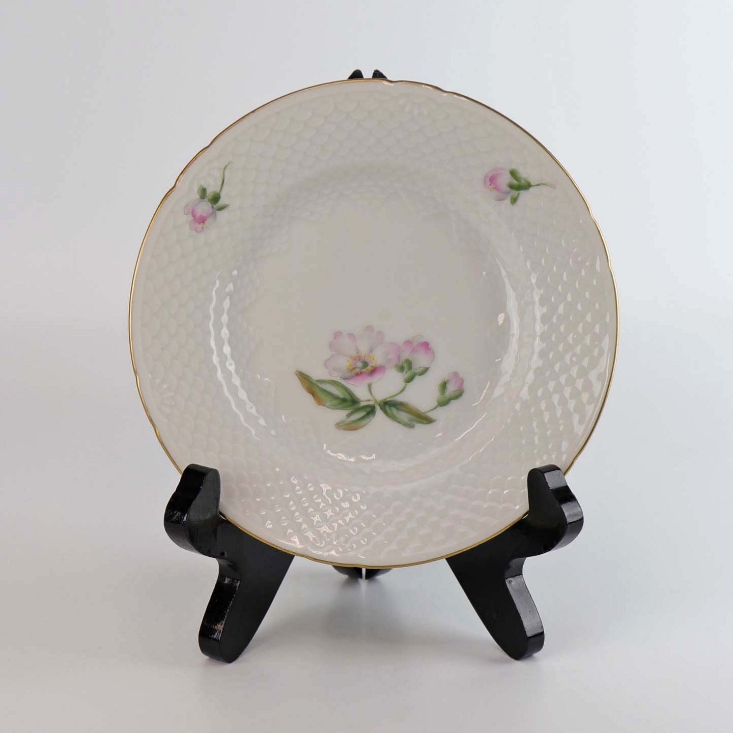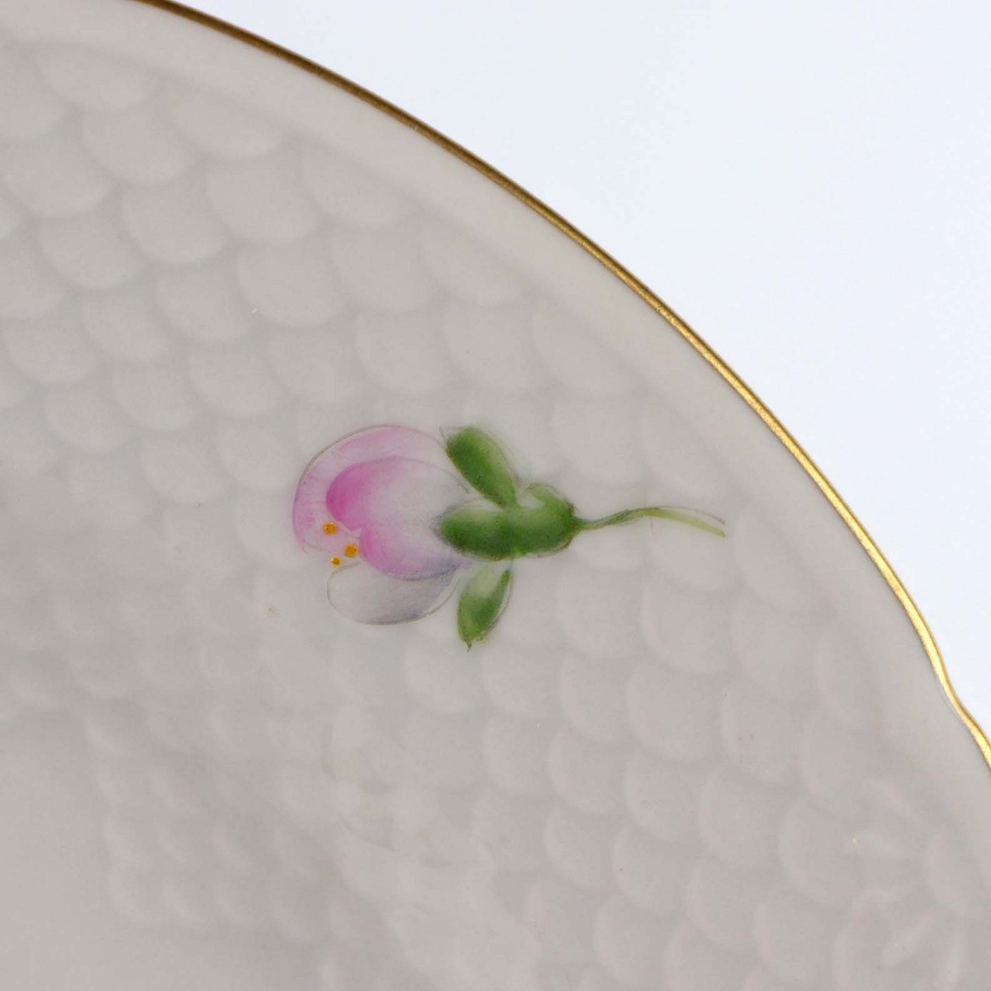 Anemone Macbeth er af hvidt glaseret porcelæn, dekoreret med håndmalede lyserøde anemoner og gylden kant
