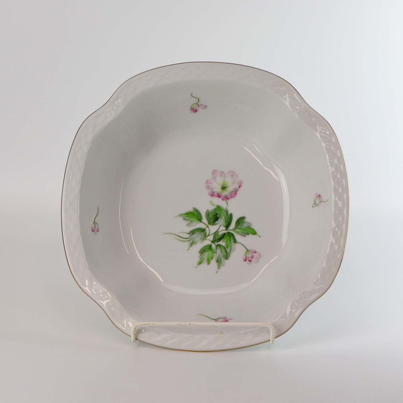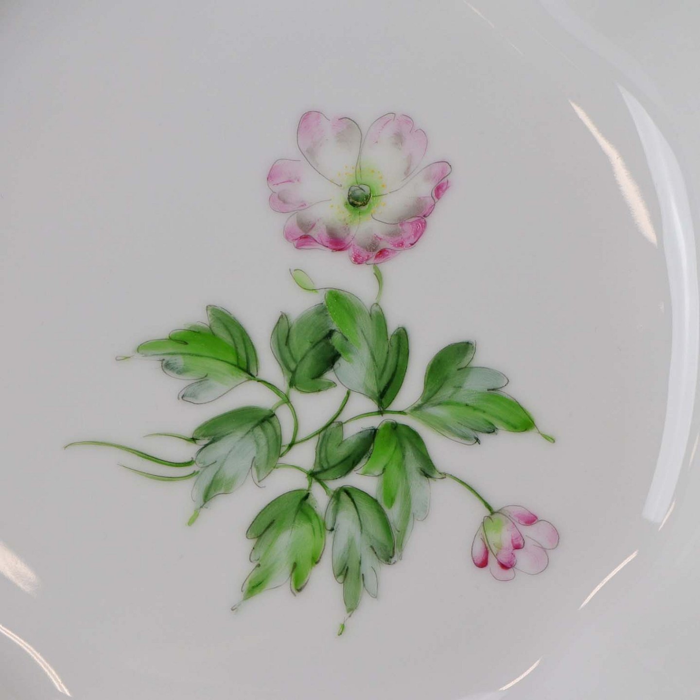 Anemone Macbeth er af hvidt glaseret porcelæn, dekoreret med håndmalede lyserøde anemoner og gylden kant