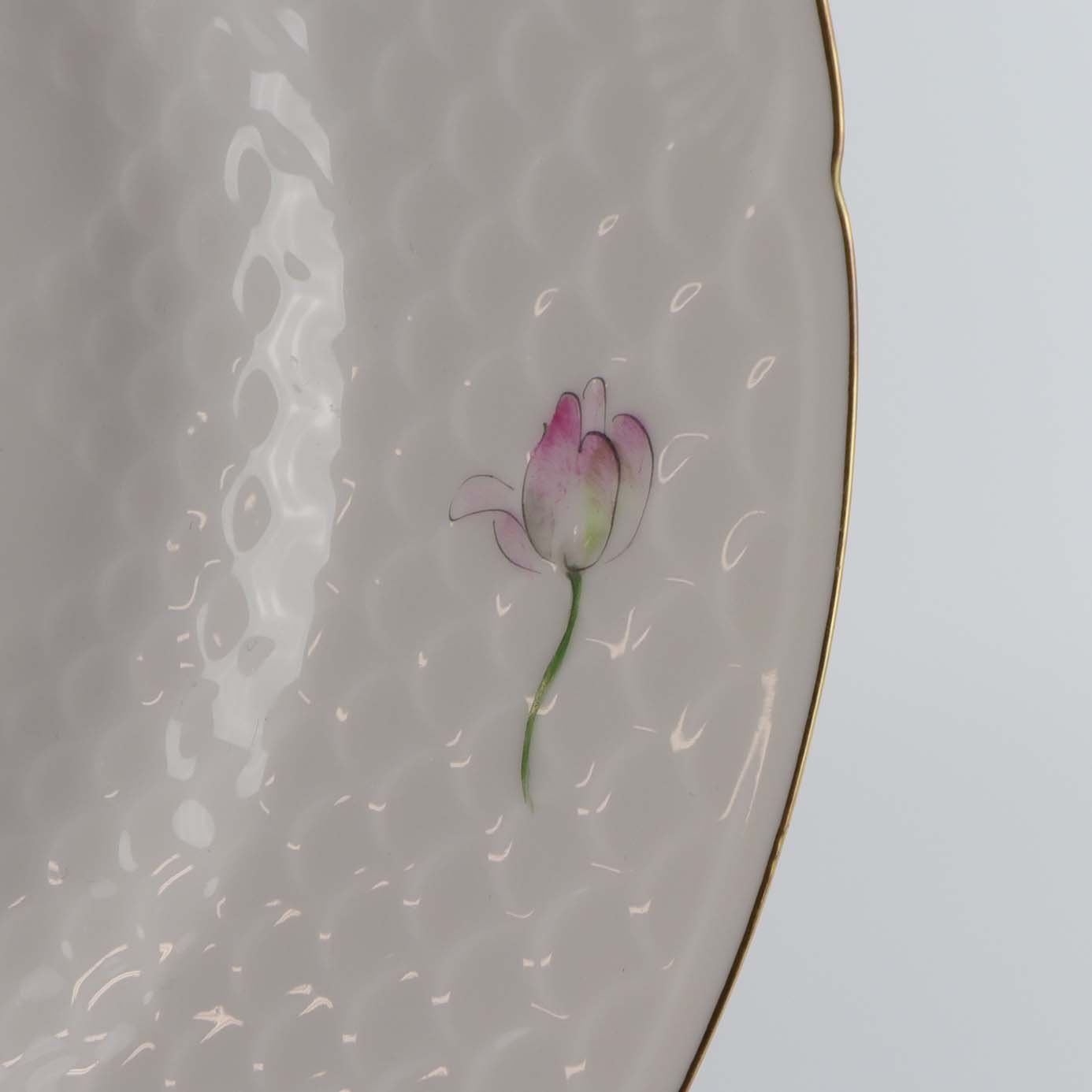 Anemone Macbeth er af hvidt glaseret porcelæn, dekoreret med håndmalede lyserøde anemoner og gylden kant
