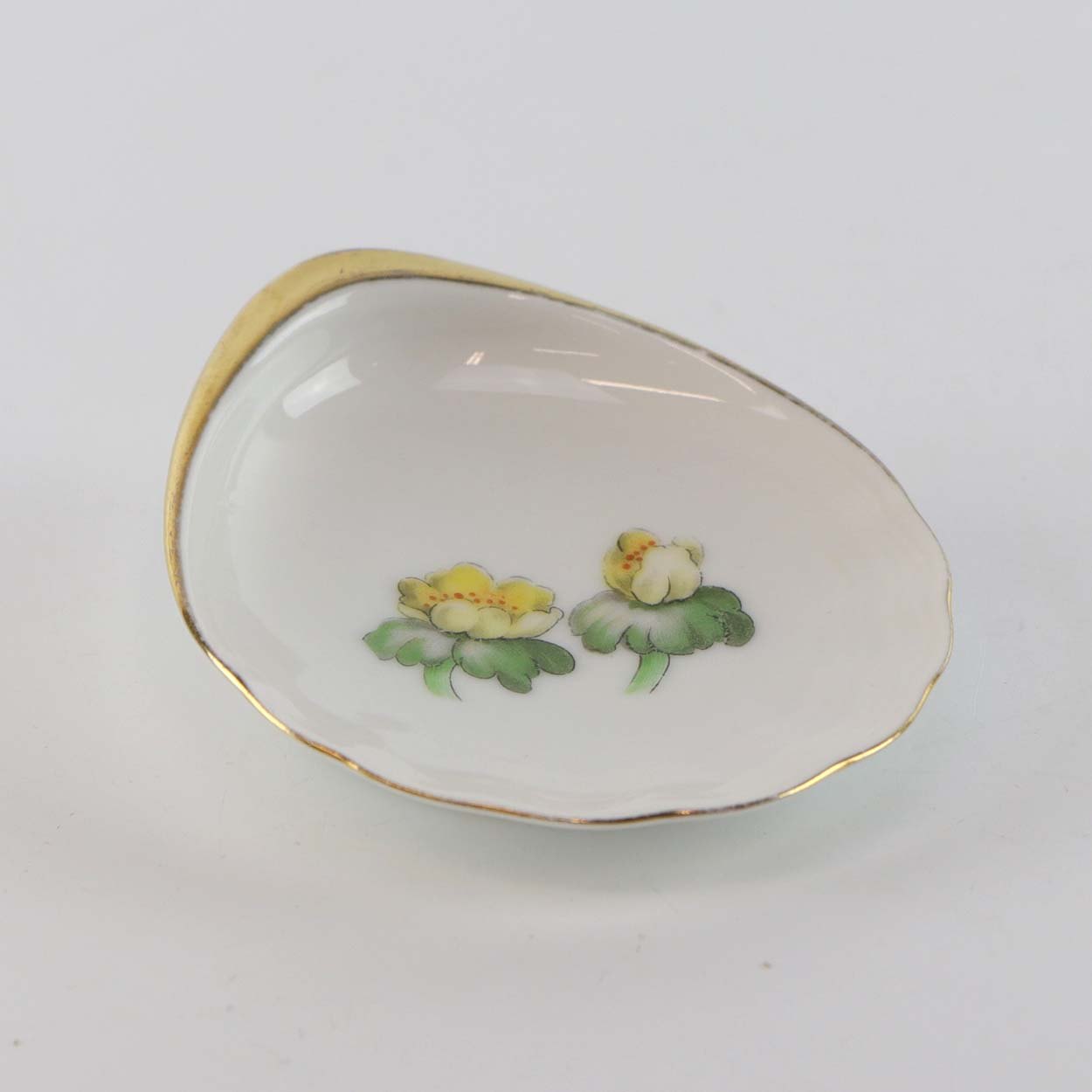 Hvidt porcelæn i skælform med dekoration af gule blomster og guldkant
