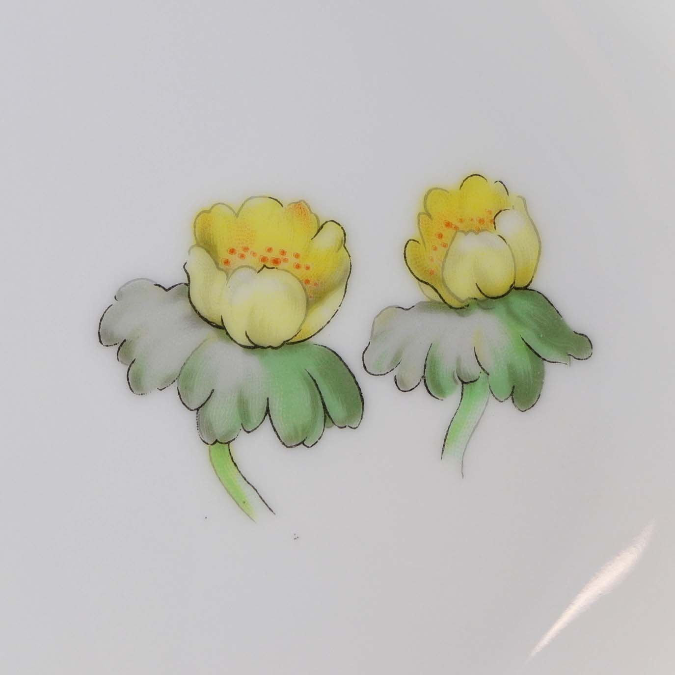 Hvidt porcelæn i skælform med dekoration af gule blomster og guldkant