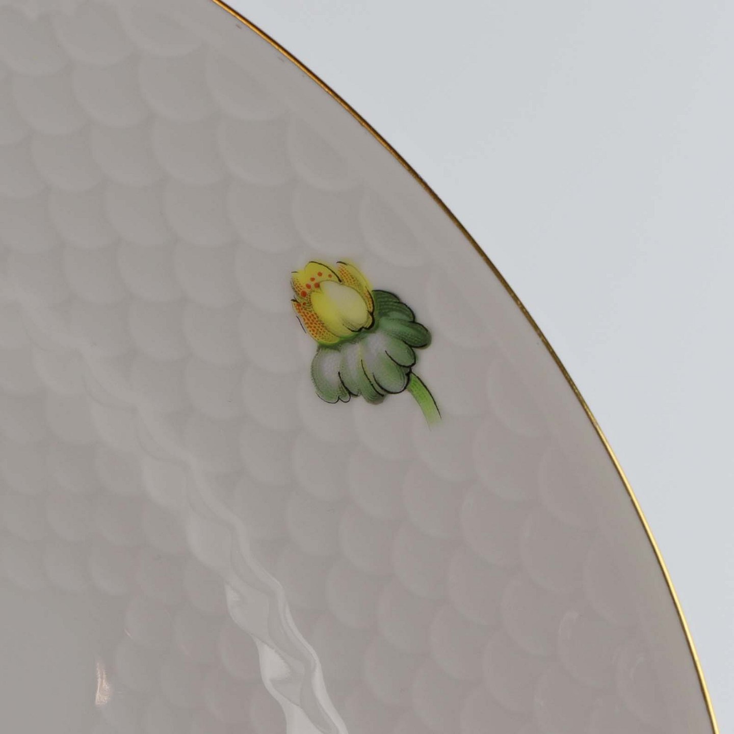 Hvidt porcelæn i skælform med dekoration af gule blomster og guldkant