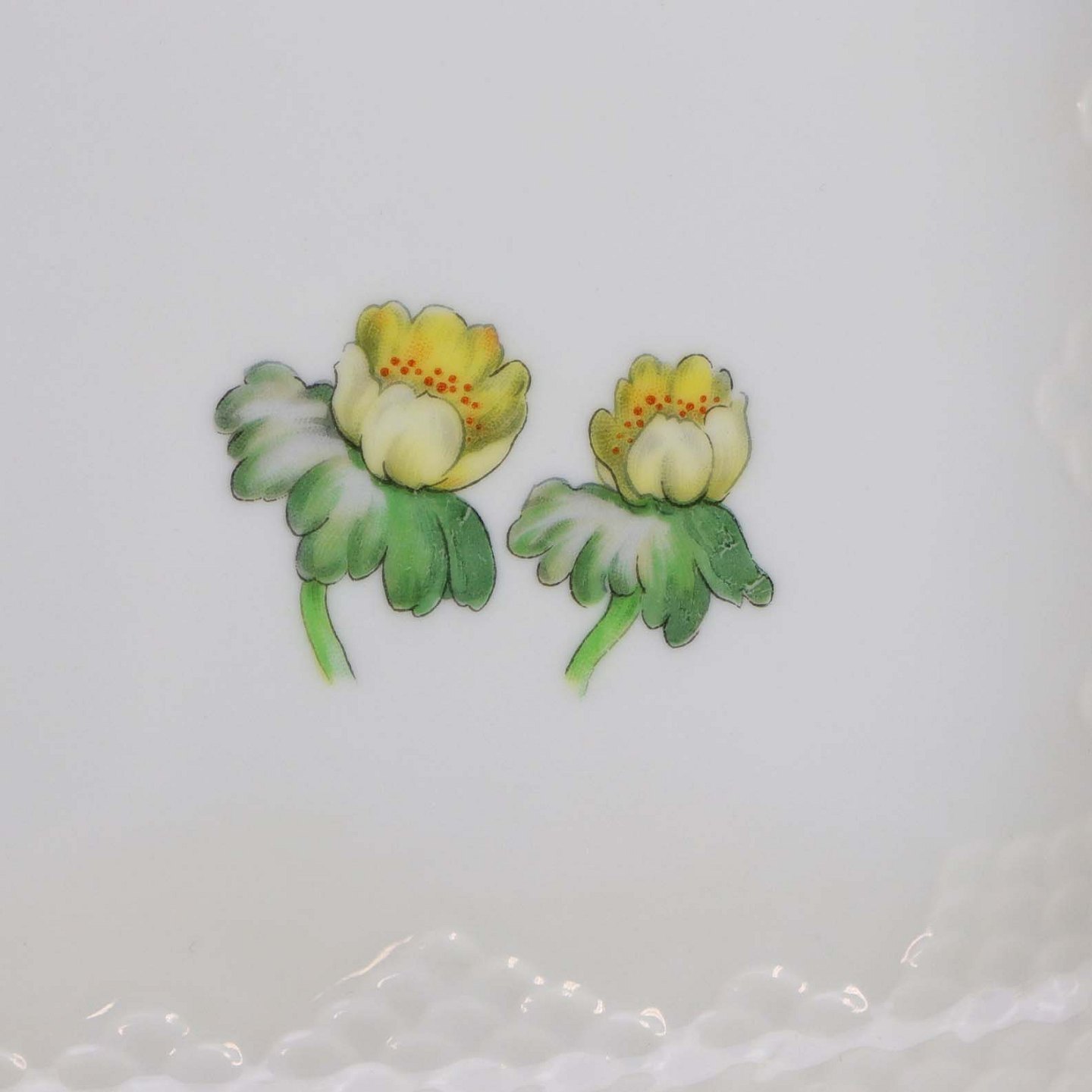 Hvidt porcelæn i skælform med dekoration af gule blomster og guldkant