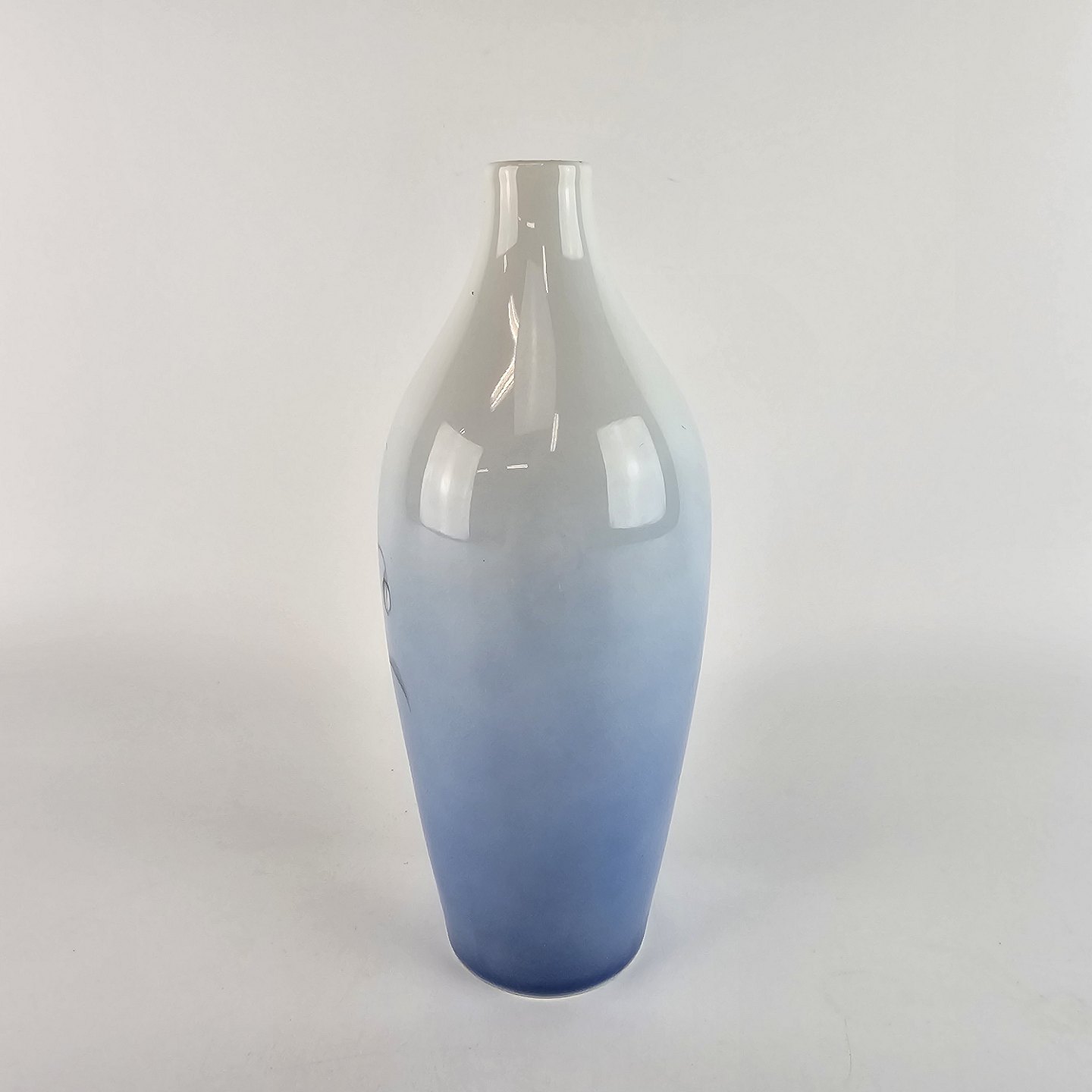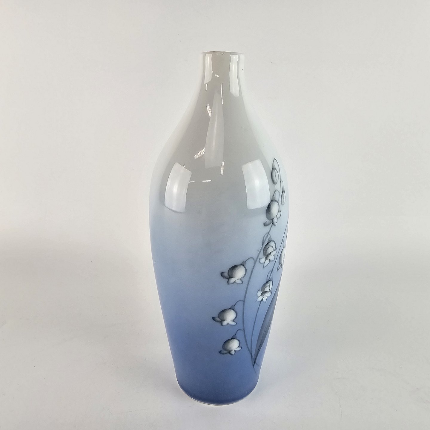 Stellet er fra 1970 og udformet i glat porcelæn med gradueret blålig tone samt motiv af en liljekonval.
