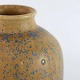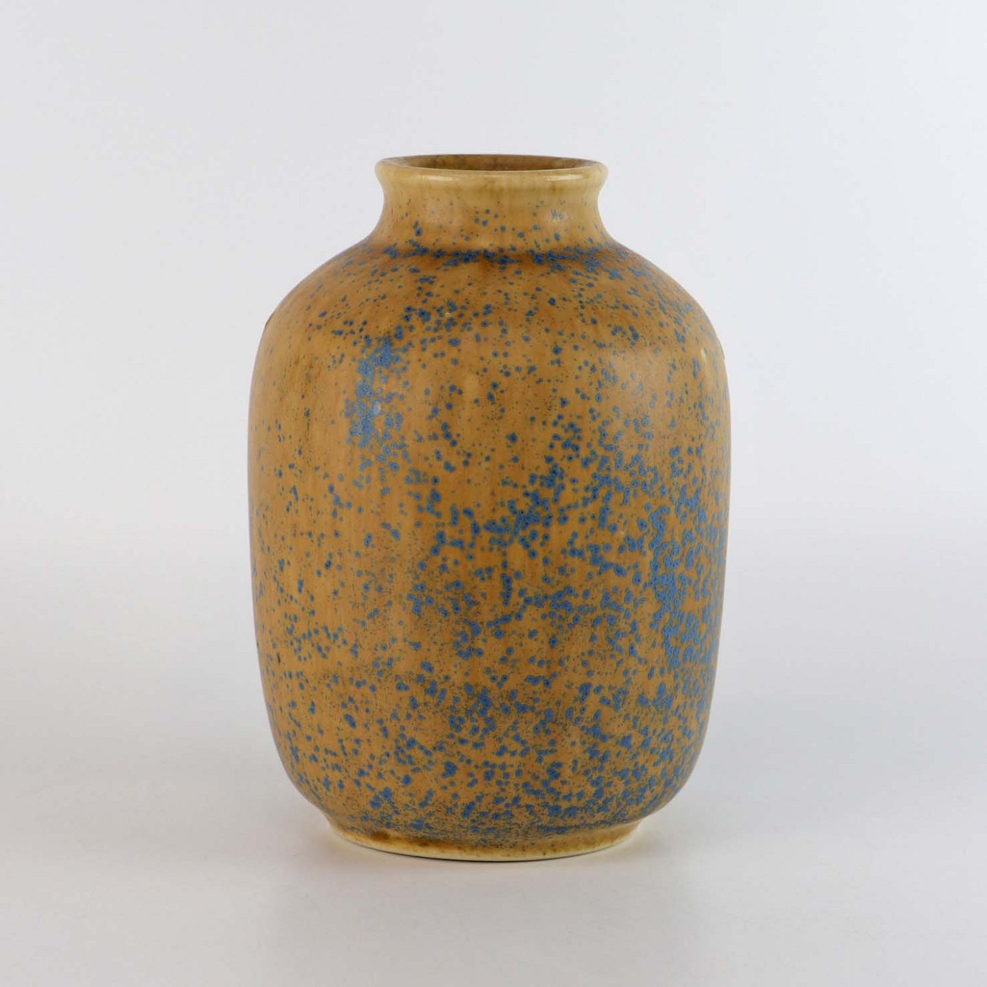 Vase i stentøj i gule og blå farver med motiv af et dådyr. Nr. 117 H7