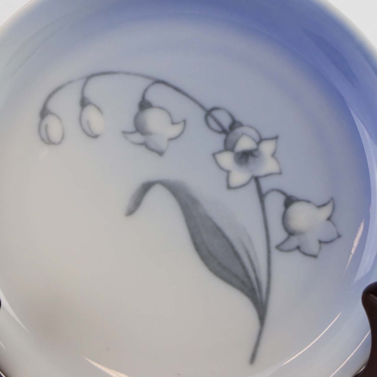 Stellet er fra 1970 og udformet i glat porcelæn med gradueret blålig tone samt motiv af en liljekonval.