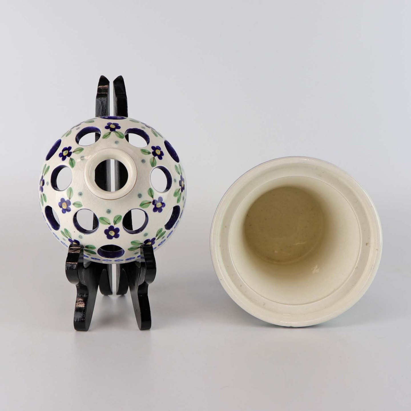 Vase med låg i fajance og motiv af dansende børn, som holder buketter af blå blomster i hænderne. Nr. 604/399