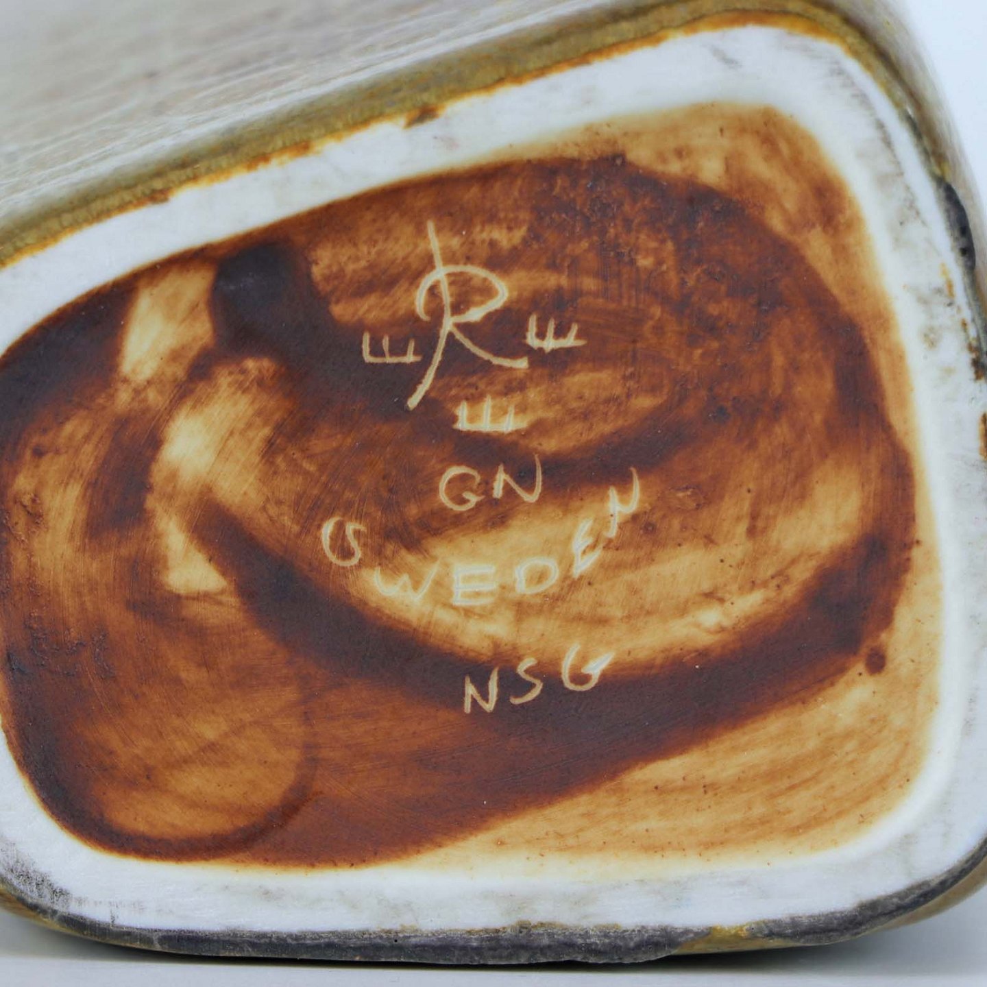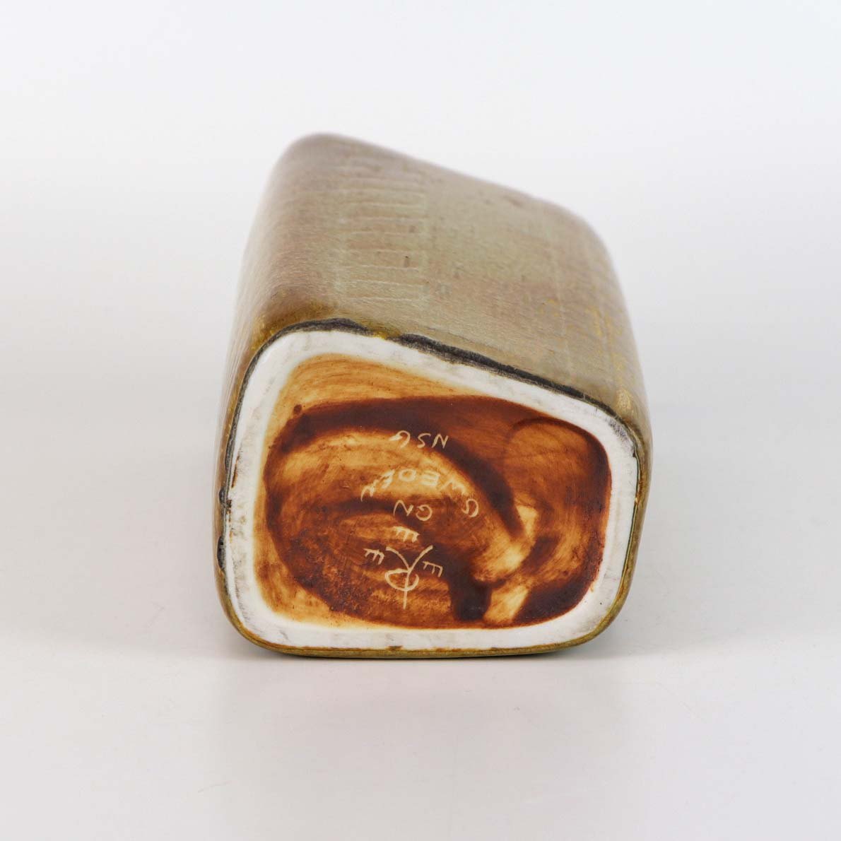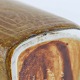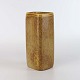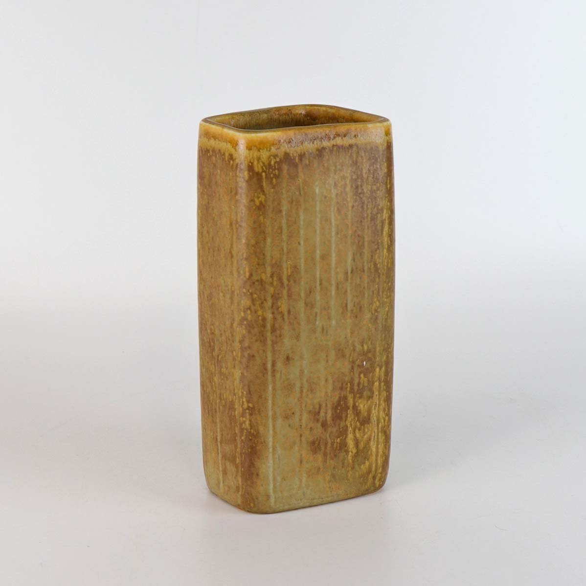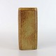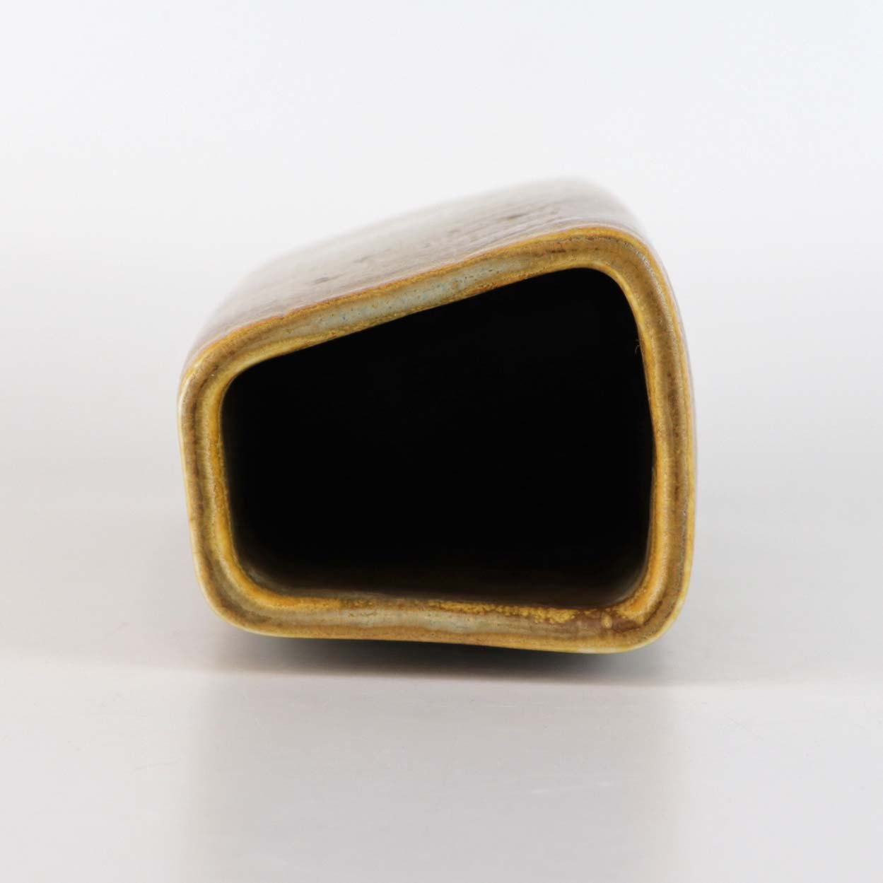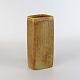 Asymmetrisk kantet vase i stentøj med gulbrun glasering og stuktur