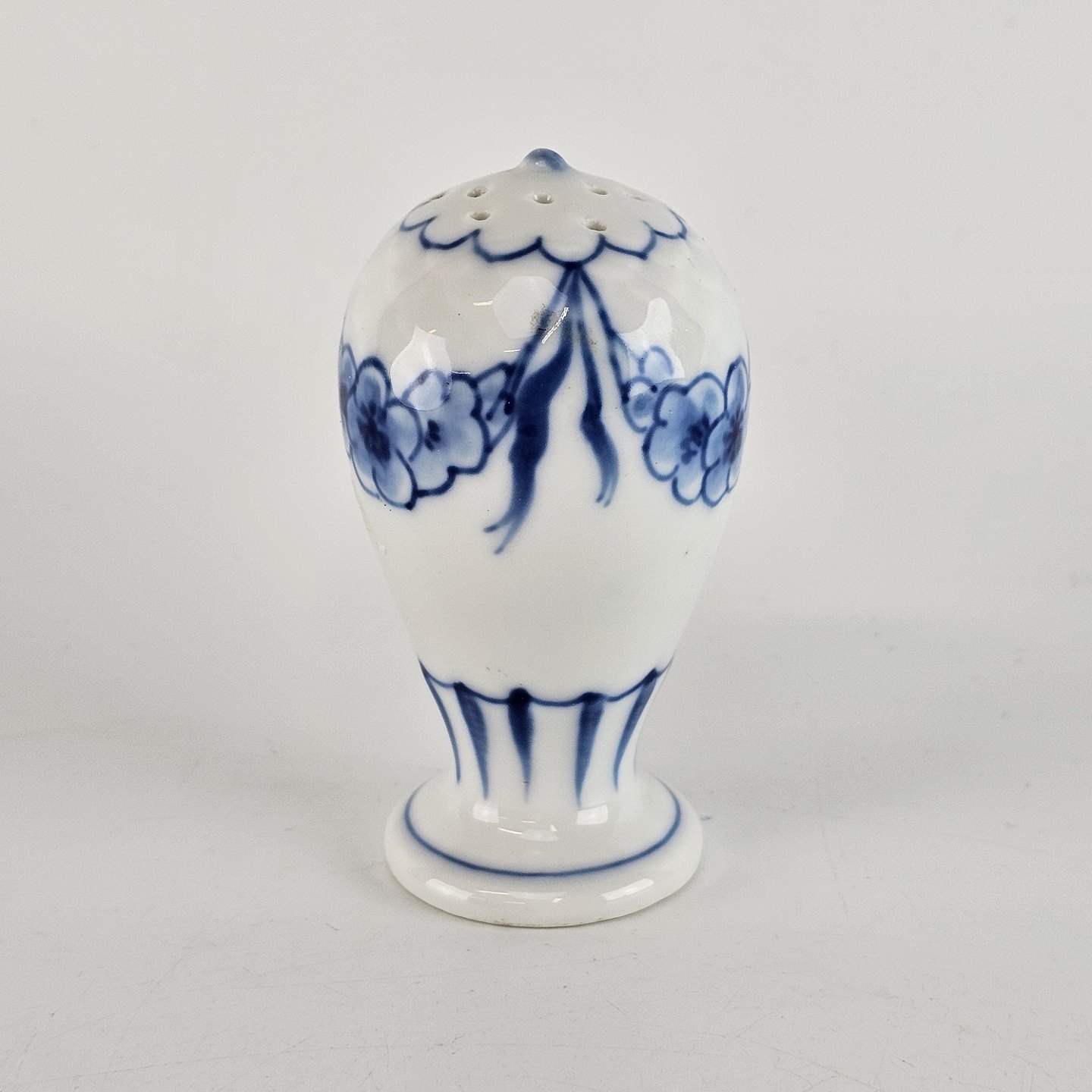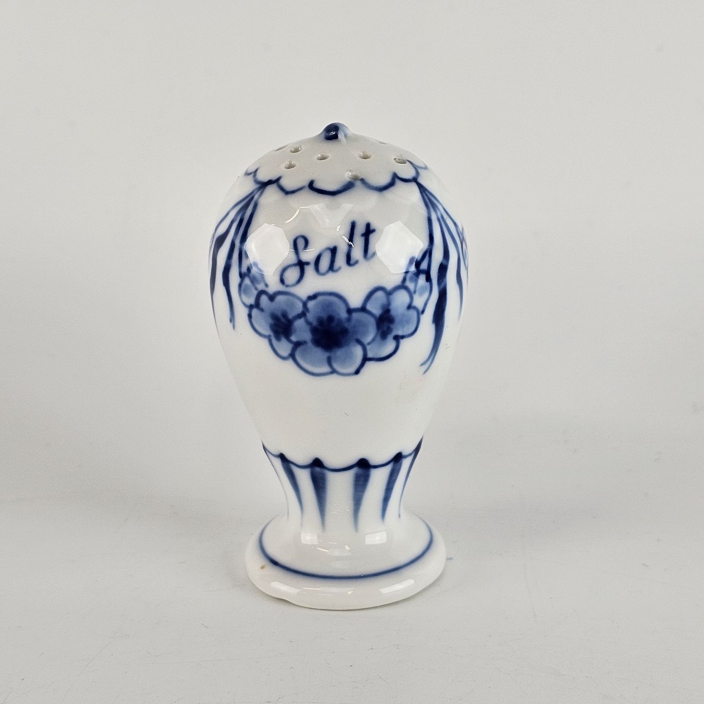 Saltbøsse i hvidt porcelæn med skelform og motiv af guirlander med blå blomster.