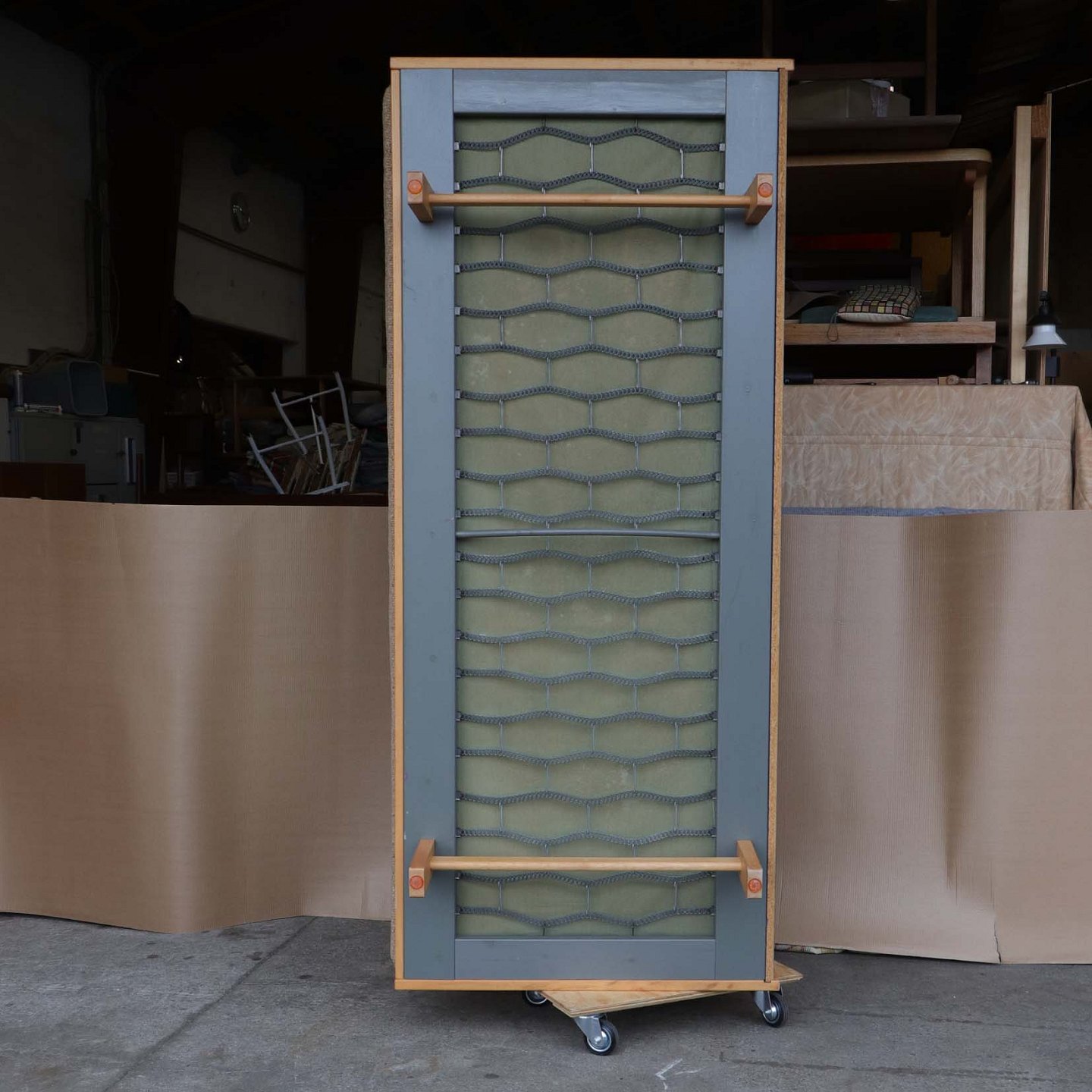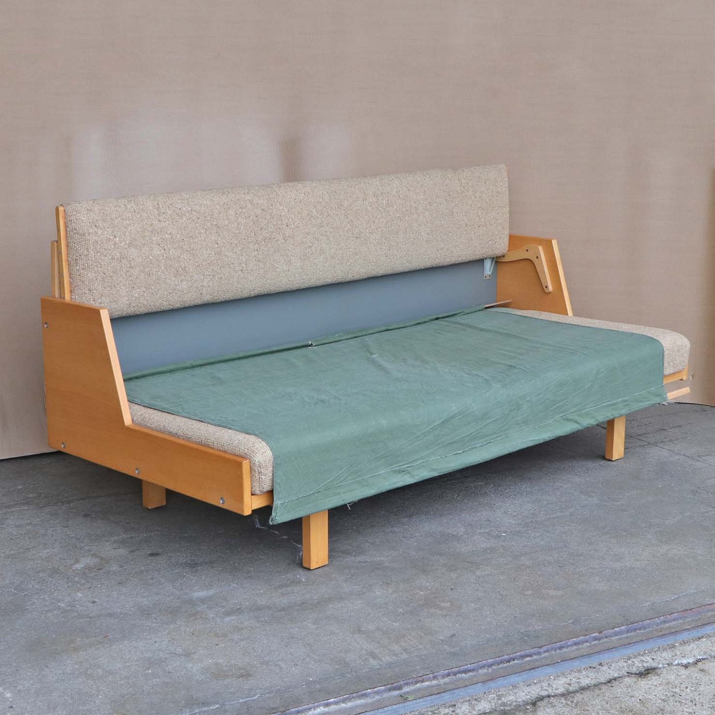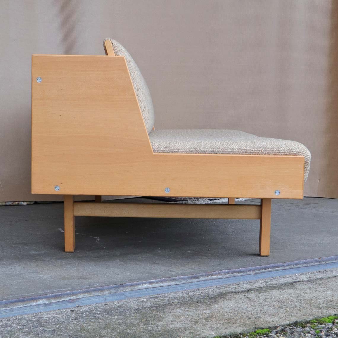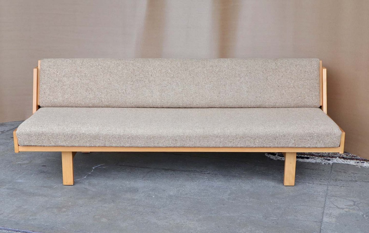 Tre personers sofa med stel i lakeret bøgetræ. Sæde og ryglæn er betrukket med meleret beige uldstof. Model GE-258