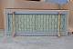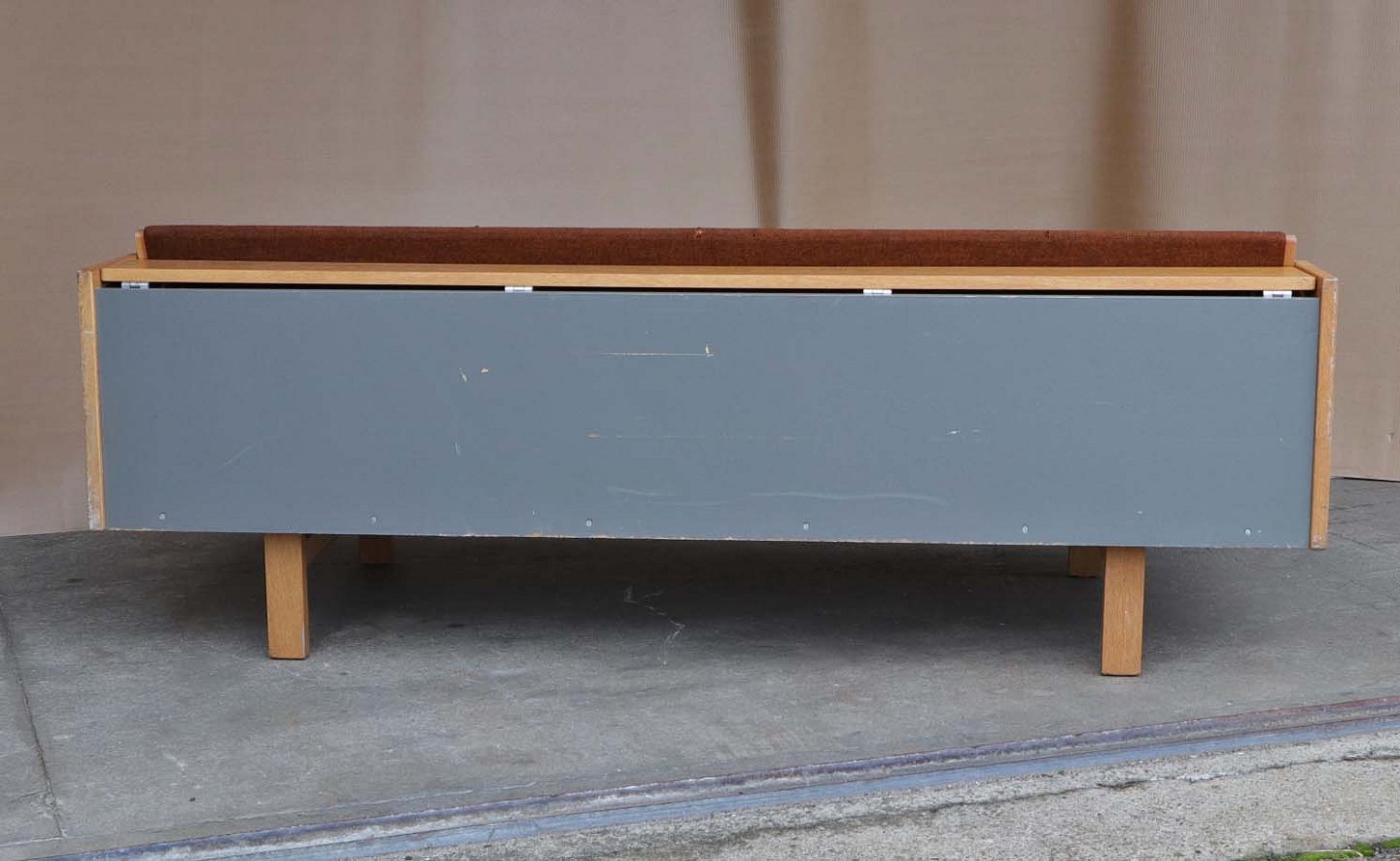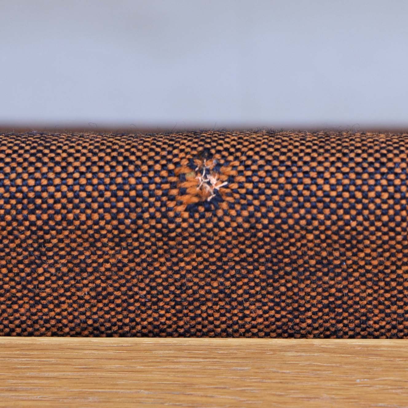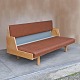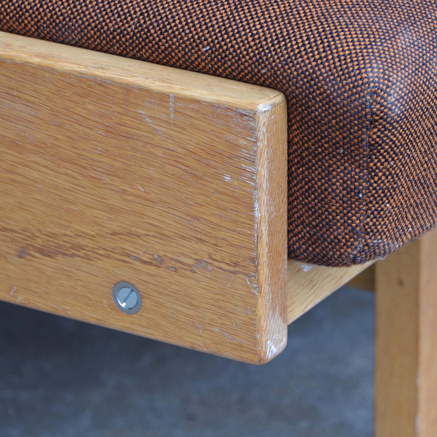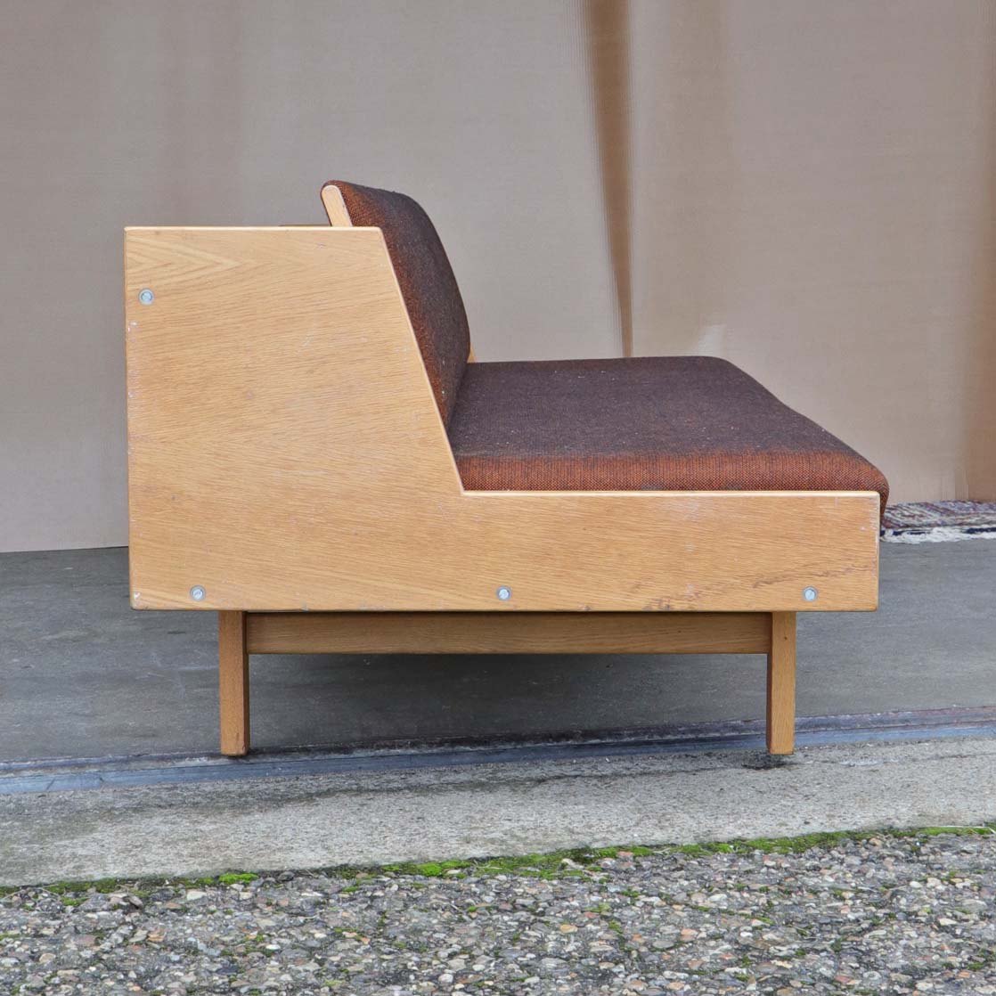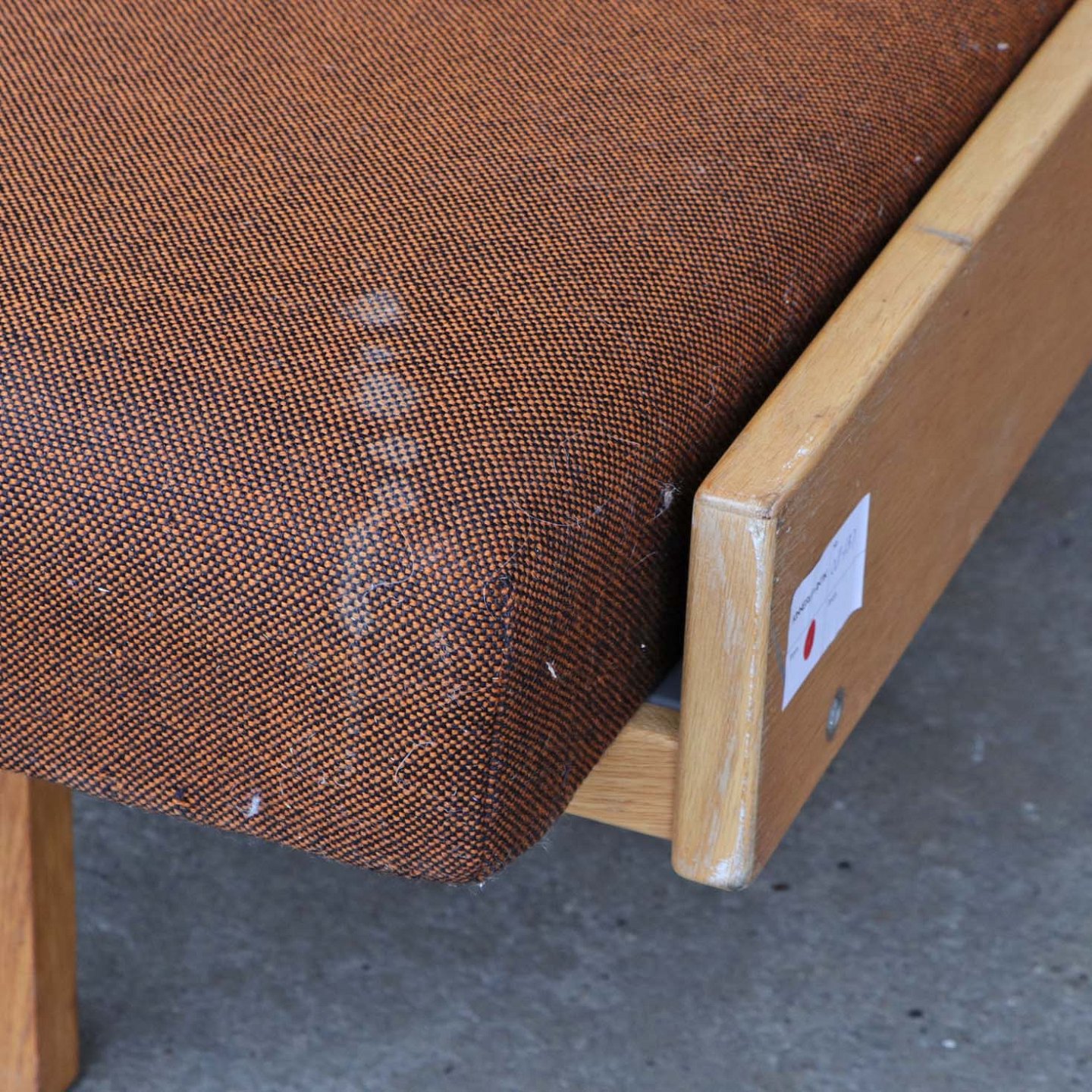 Tre personers sofa med stel i lakeret egetræ. Sæde og ryglæn er betrukket med meleret brunt uldstof. Model GE 258