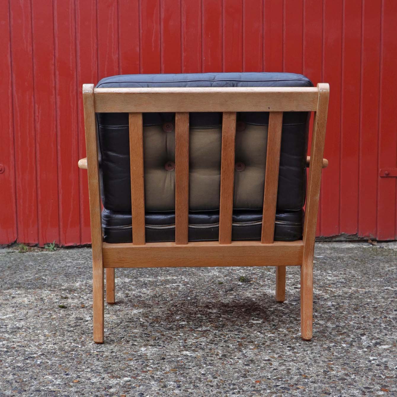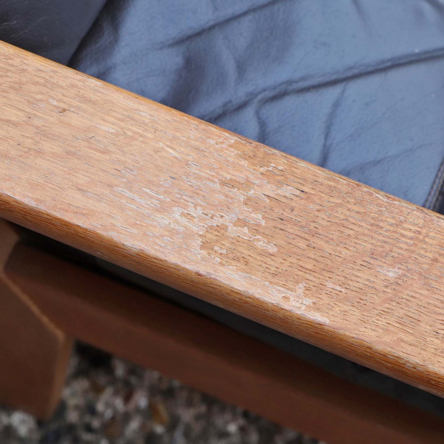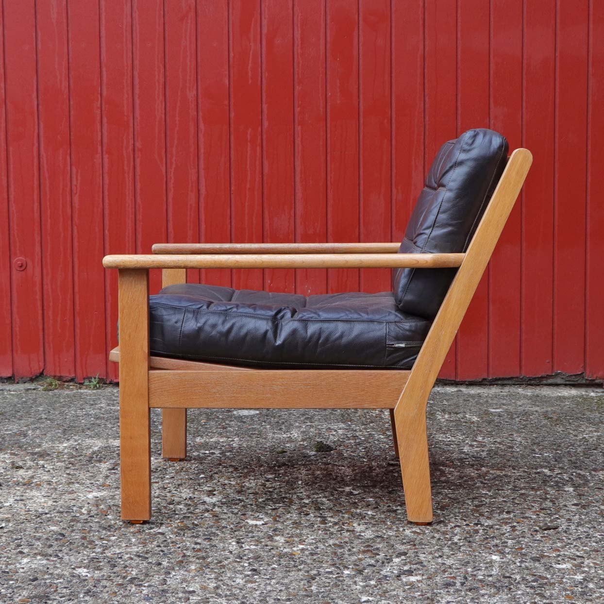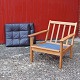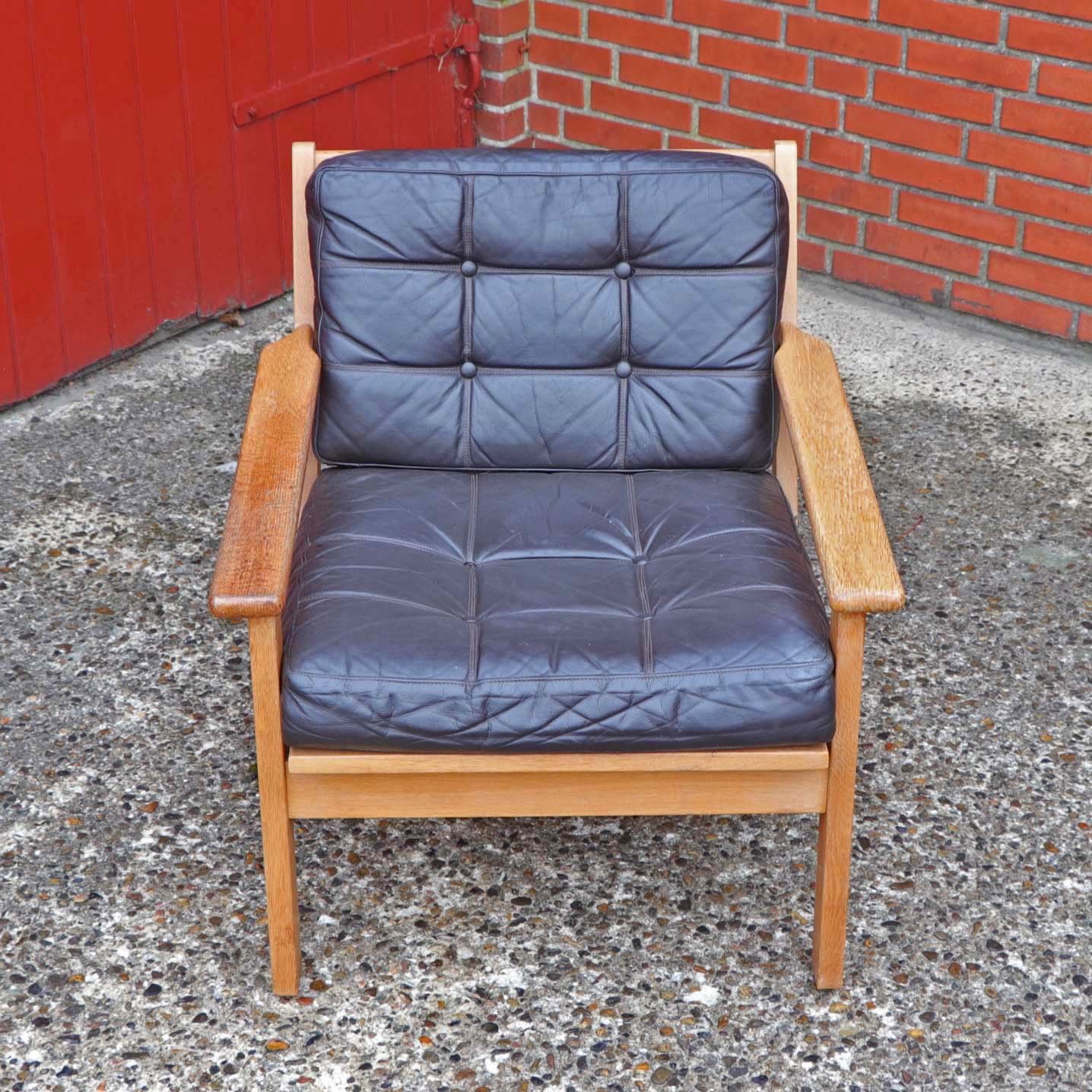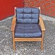 Lav lænestol med stel i lakeret egetræ og hynder betrukket med kaffebrunt læder