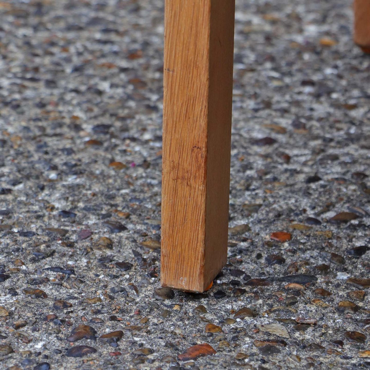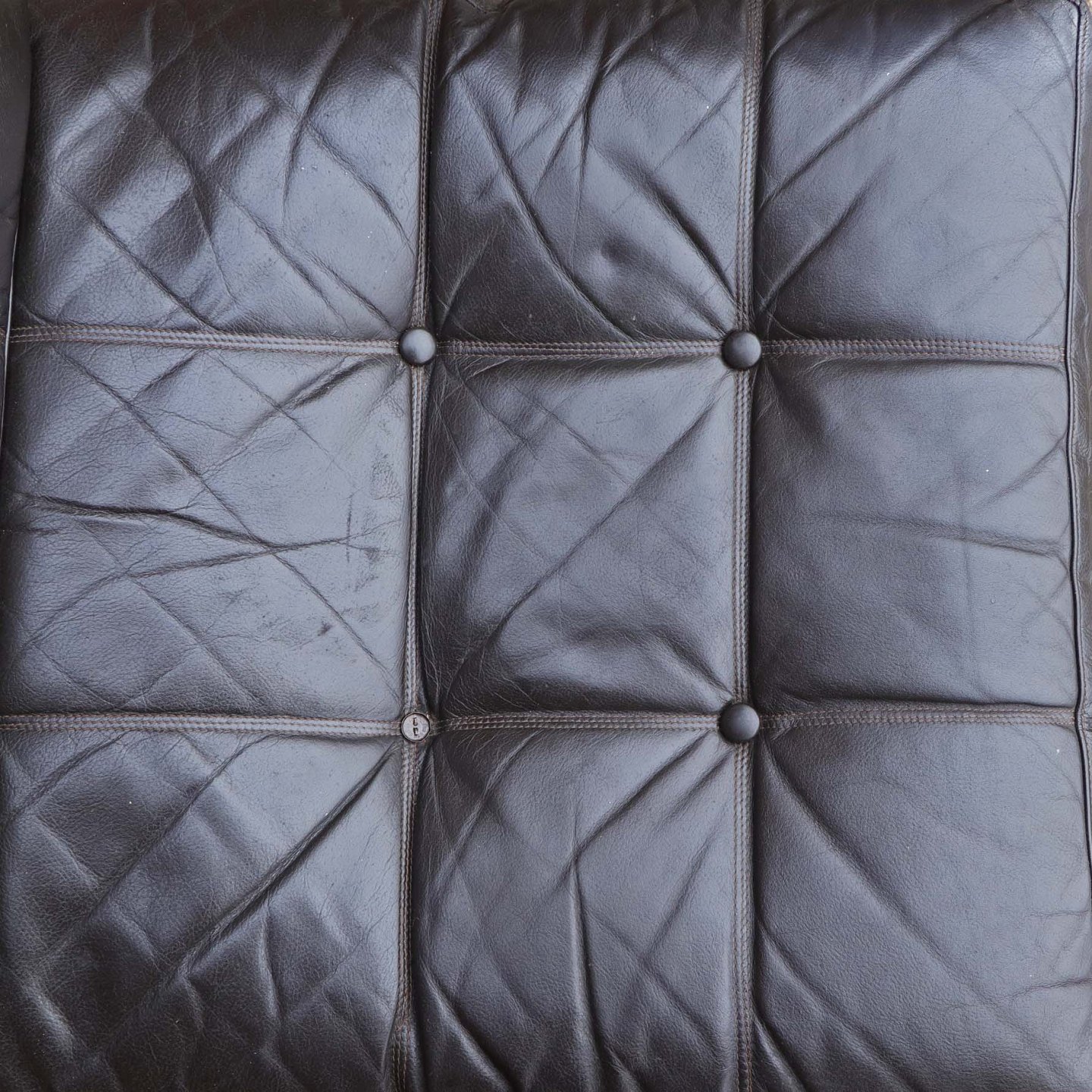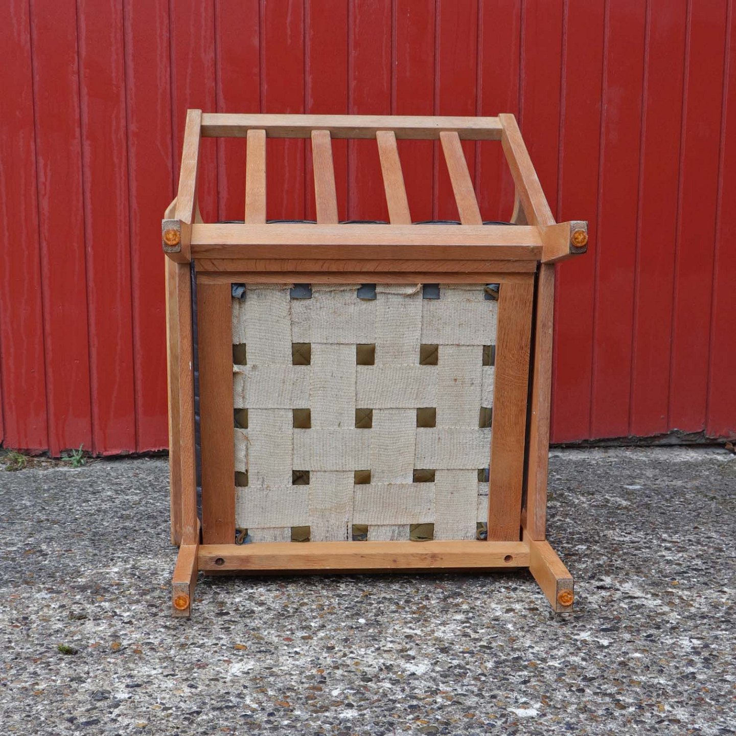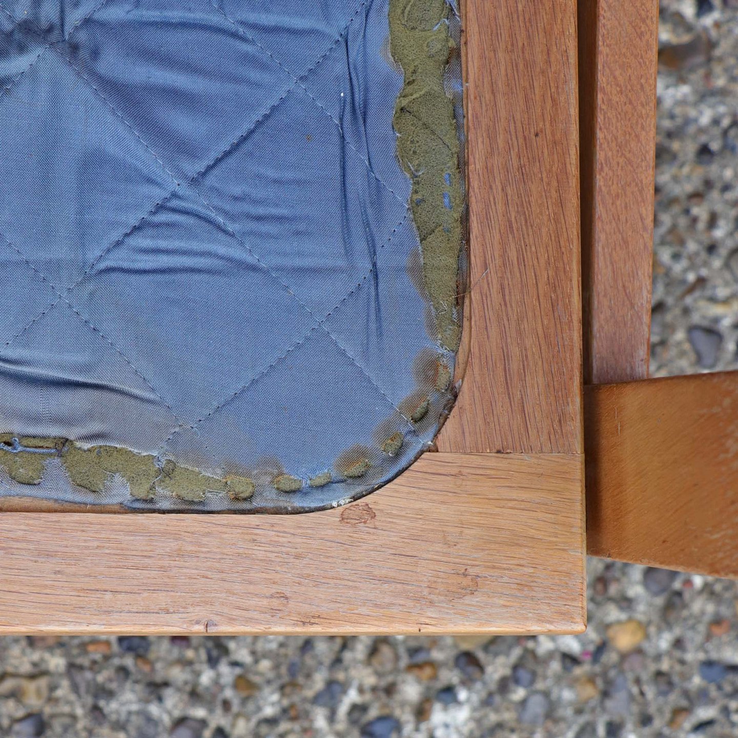 Fremstår med brugsspor på stel og underliggende stof. Mangler toppen af en enkelt knap på sædepuden.