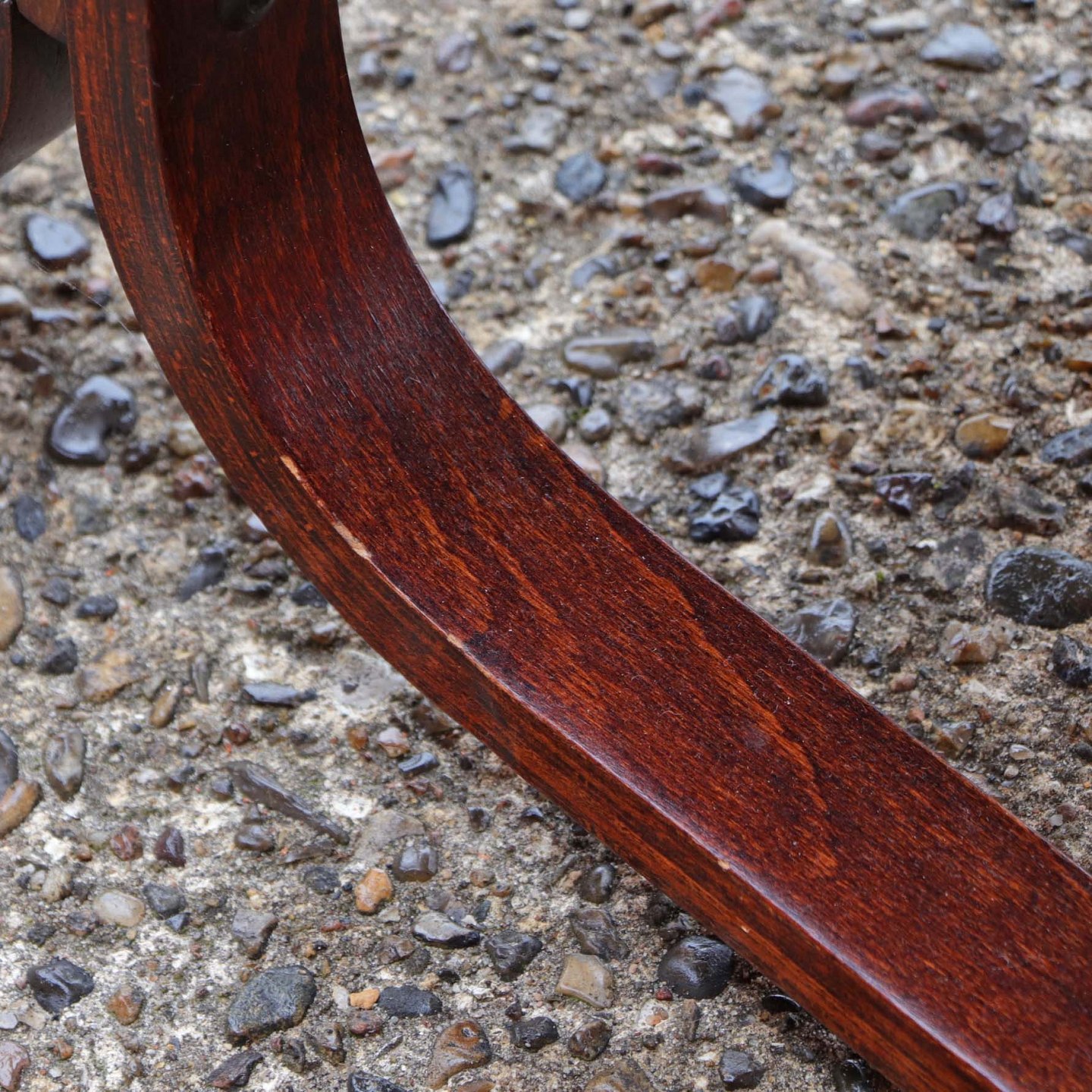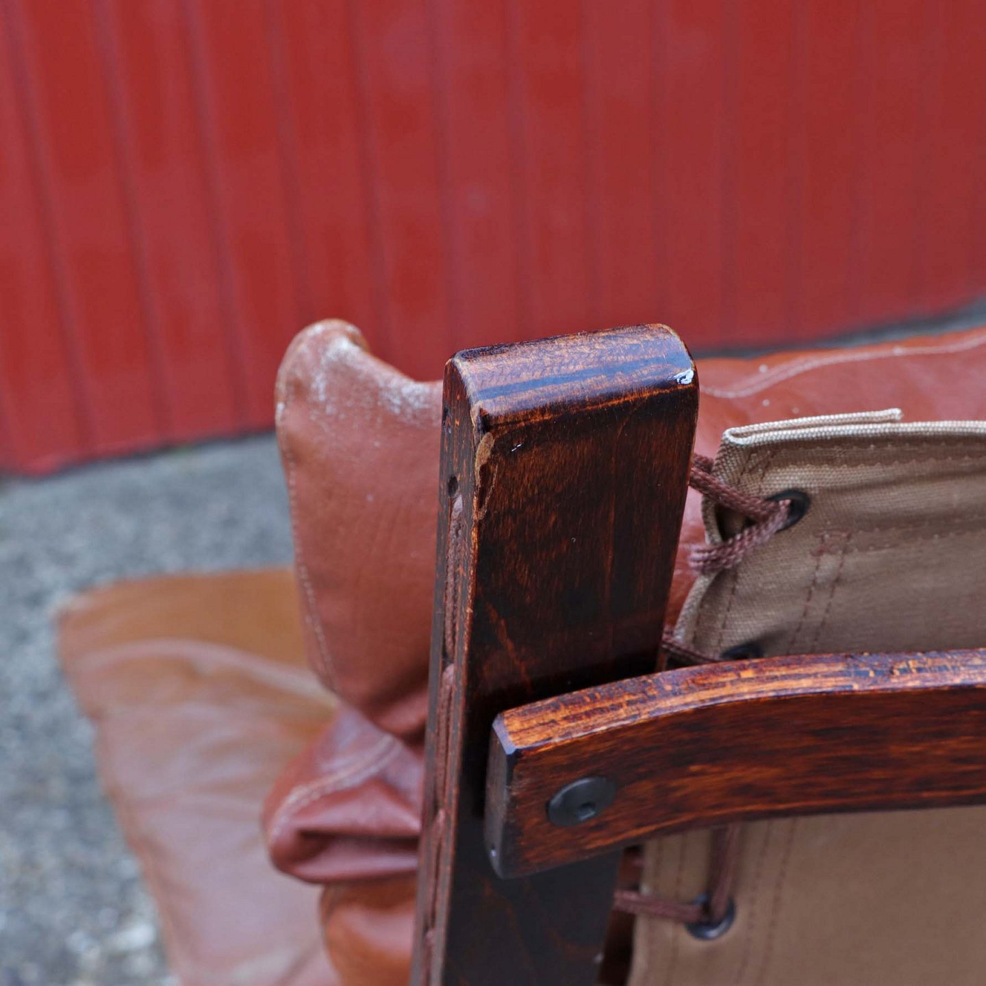 Lænestol med nakkepude og stel i formbøjet lakeret mørkt træ. Stol er betrukket med brunt læder. Model Siesta med høj ryg