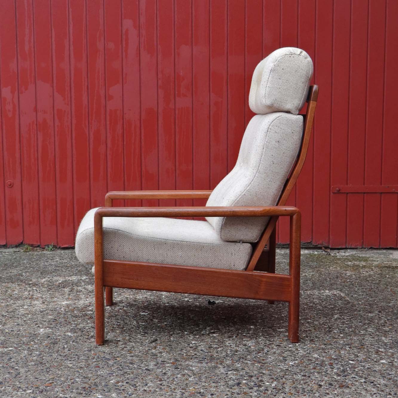 Højrygget lænestol med stel i lakeret teaktræ og hynder betrukket med lyst uldstof.