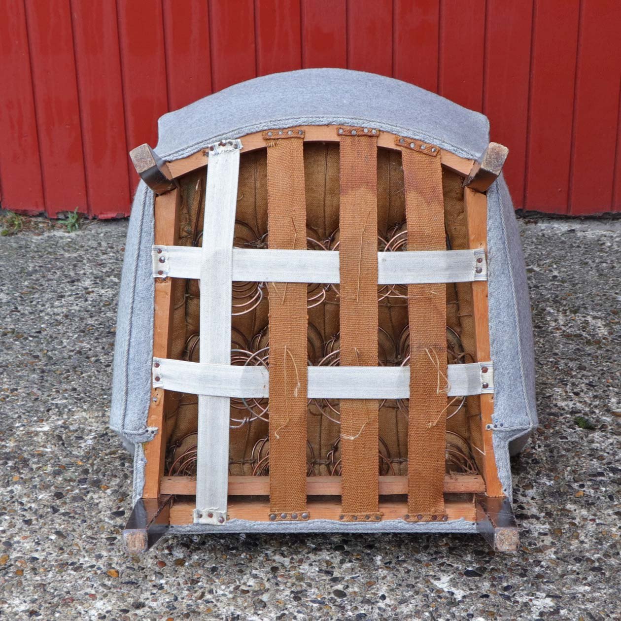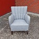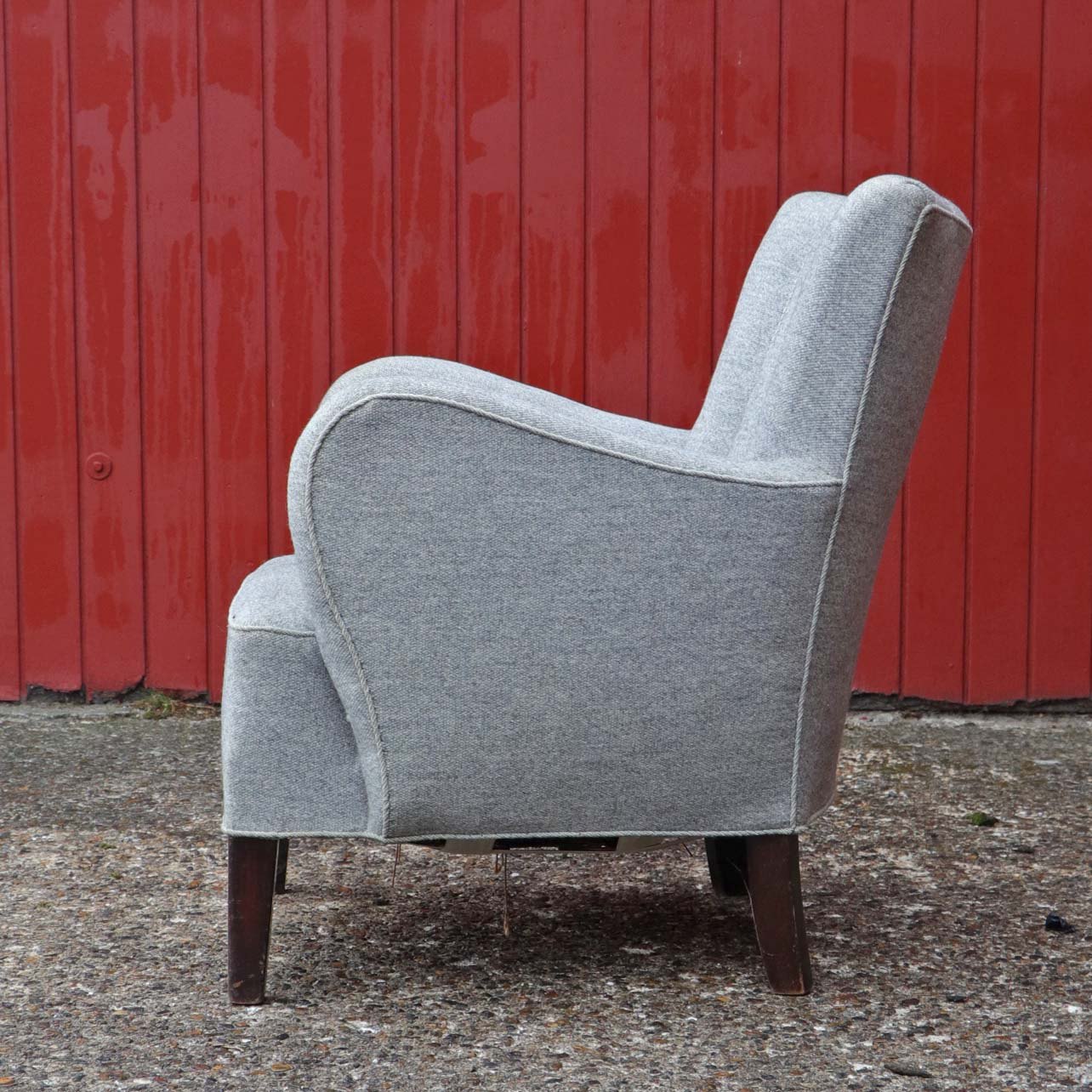 Lænestol med springfjeder sæde og ben i lakeret mørkt træ. Stolen er betrukket med lysegrå uldstof.