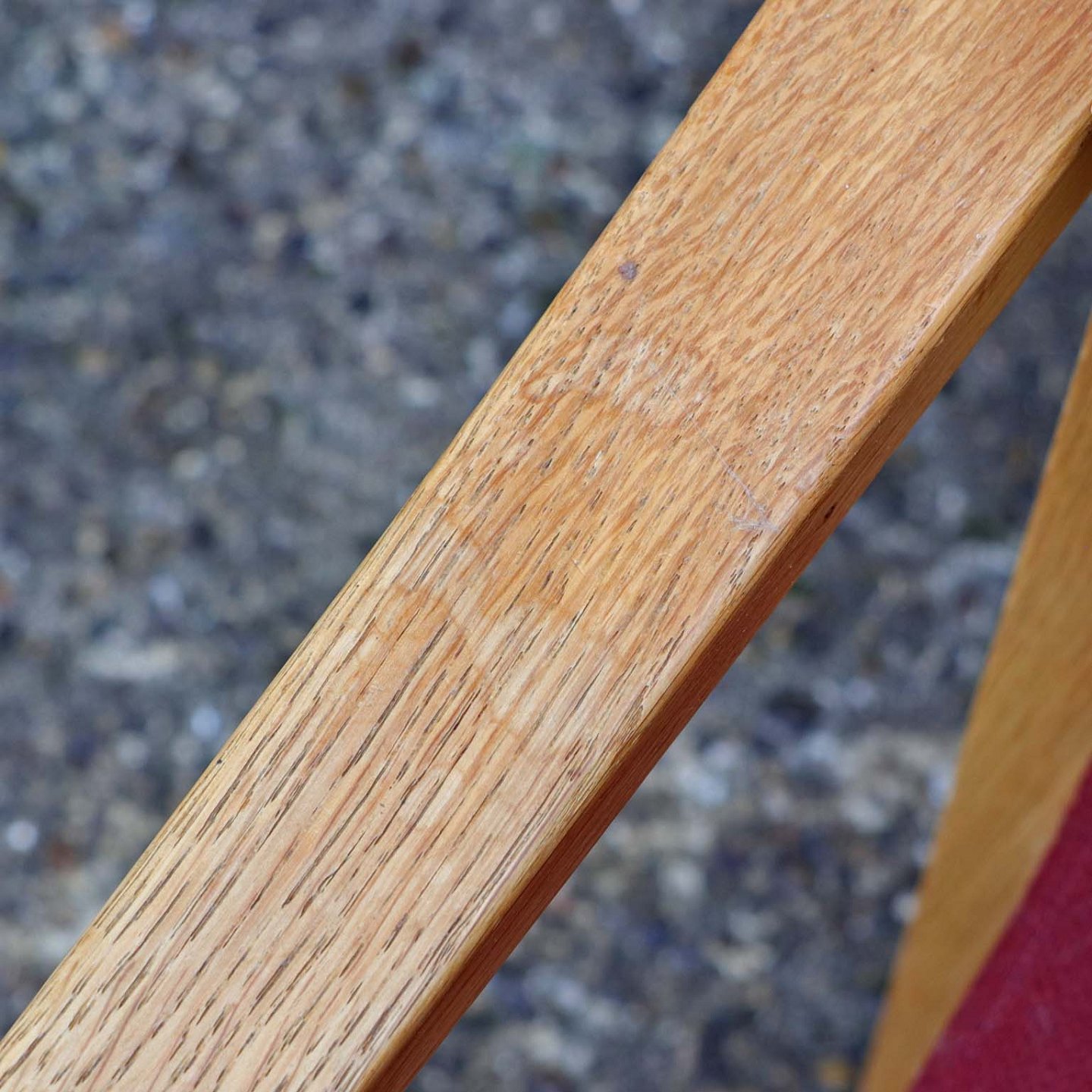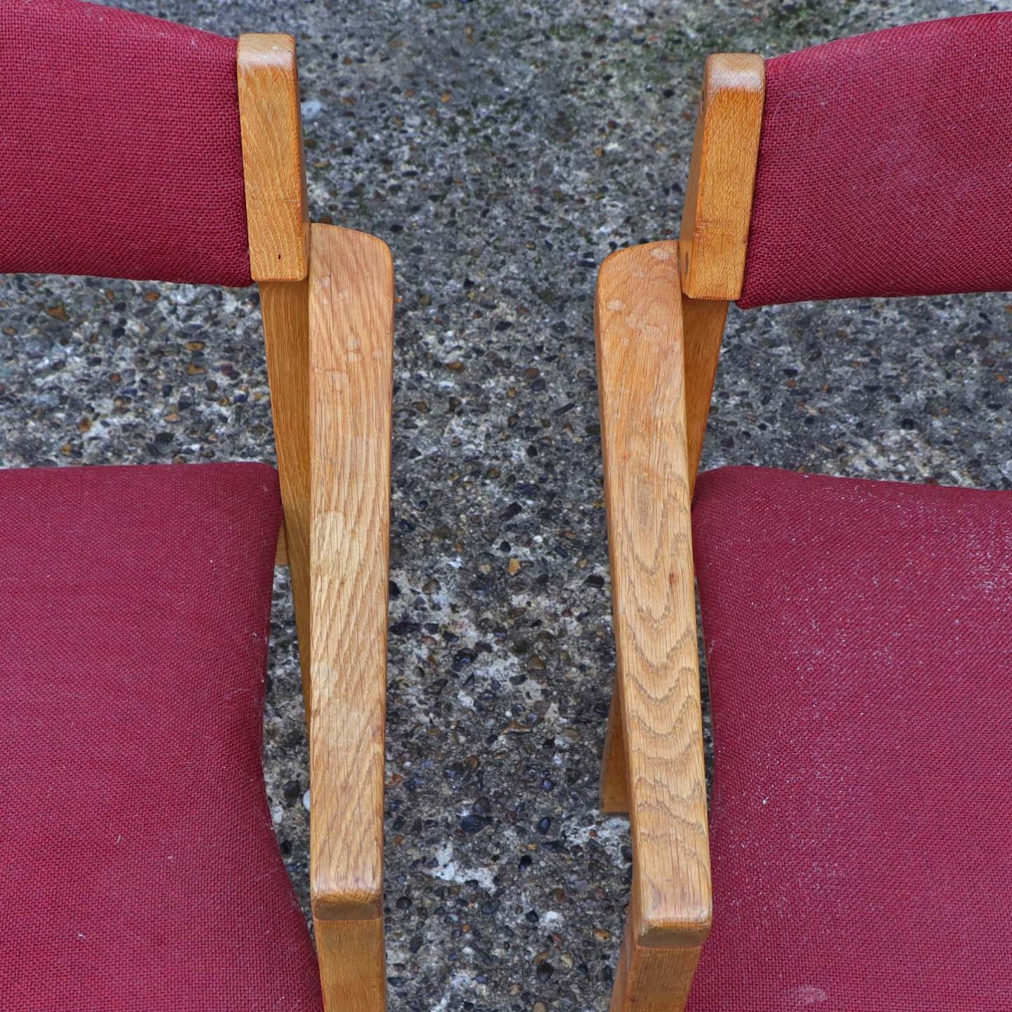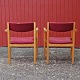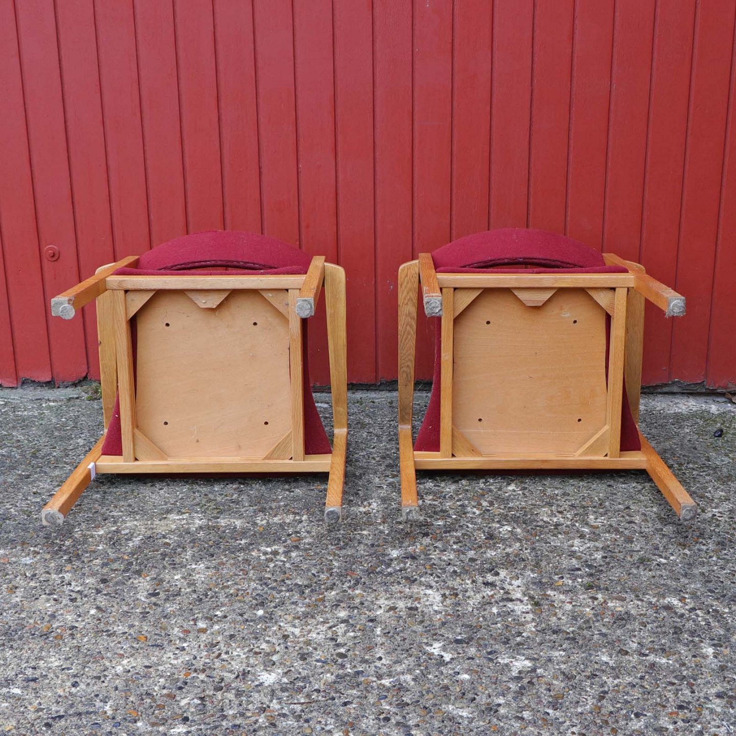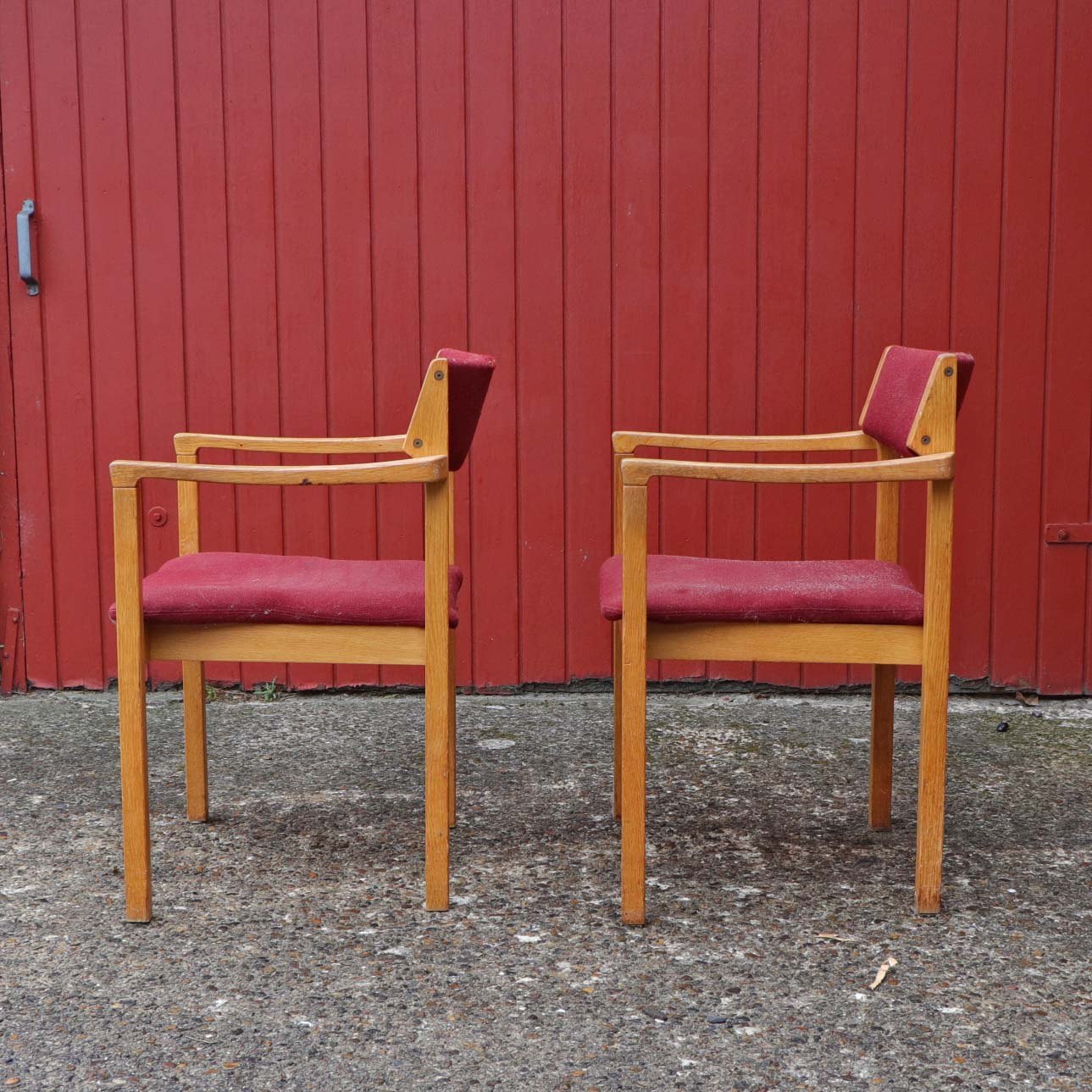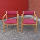 To stole med armlæn og stel i lakeret egetræ. Stolene har polstreret ryg og sæde betrukket med bordeaux uldstof