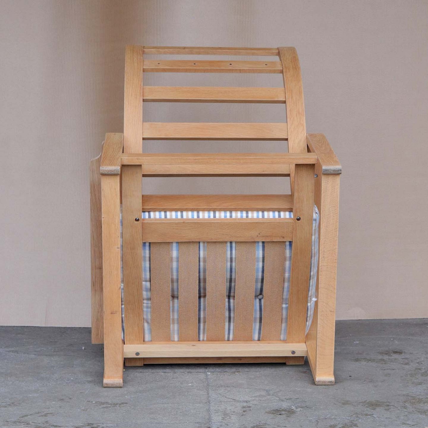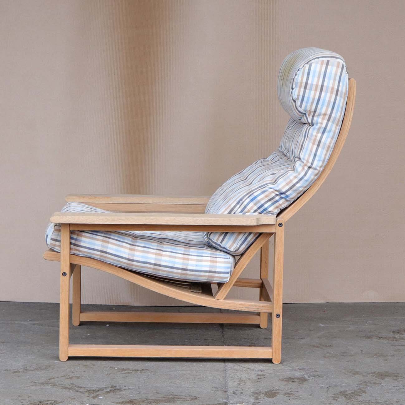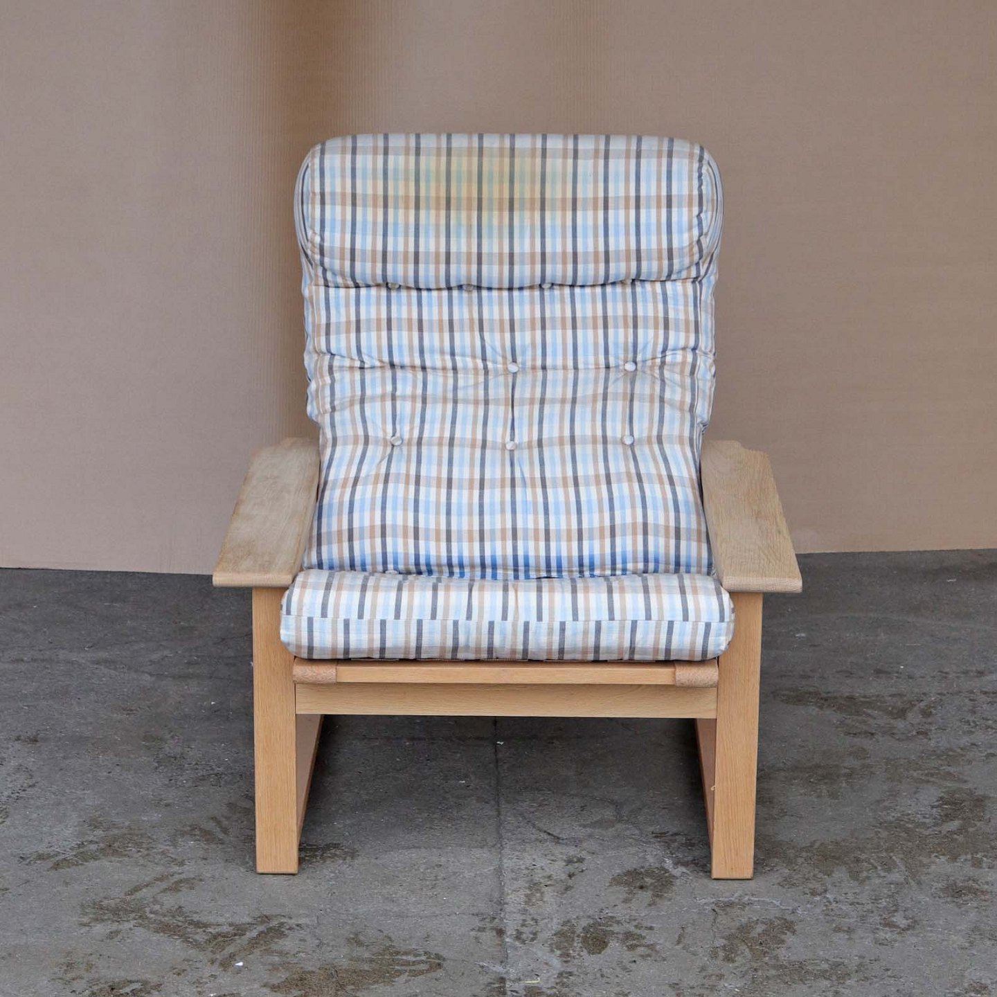 Lænestol med stel i egetræ i flot stand og hynder betrukket med ternet stof med brugsspor
