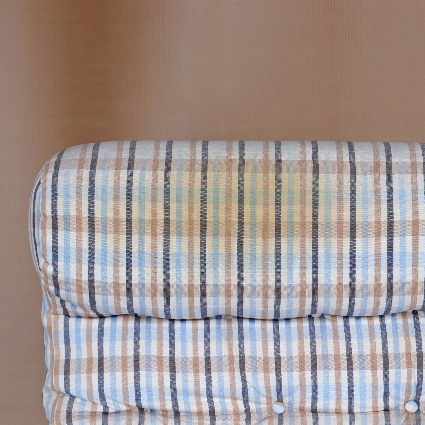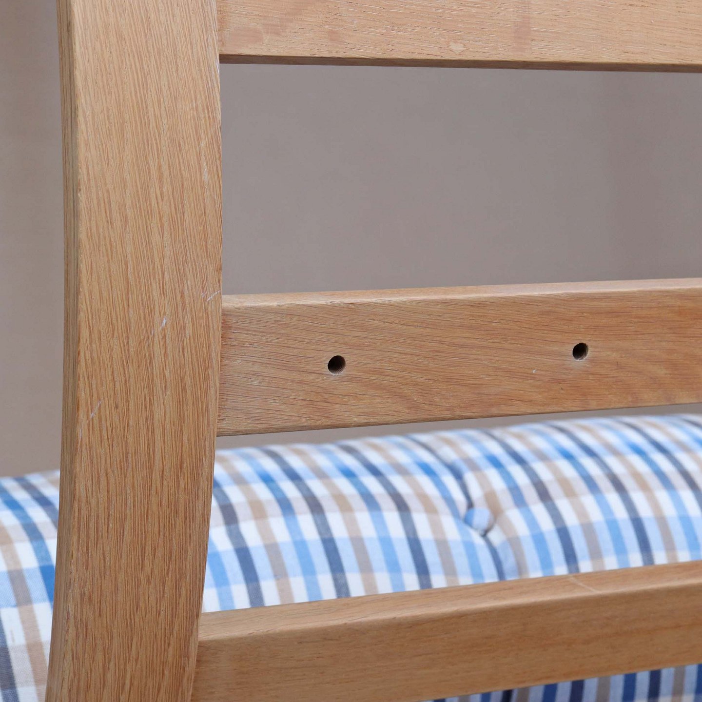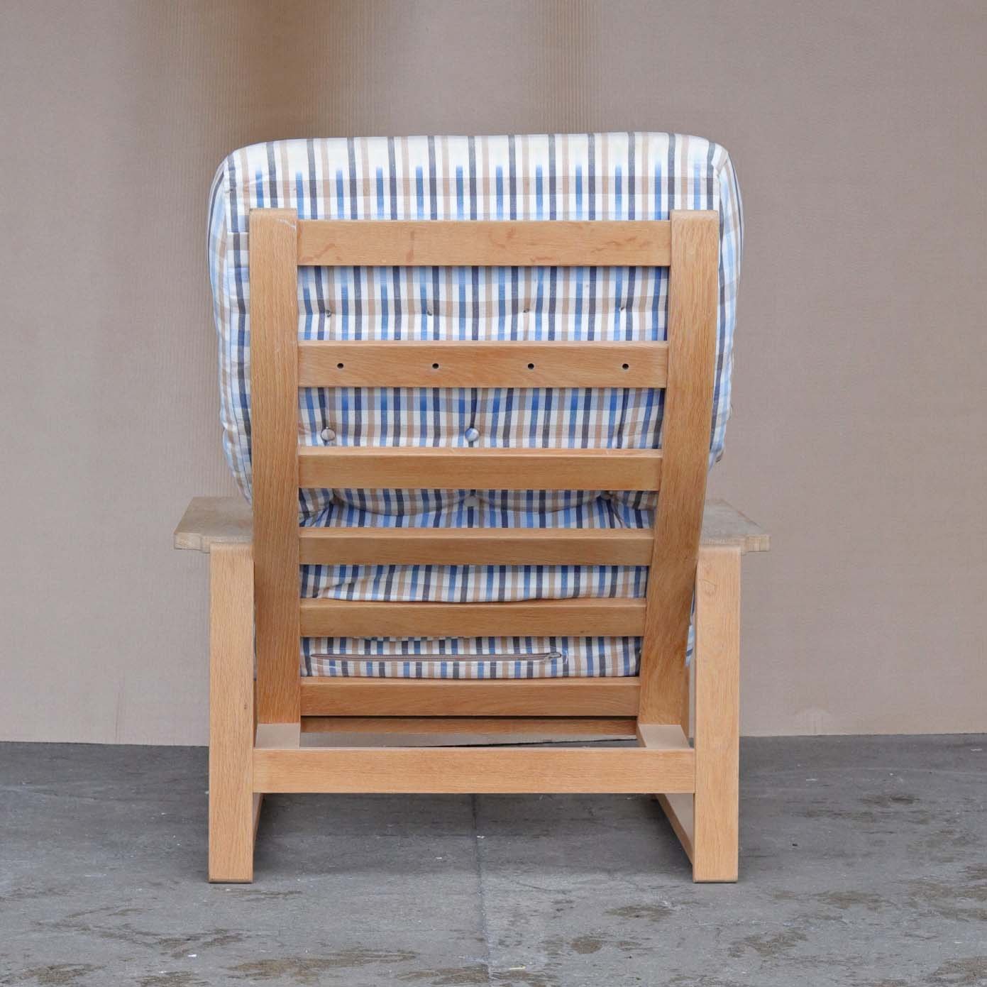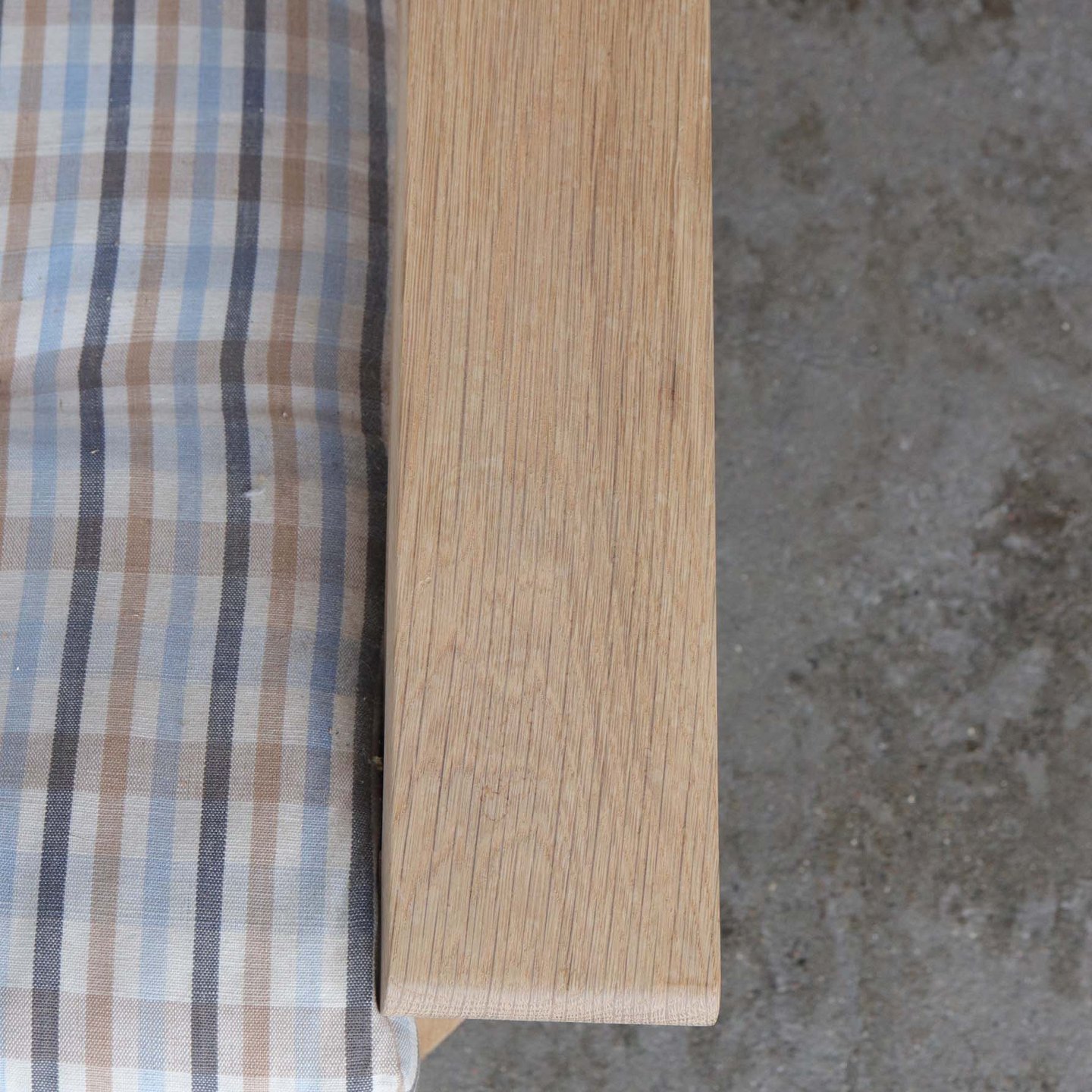 Lænestol med stel i egetræ i flot stand og hynder betrukket med ternet stof med brugsspor