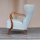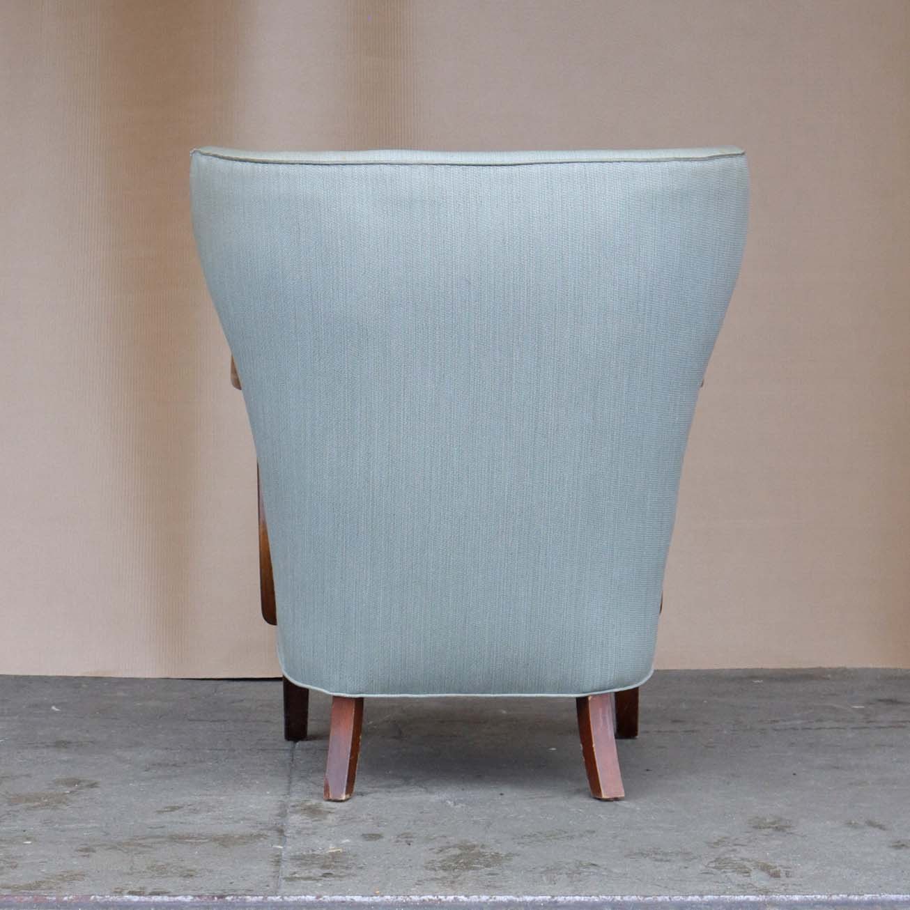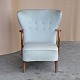 Ældre lænestol med stel i mørk lakeret træ. Stolen er betrukket med sartgrøn uldstof og har sæde med springfjeder