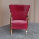 Ældre lænestol med stel i lakeret bøgetræ. Stolen har springfjeder sæde og er betrukket med struktureret rødt stof