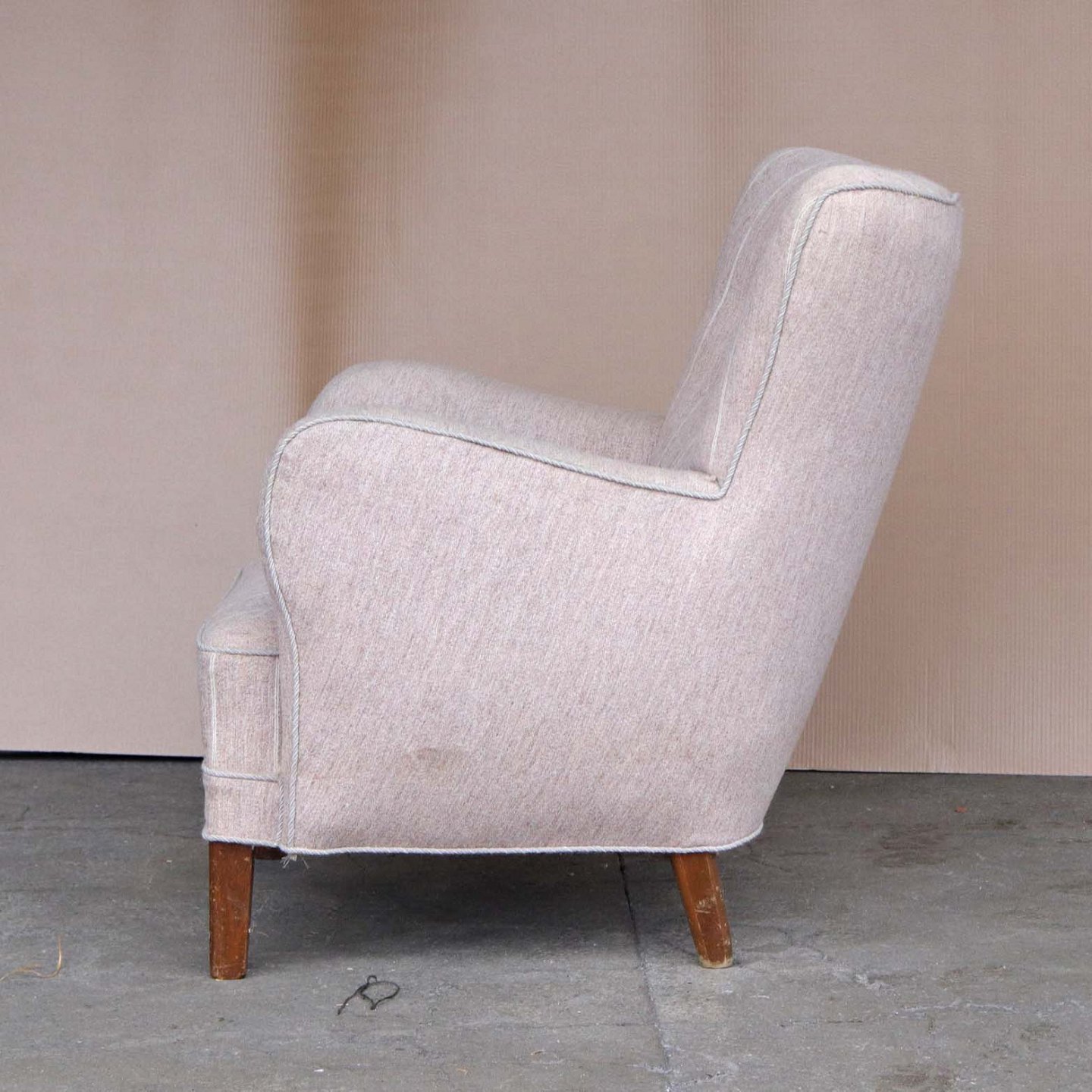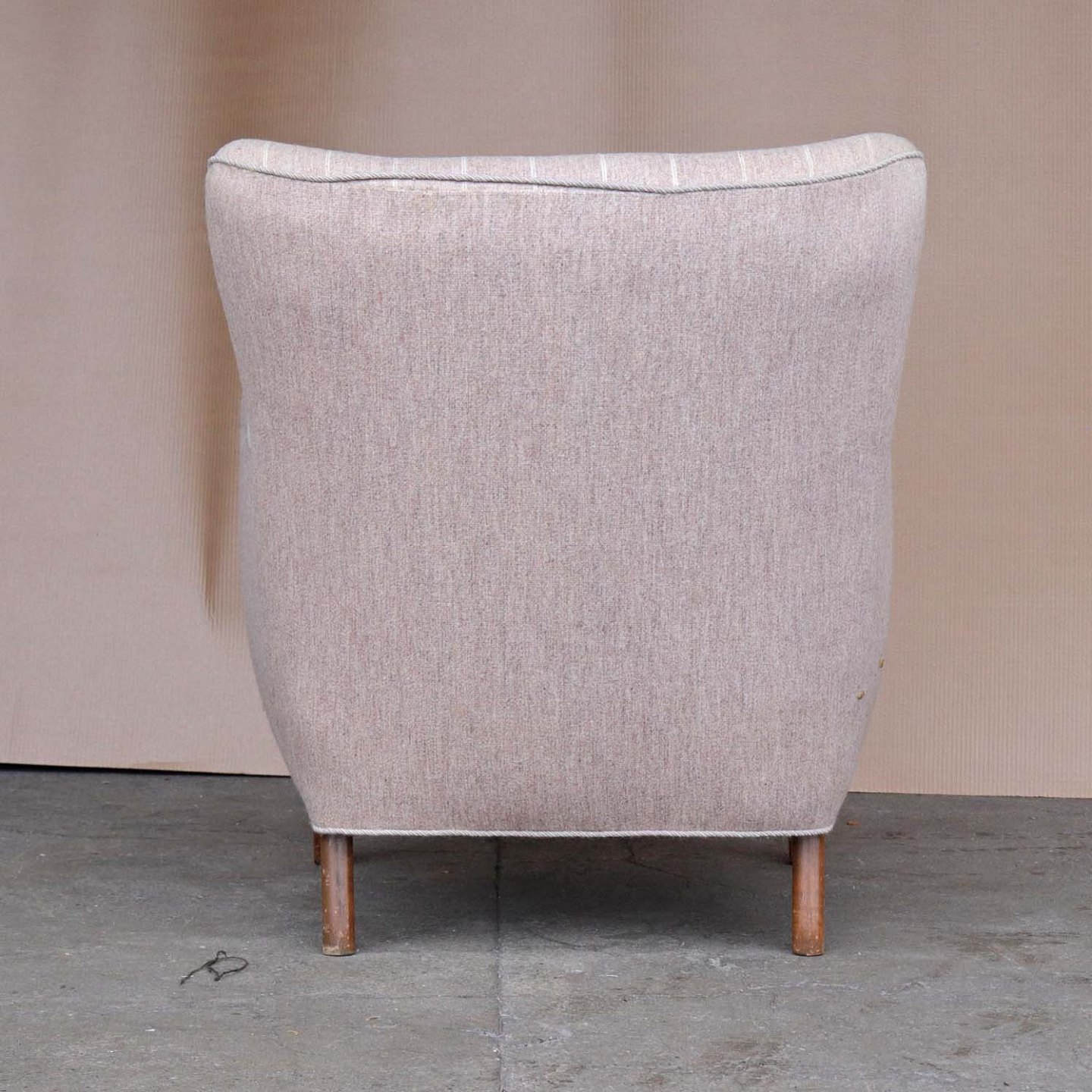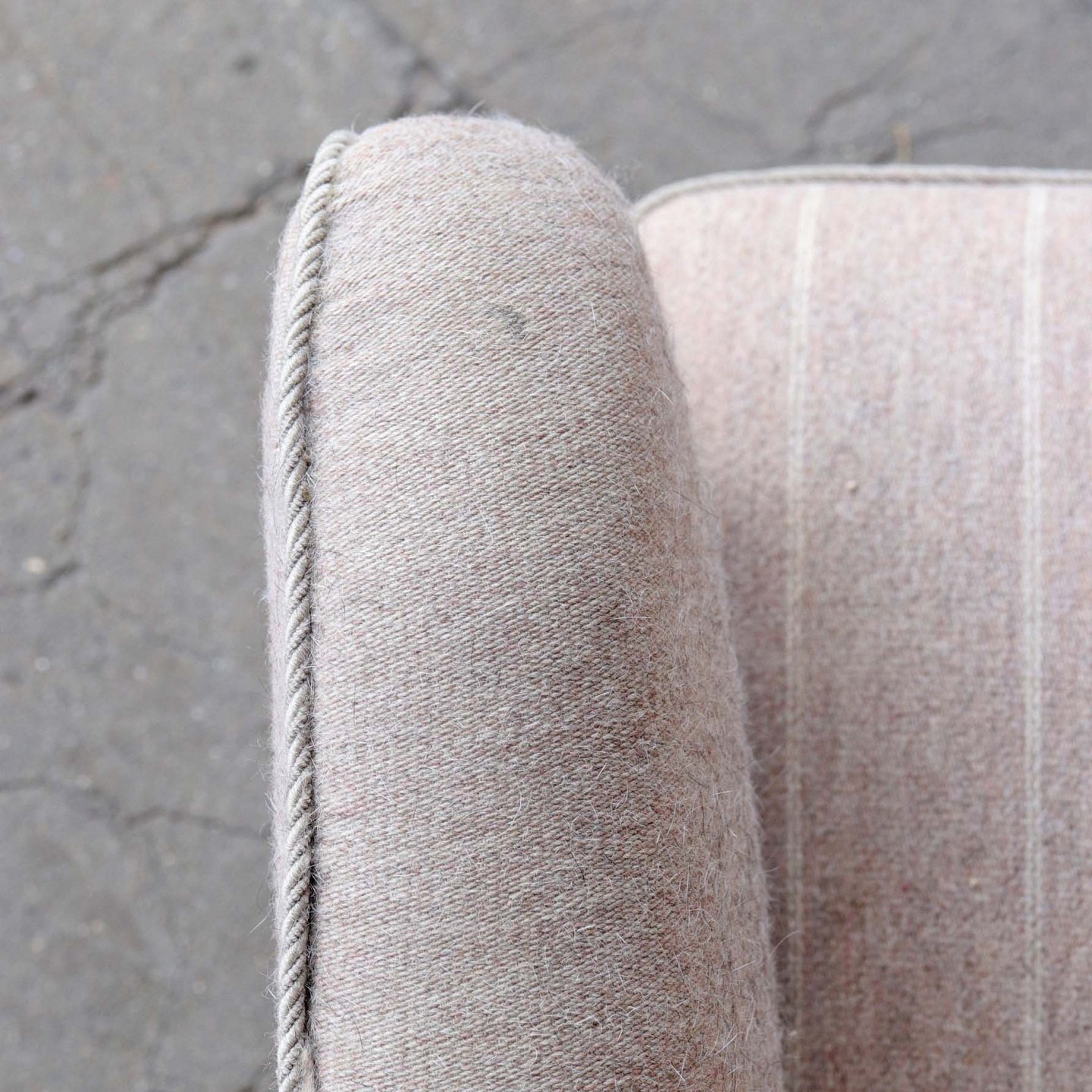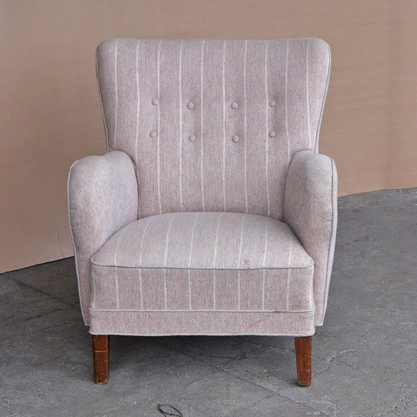 Ældre polstret lænestol med stel i lakeret træ. Stolen er betrukket med stribet hvid og beigefarvet uldstof og har sæde med springfjeder