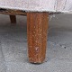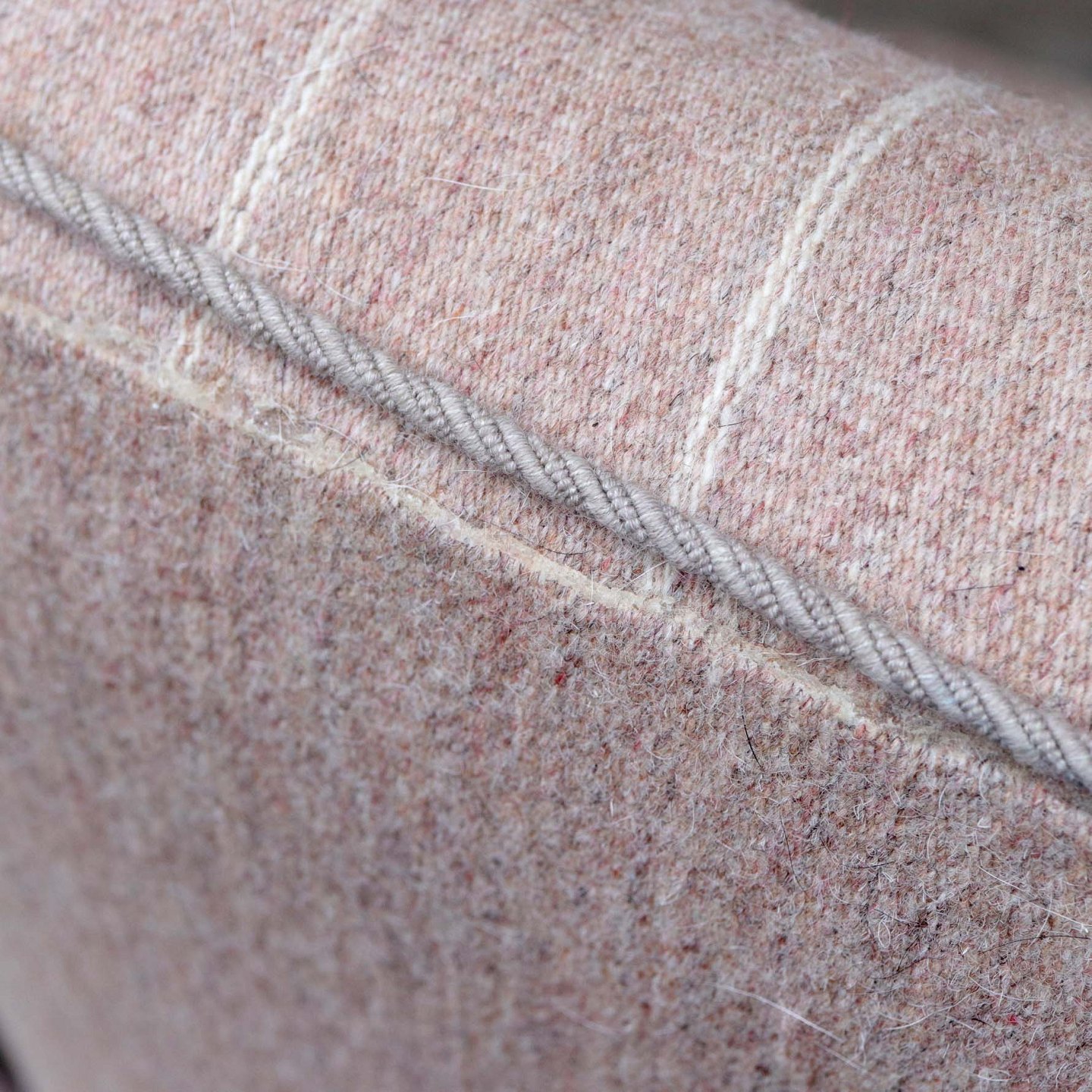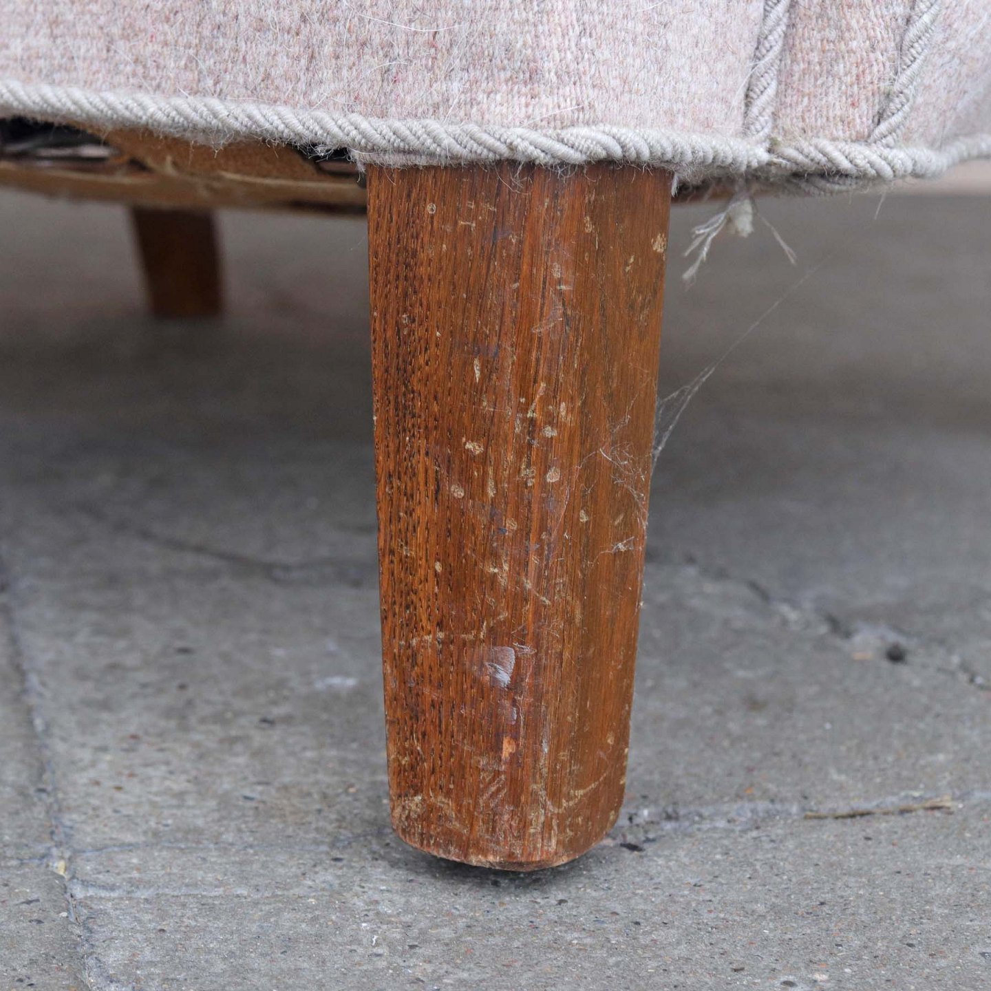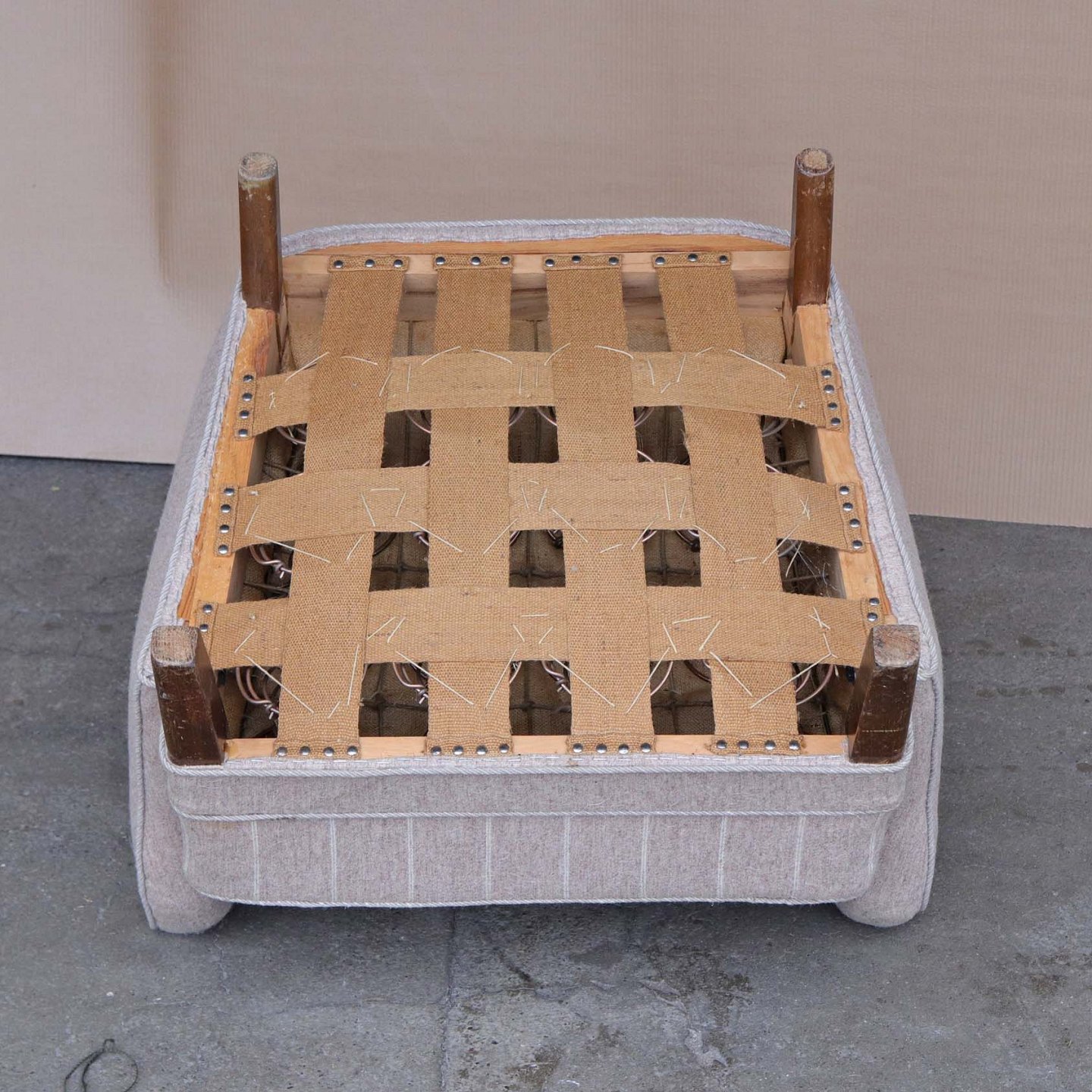 Ældre polstret lænestol med stel i lakeret træ. Stolen er betrukket med stribet hvid og beigefarvet uldstof og har sæde med springfjeder