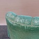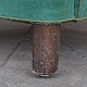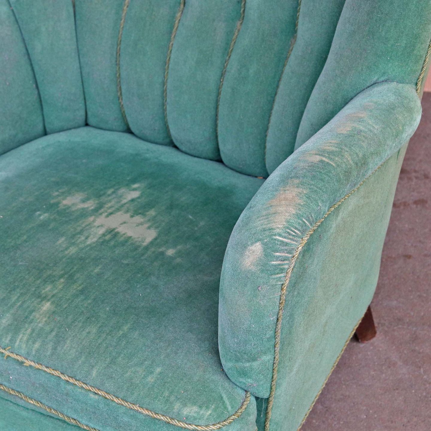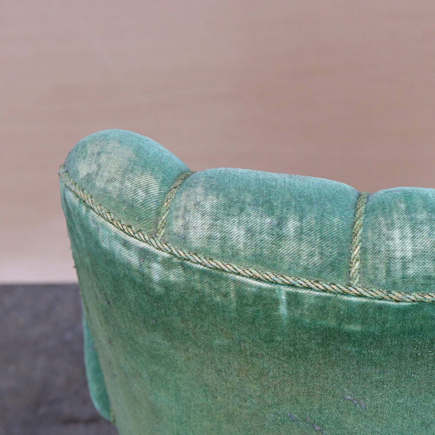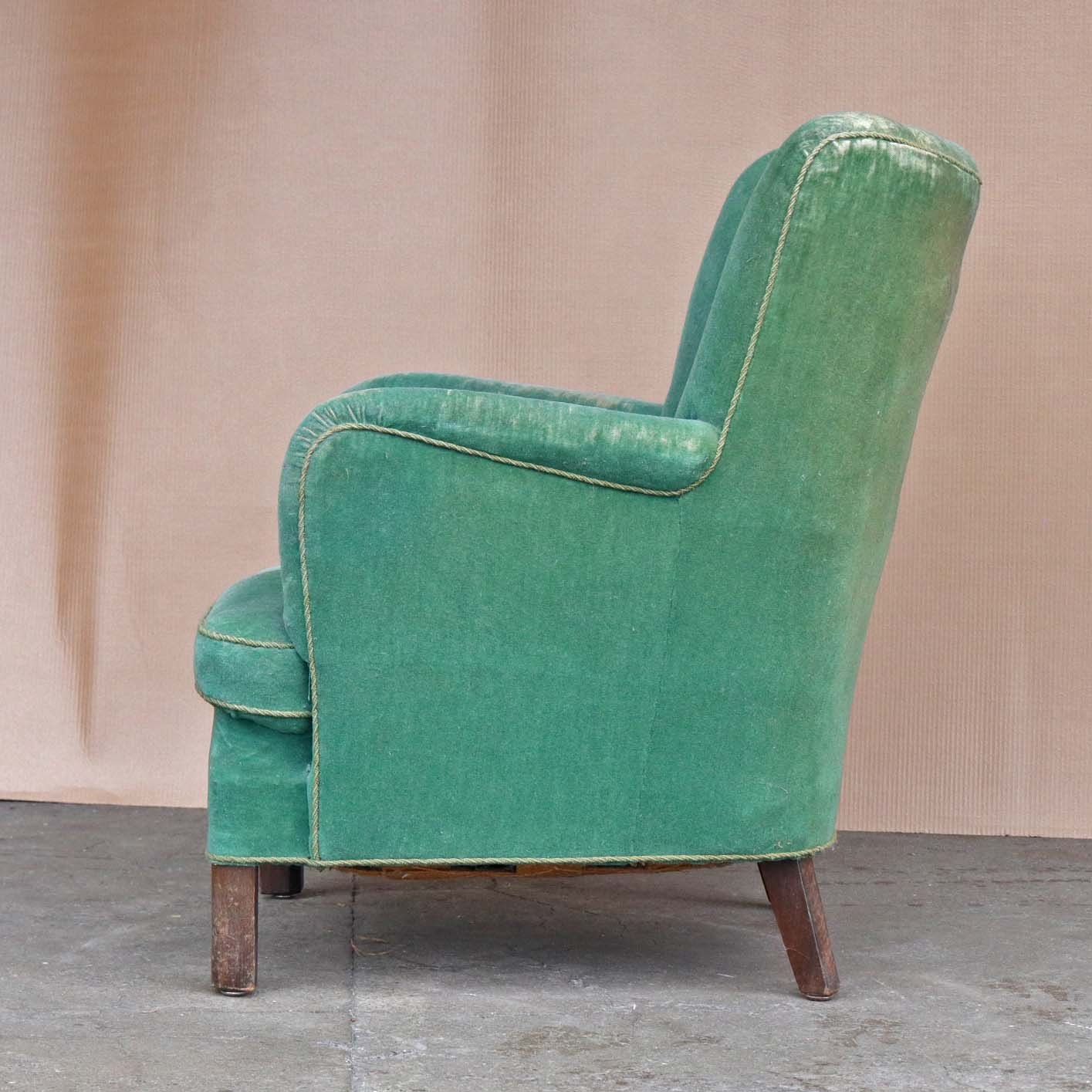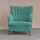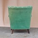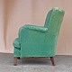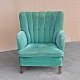 Ældre polstret lænestol med stel i mørk lakeret træ. Stolen er betrukket med grøn velourstof og har sæde med springfjeder