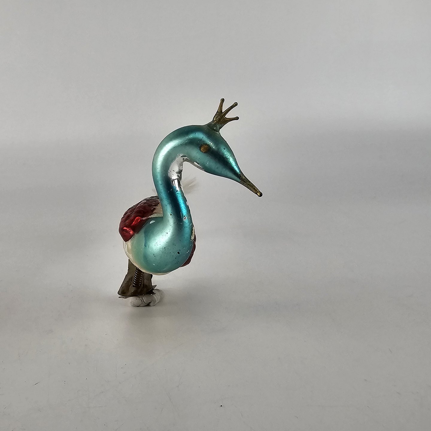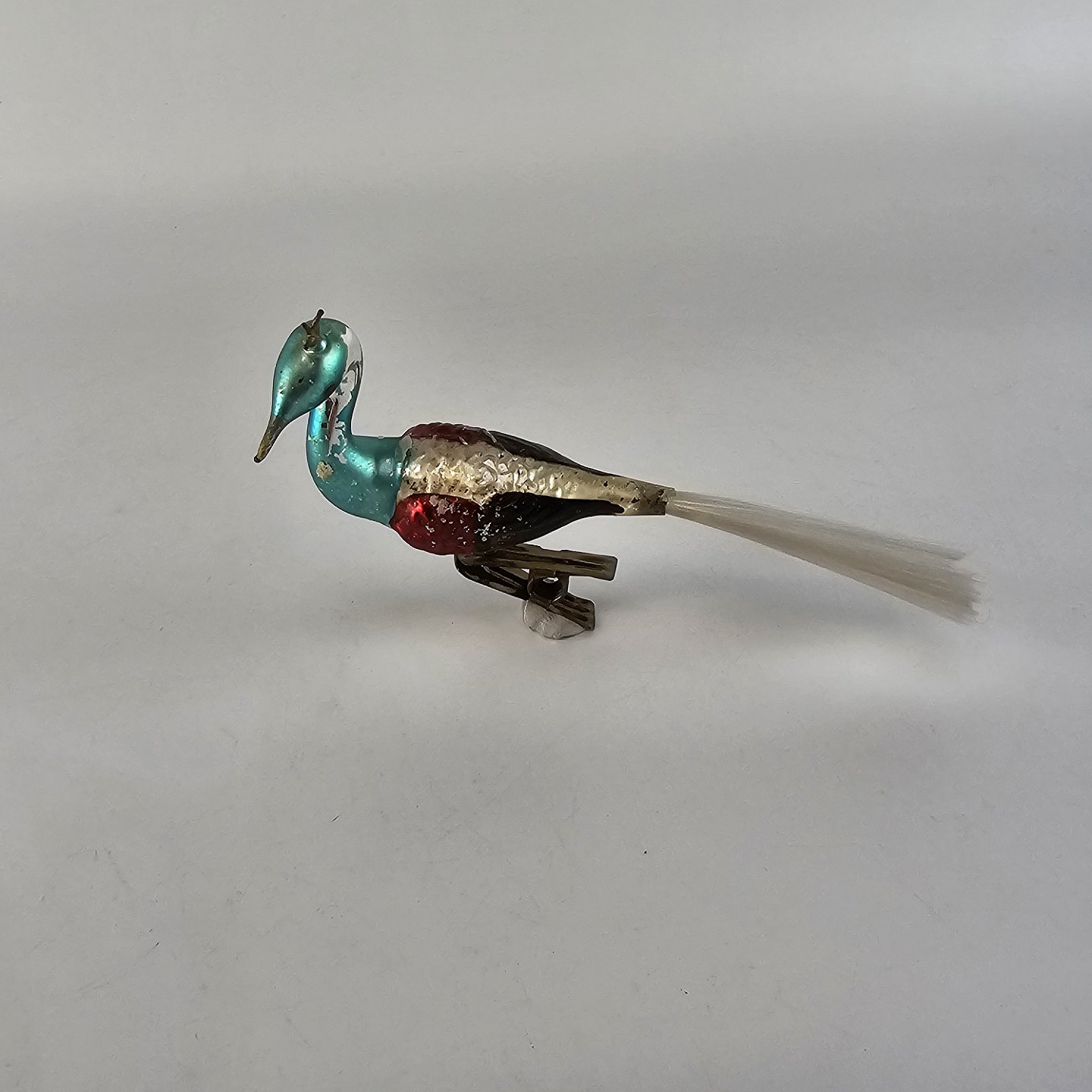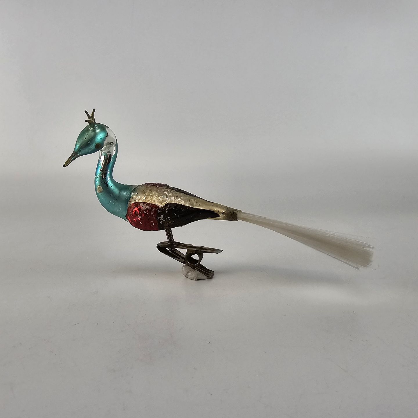 Gammelt glasornament til juletræet. Påfugl med krone på.