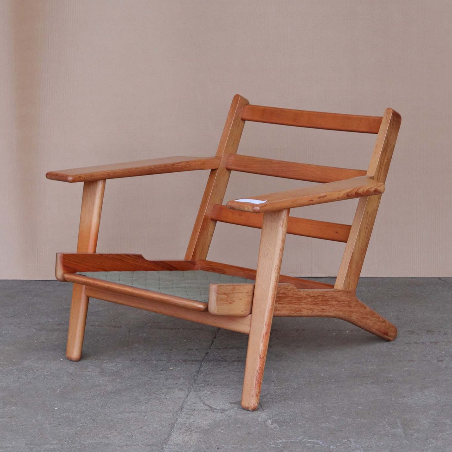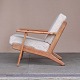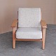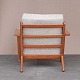 Lænestol med stel i lakeret lyst teaktræ og hynder med springfjeder. Hynderne er betrukket med meleret råhvidt uldstof. Model GE 290