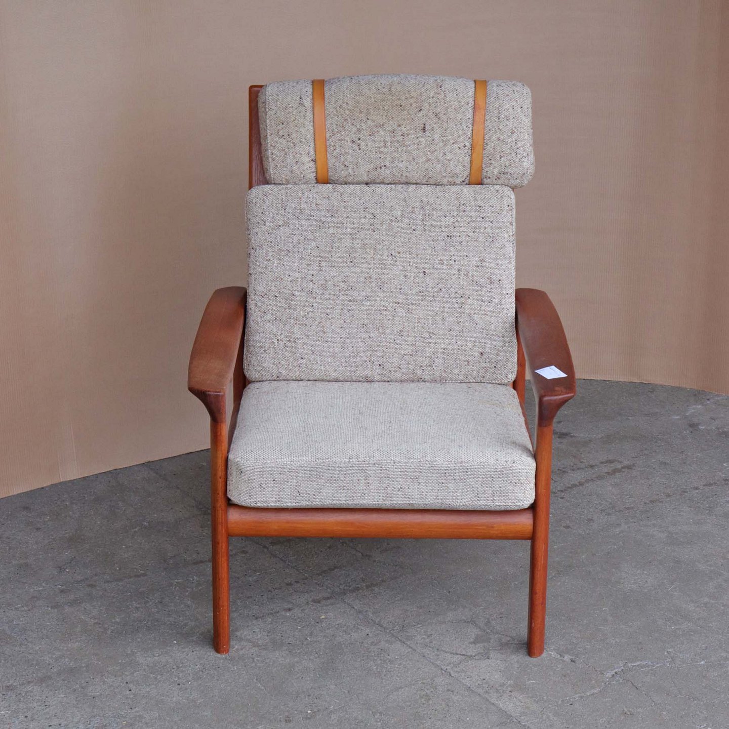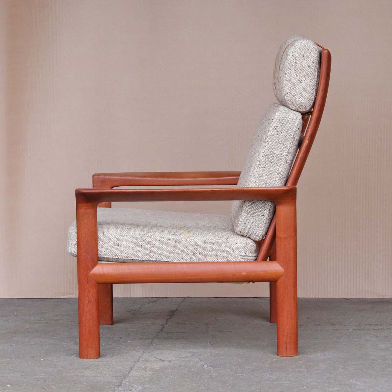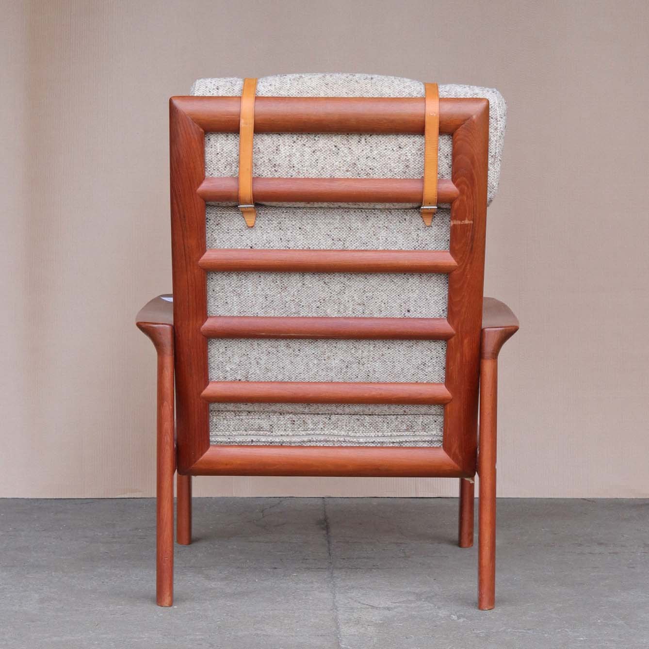 Højrygget lænestol fra 1970erne med stel i lakeret teaktræ og hynder med springfjeder. Hynderne er betrukket med lyst meleret uldstof og nakkepuden holdes på plads af remme i lyst kernelæder