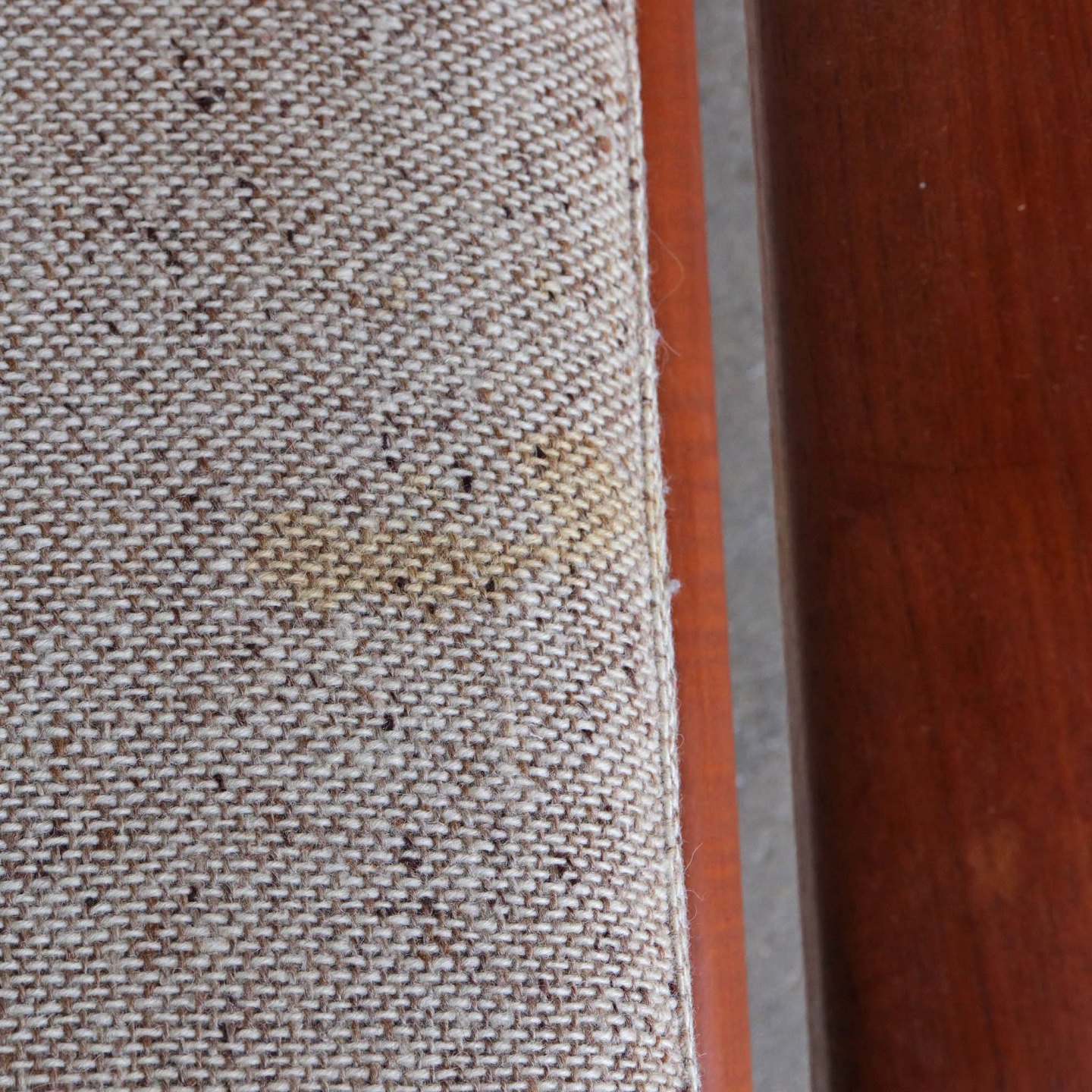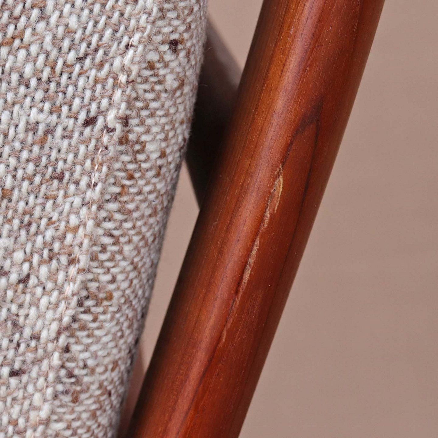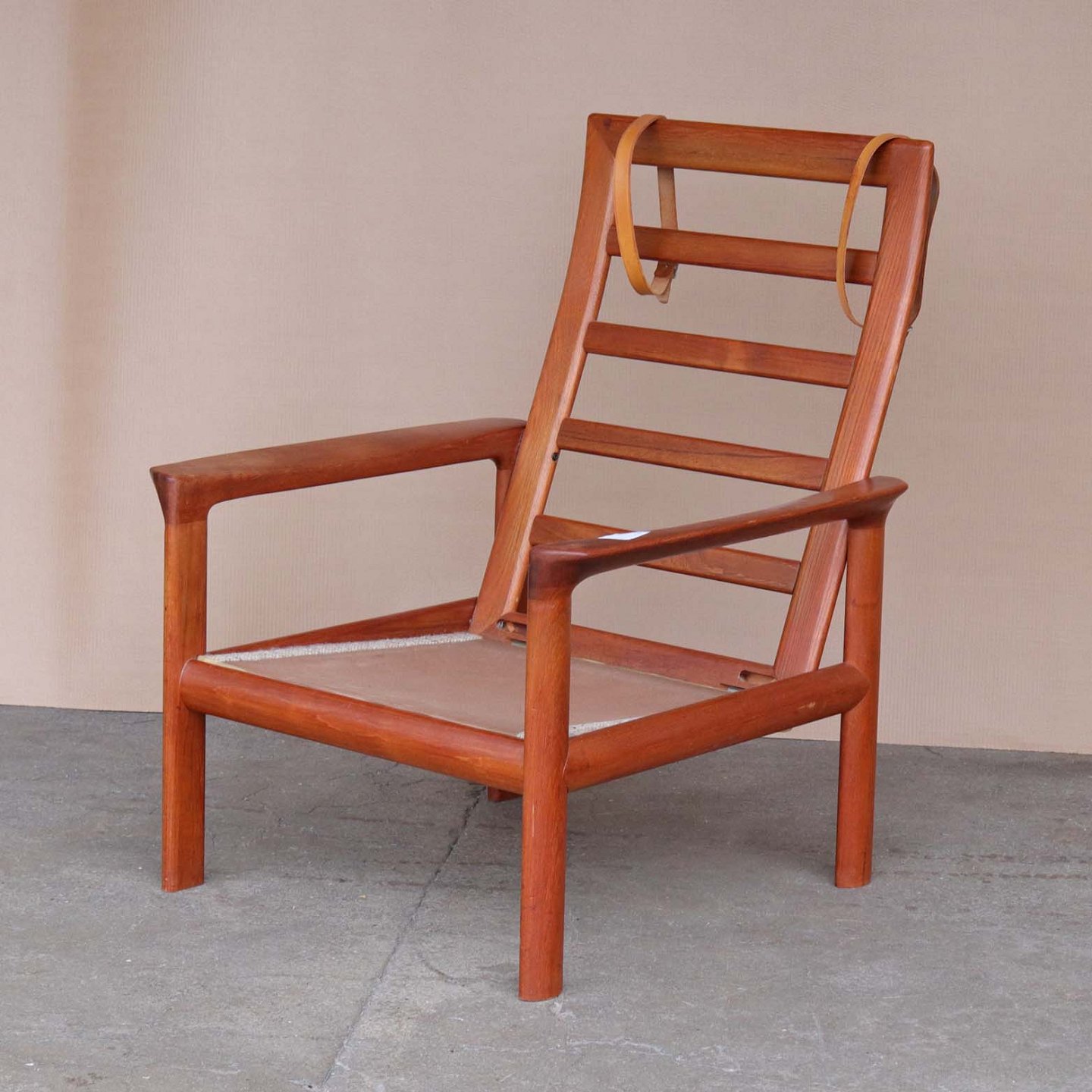 Højrygget lænestol fra 1970erne med stel i lakeret teaktræ og hynder med springfjeder. Hynderne er betrukket med lyst meleret uldstof og nakkepuden holdes på plads af remme i lyst kernelæder