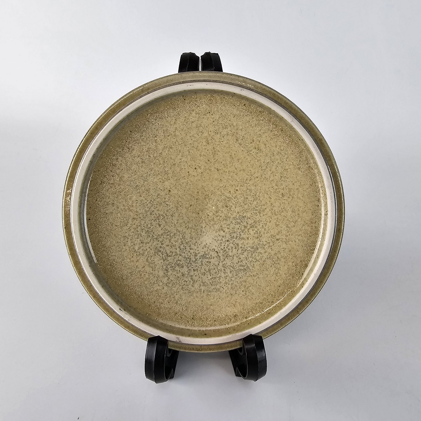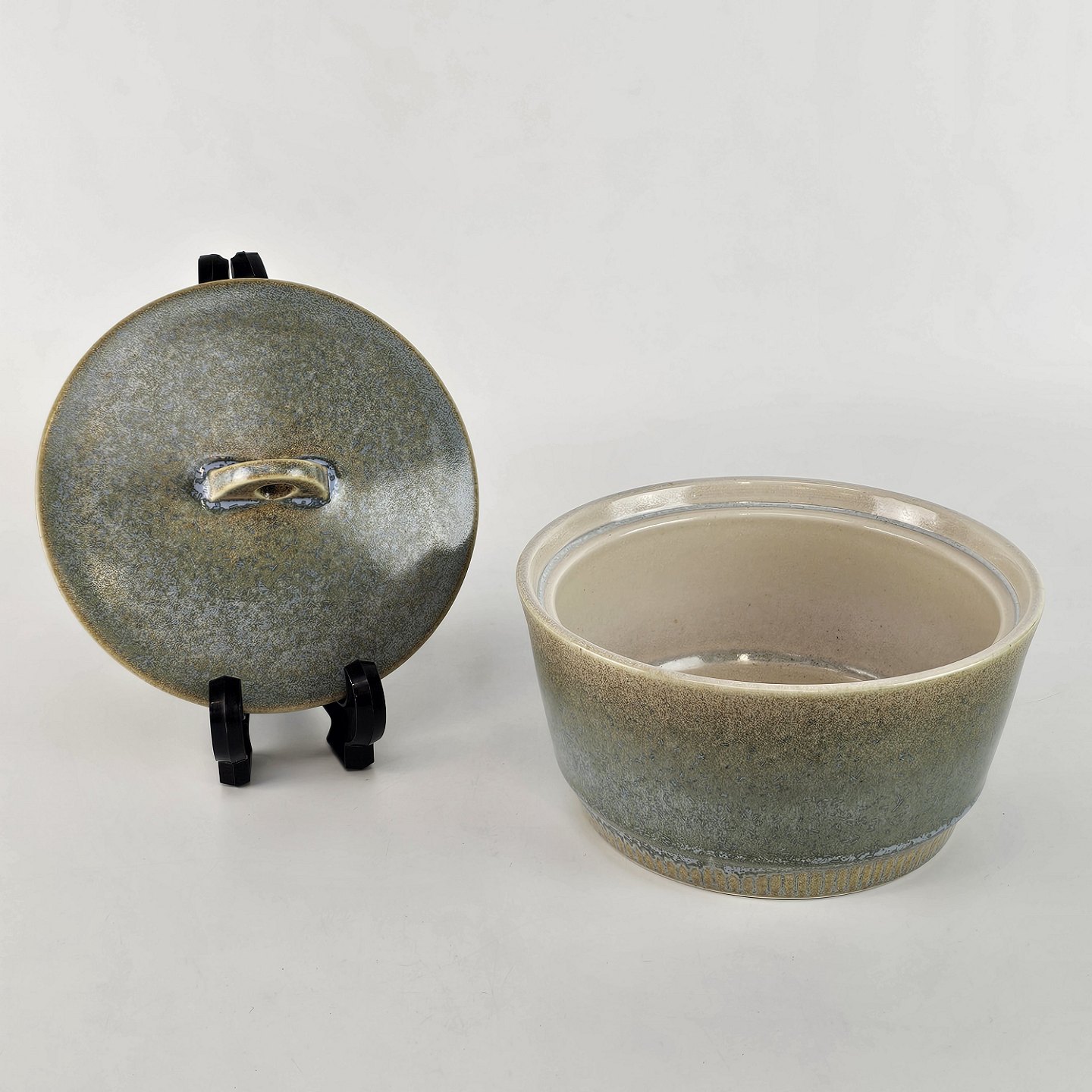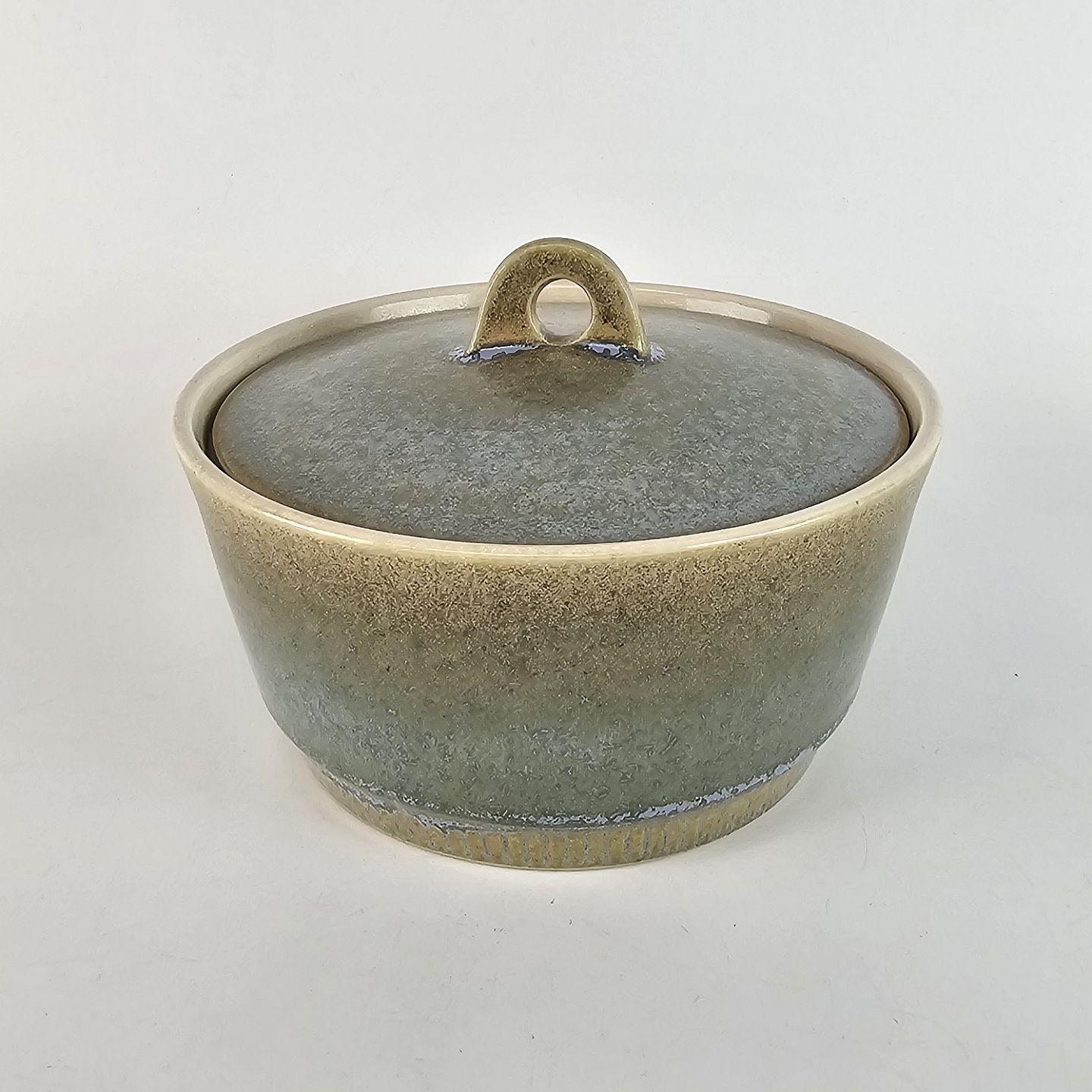 Skål med låg af stentøj og dekoreret med en grønlig nuance glasering.