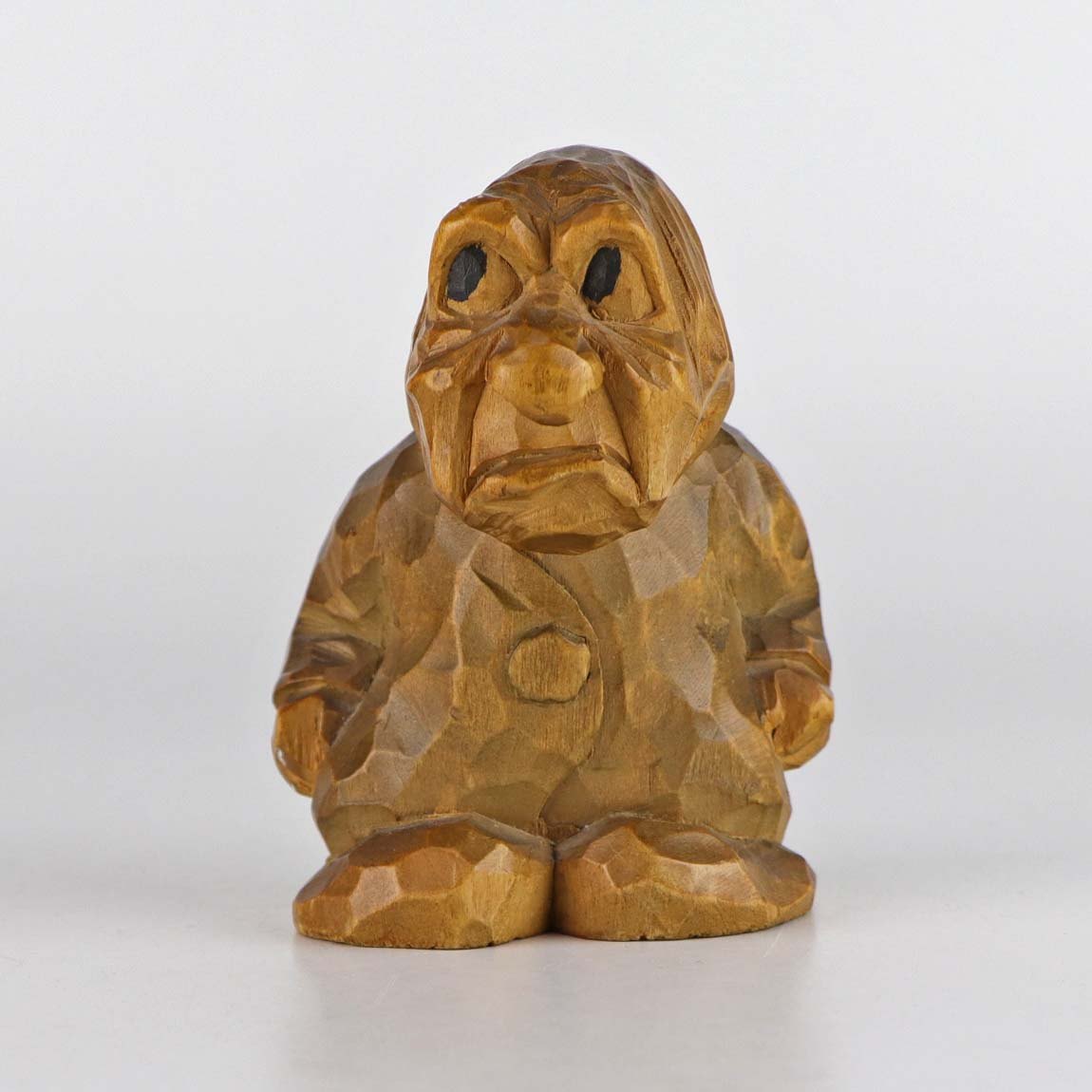 Håndsnittet figur i træ med motiv af ældre mand med stor næse og et gnavent ansigtsudtryk