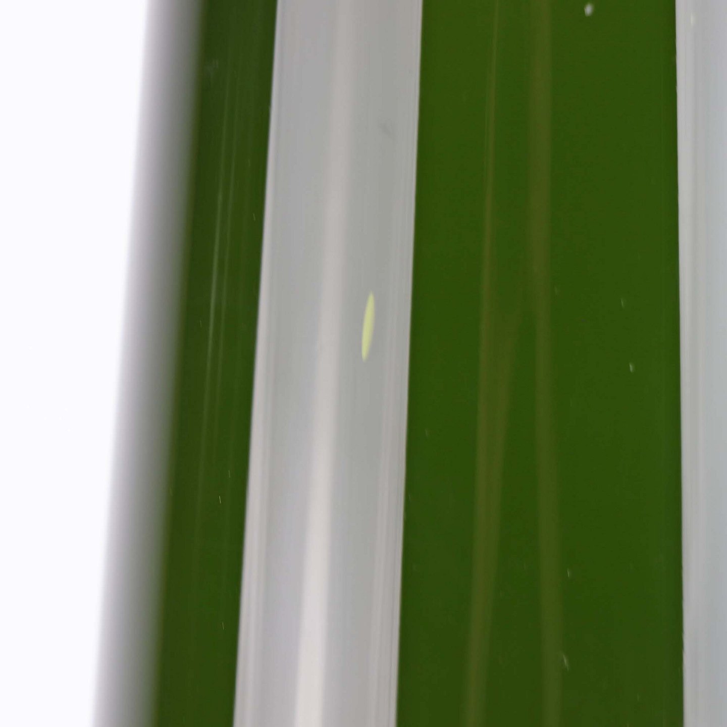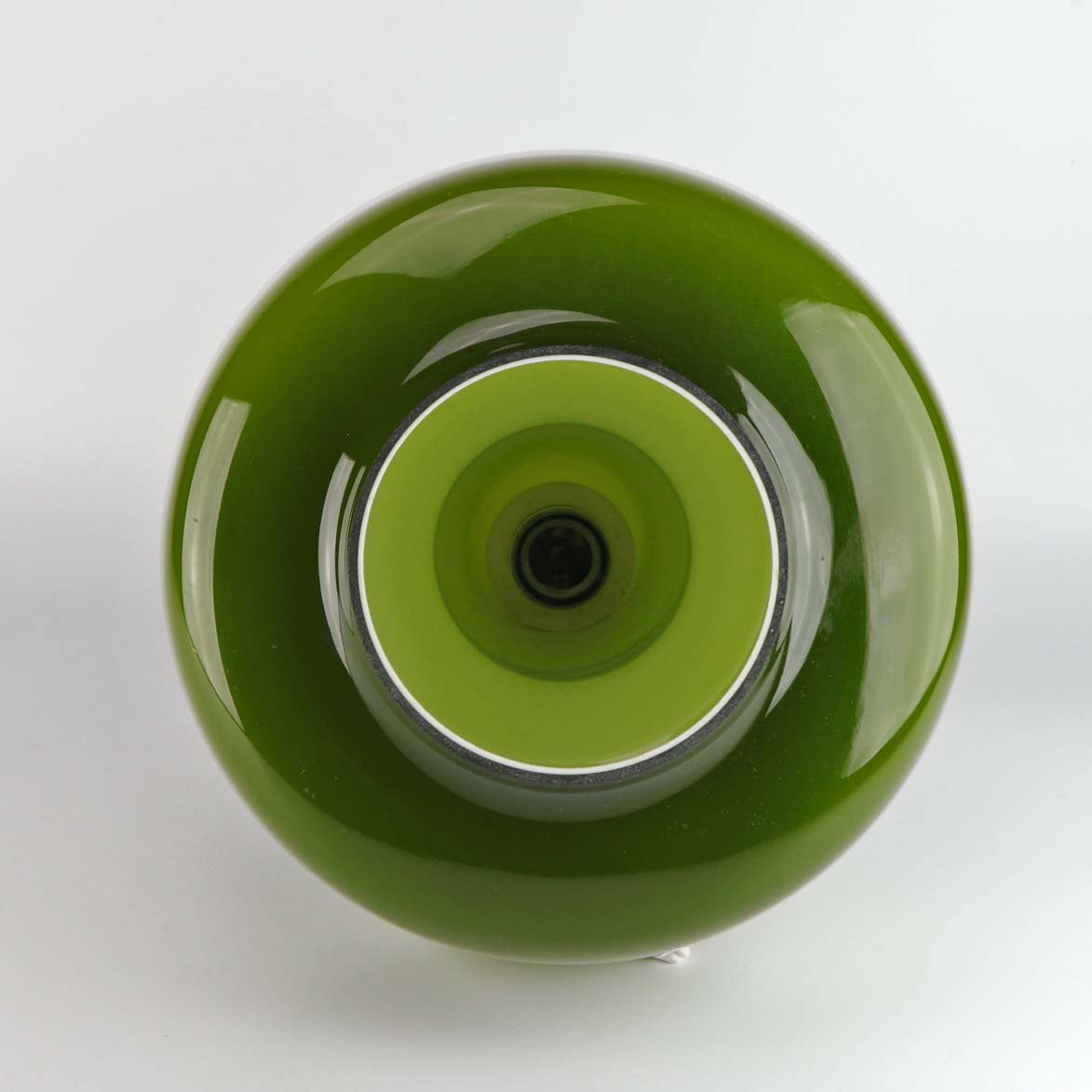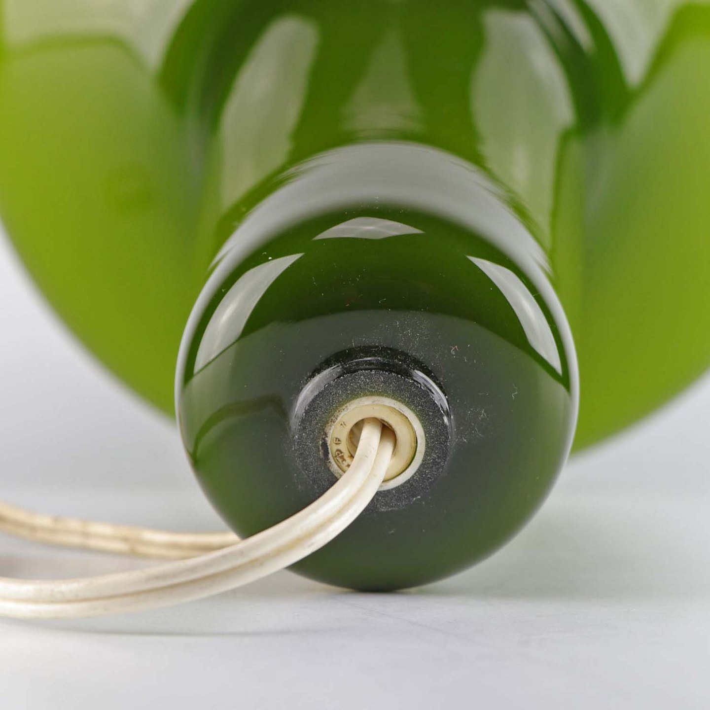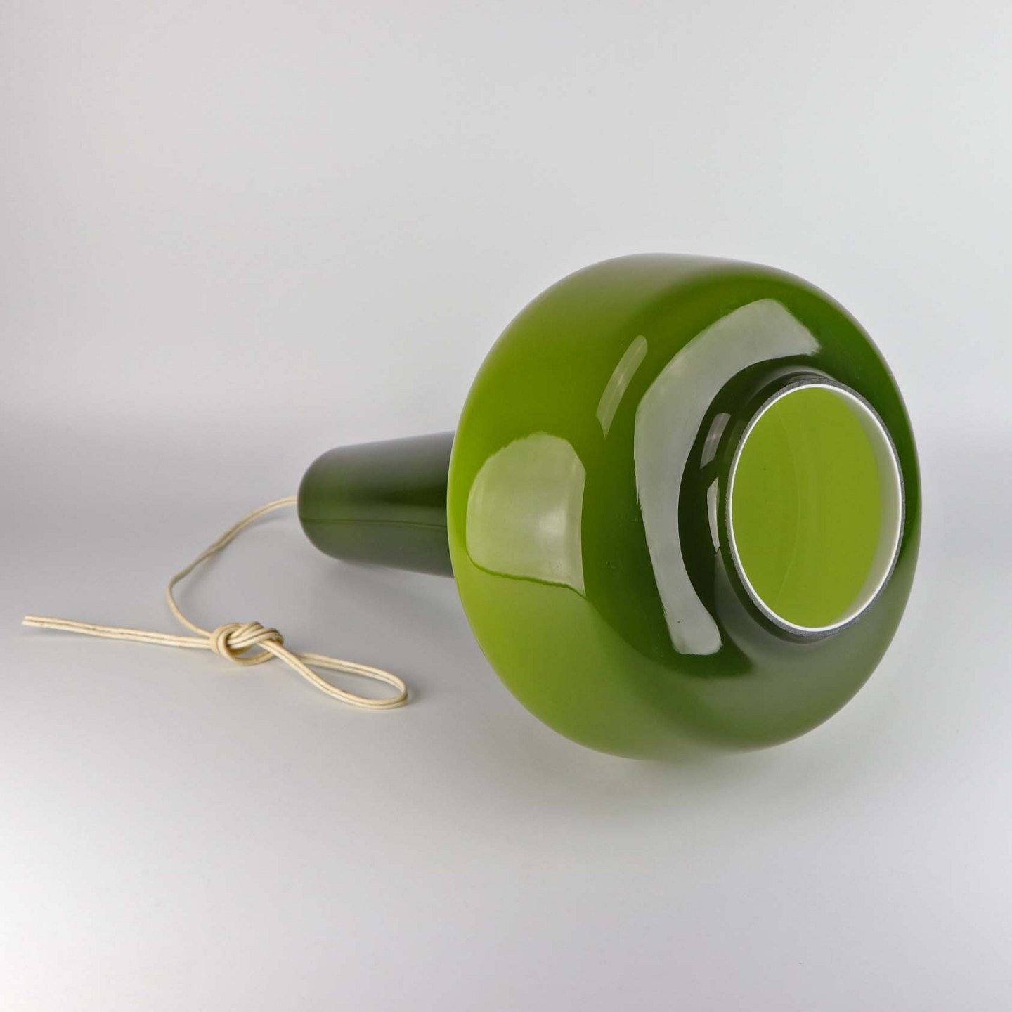 Pendel i olivengrøn glas med opal hvid inderside. Model Kreta. Modellen er med slebet kant, senere model fra Holmegaard er med glat kant. Se evt gl. Annonce med lampe fra Holmegaard.