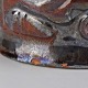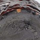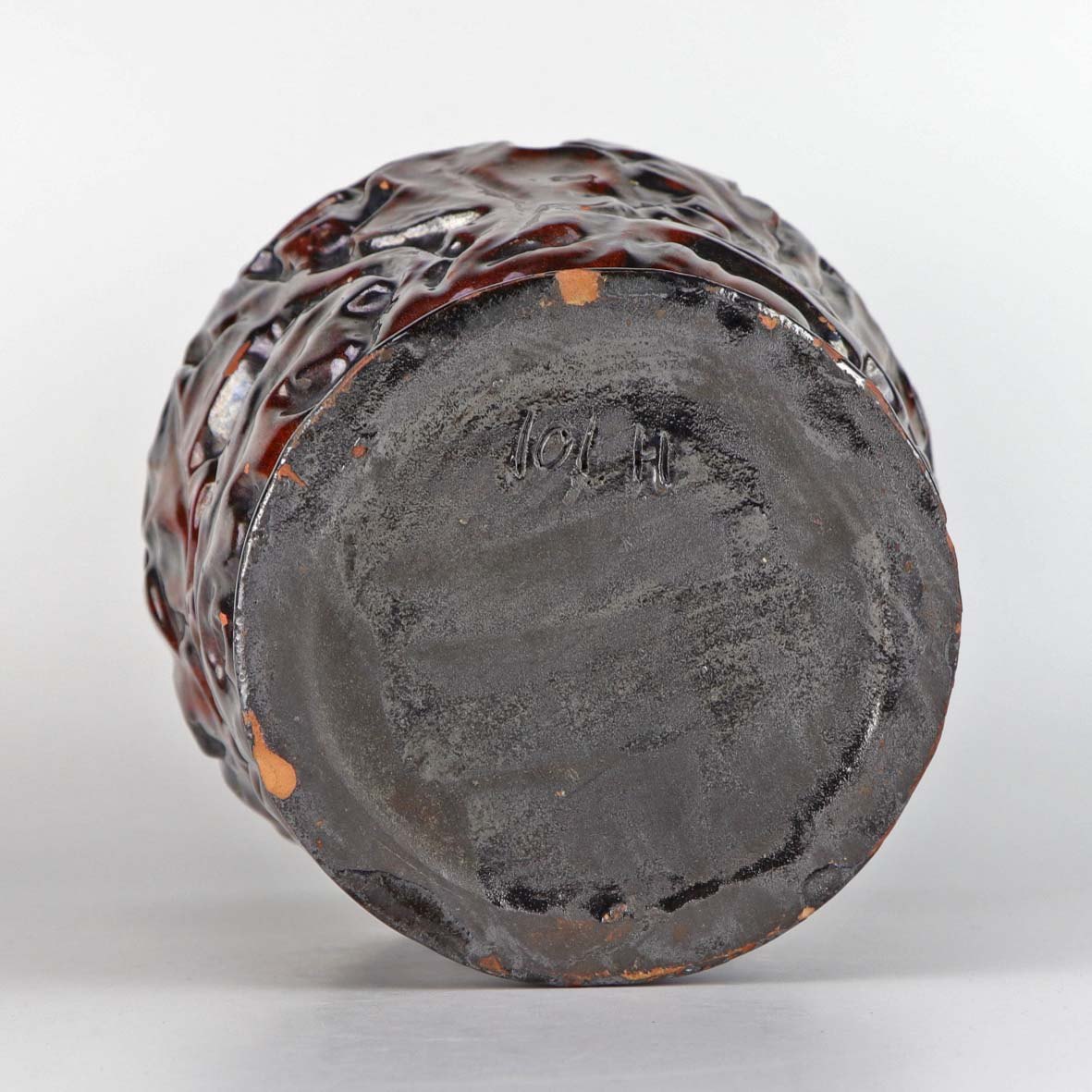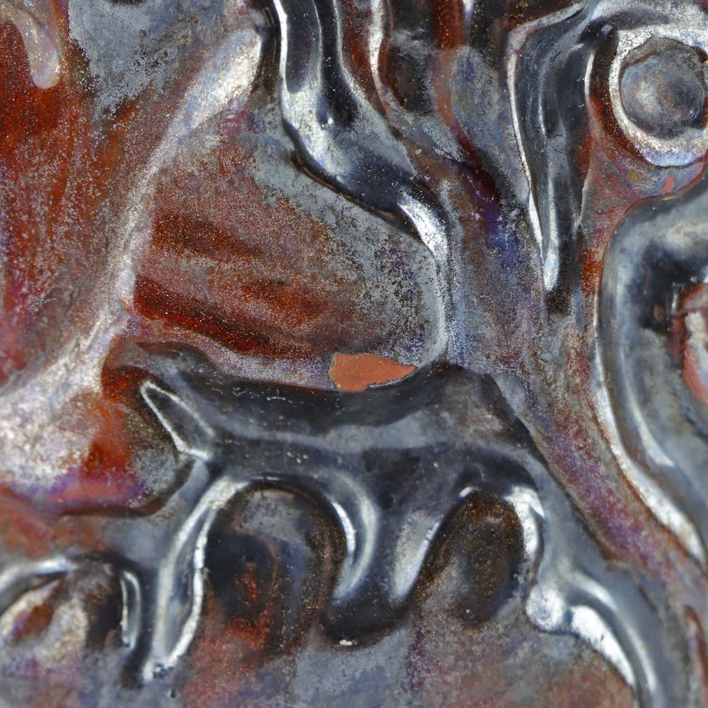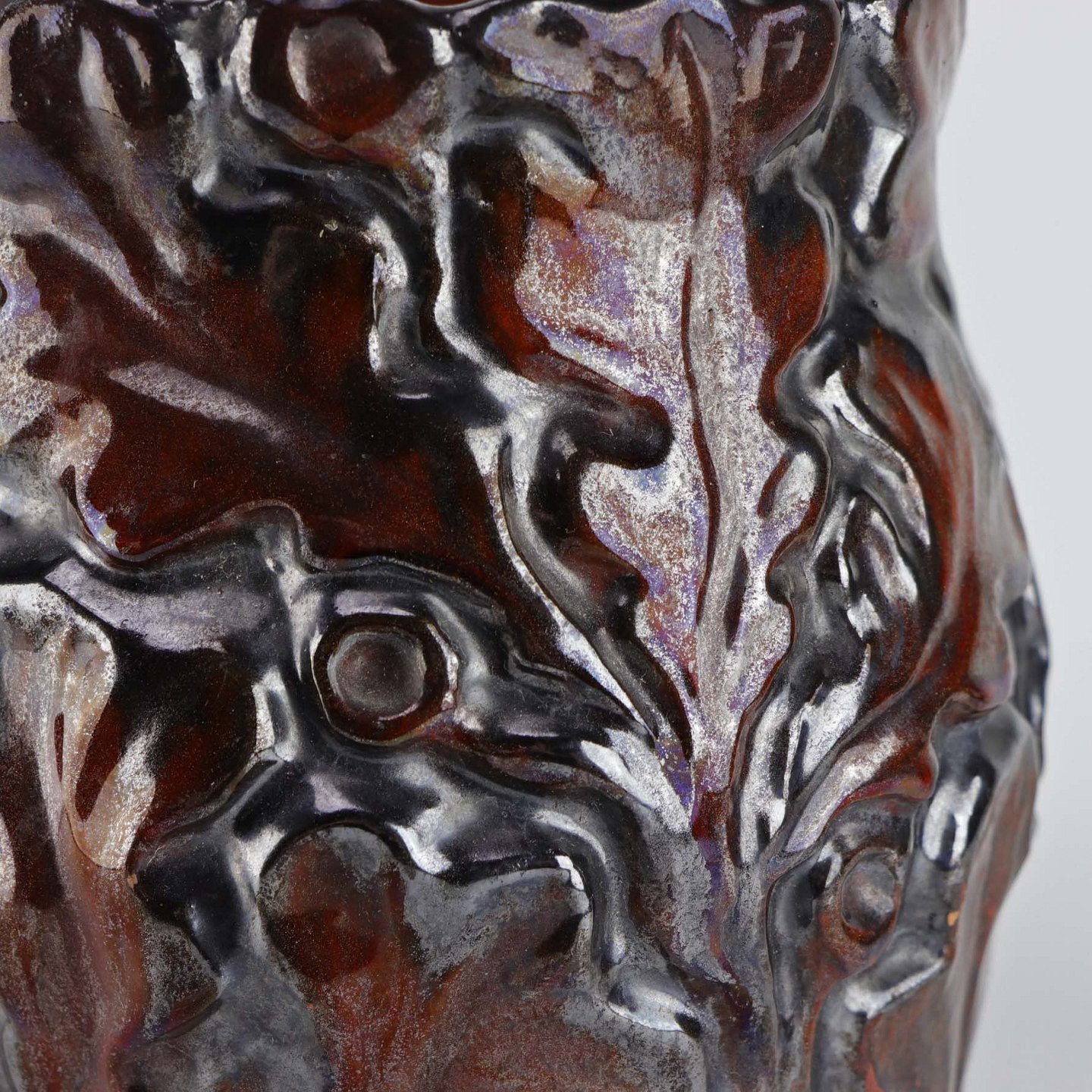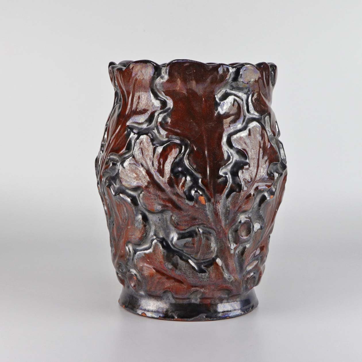 Vase i keramik med mørk glasur og metallisk glans. Den er dekoreret med motiver af egetræsblade.